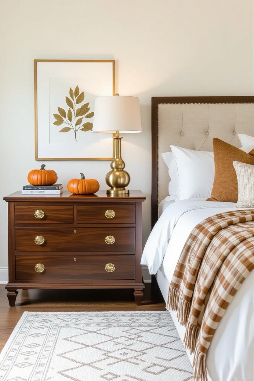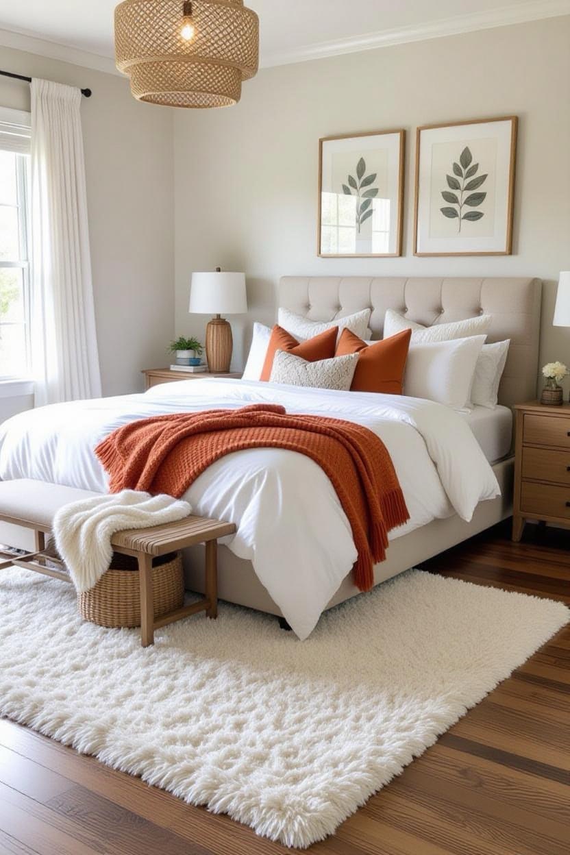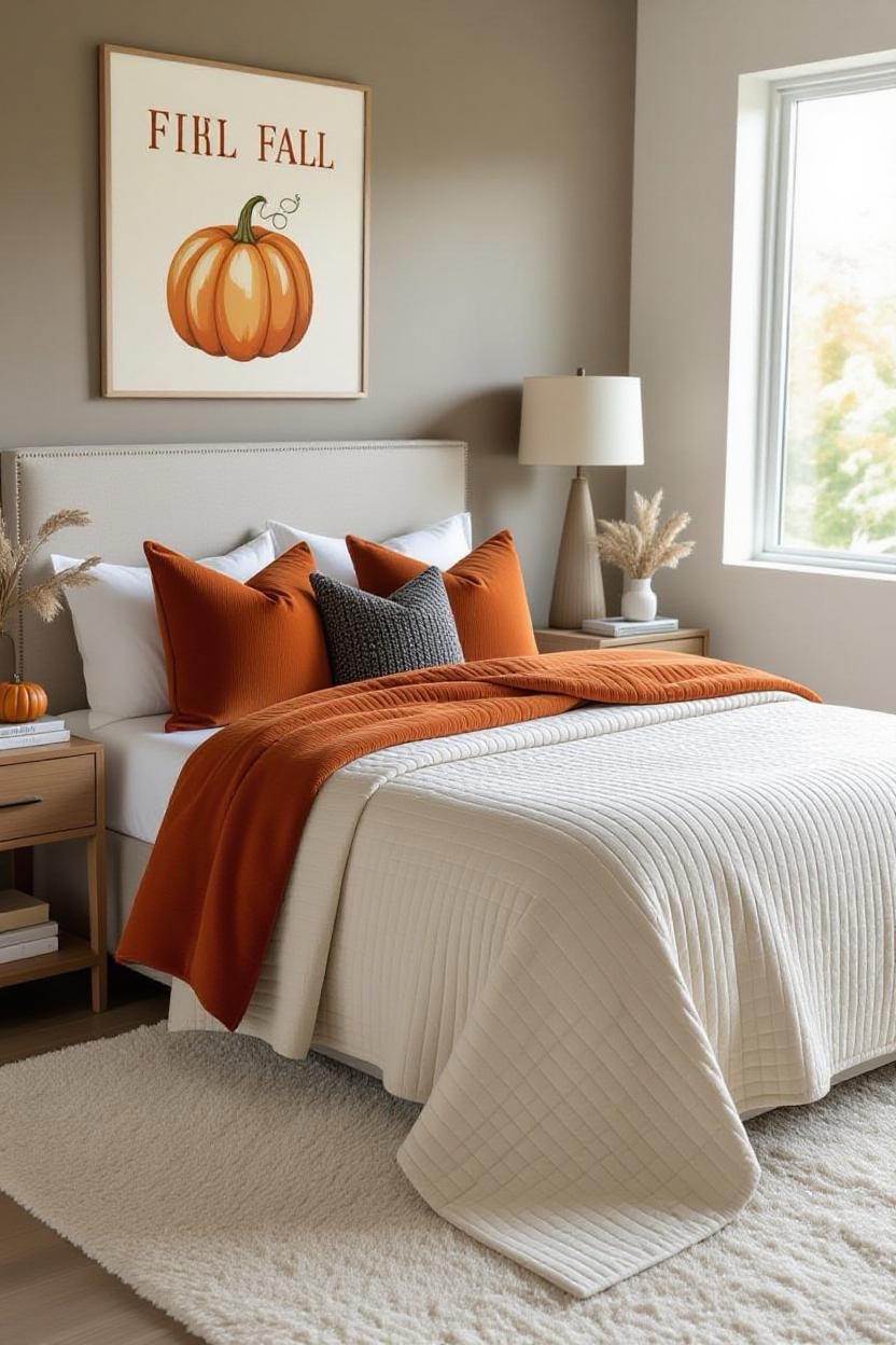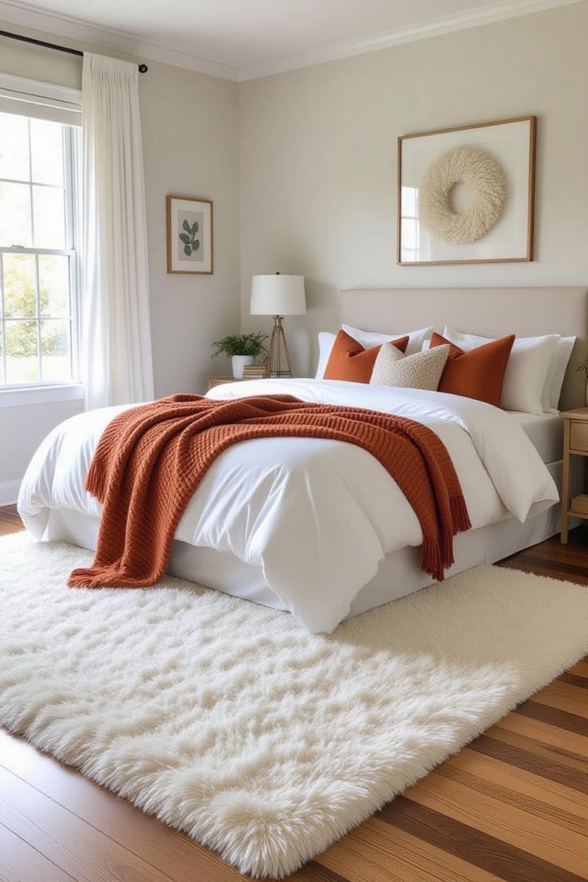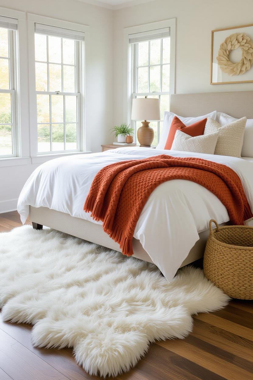 Add a fluffy or woven area rug under your bed or beside it. It softens hardwood floors and helps keep toes warm on chilly mornings while elevating your fall décor theme.