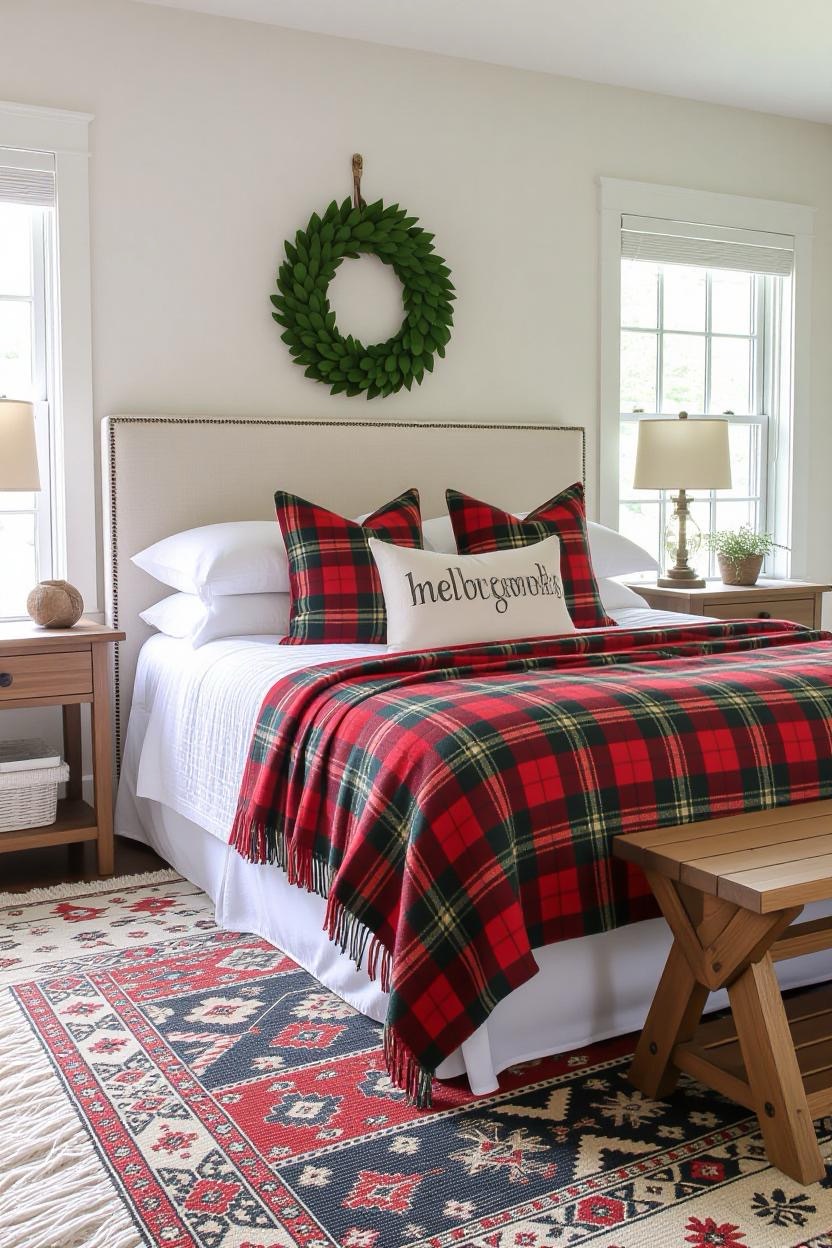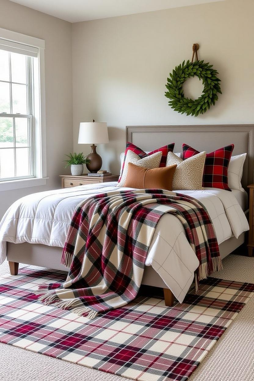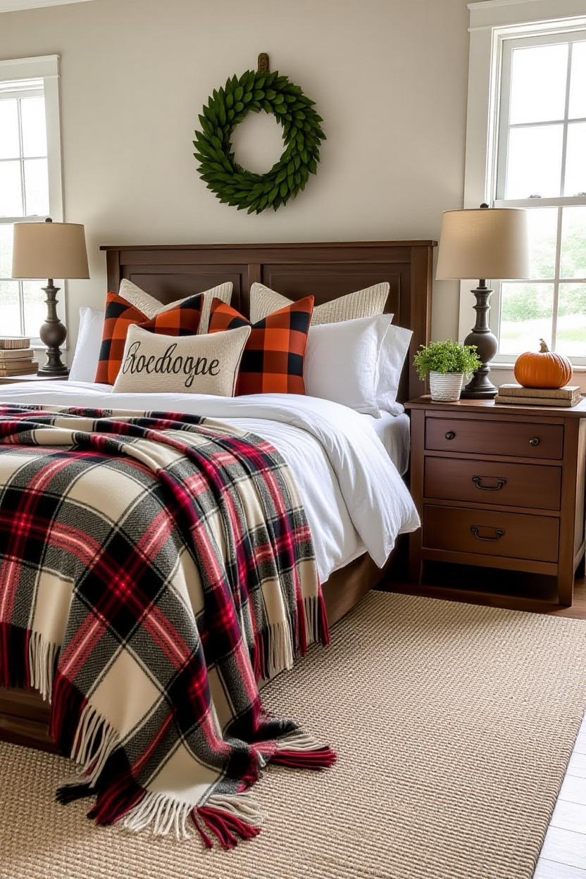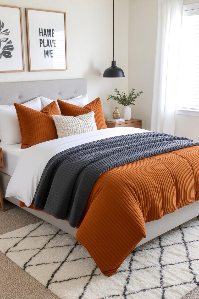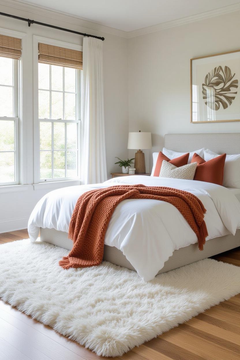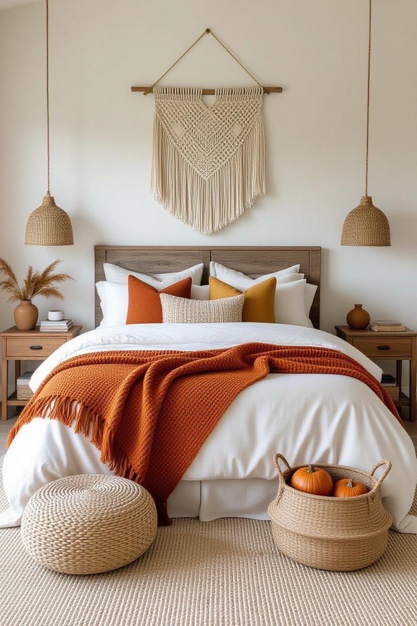 Add a fluffy or woven area rug under your bed or beside it. It softens hardwood floors and helps keep toes warm on chilly mornings while elevating your fall décor theme.