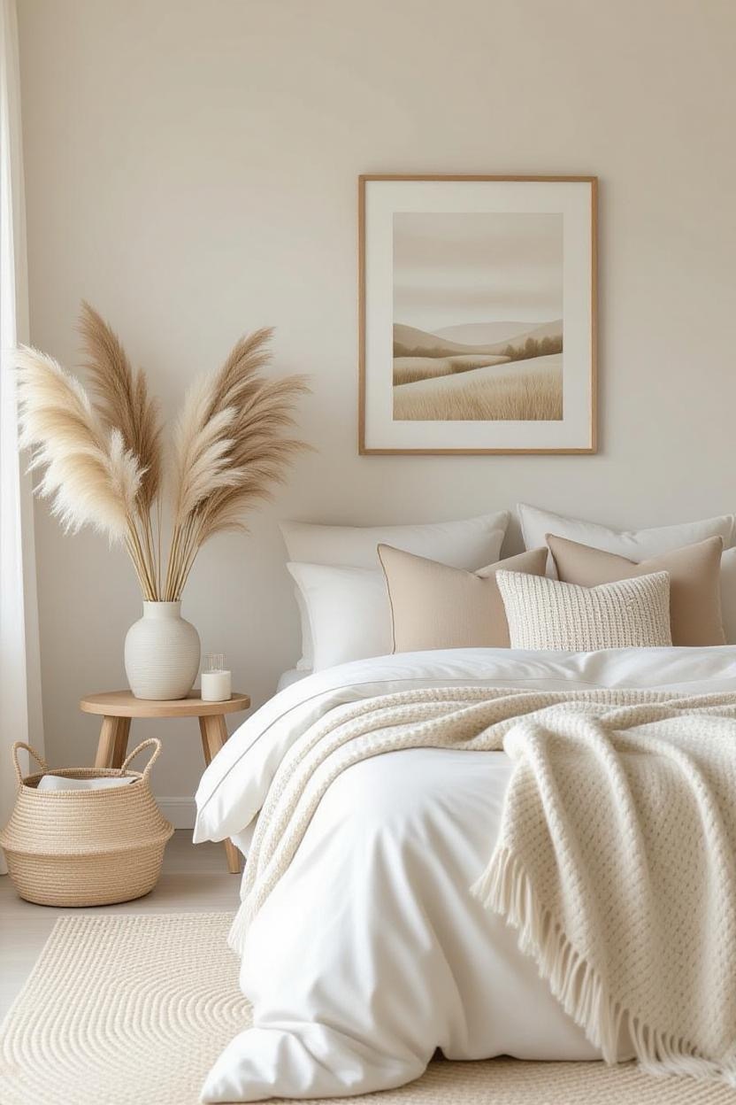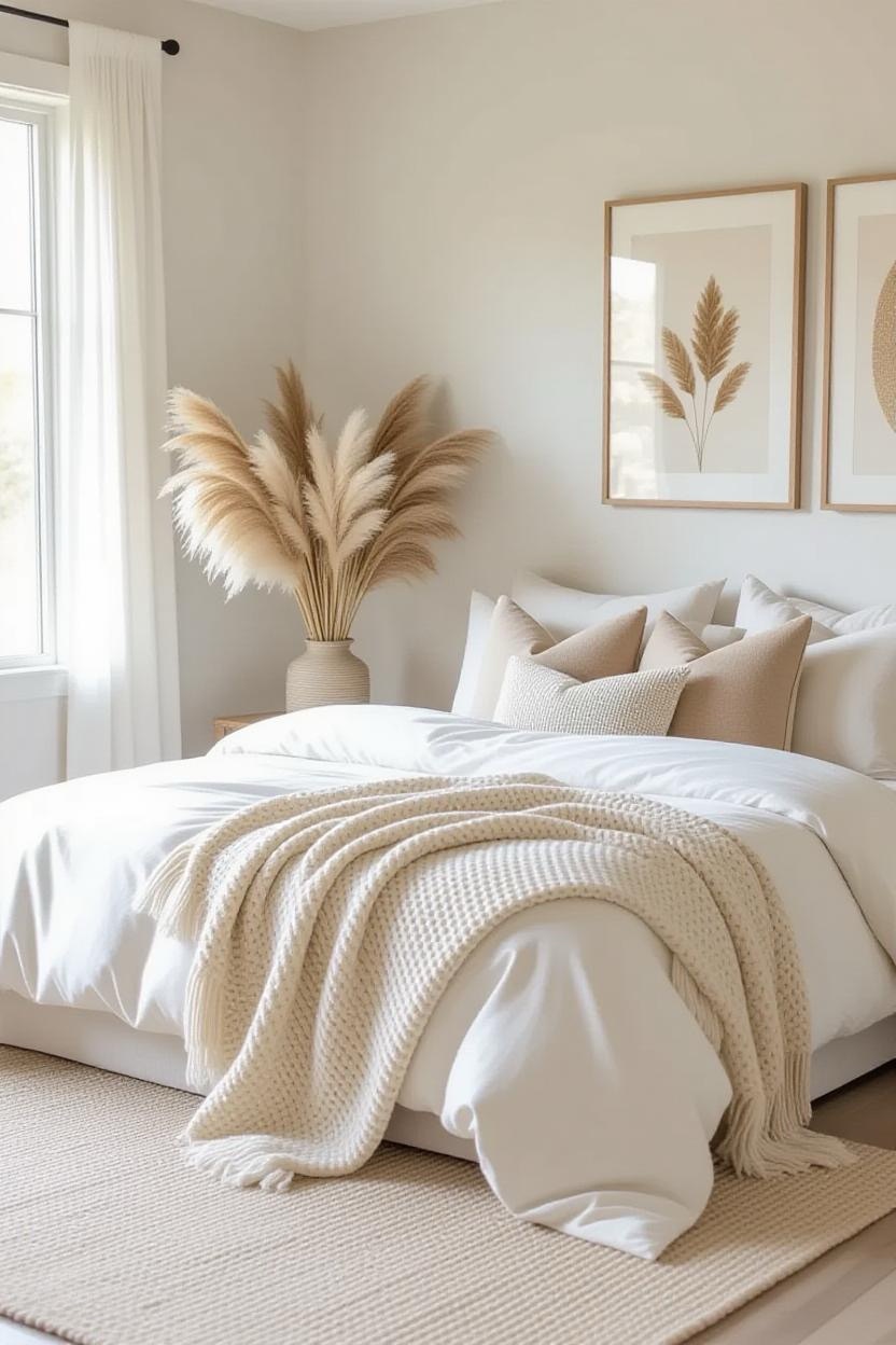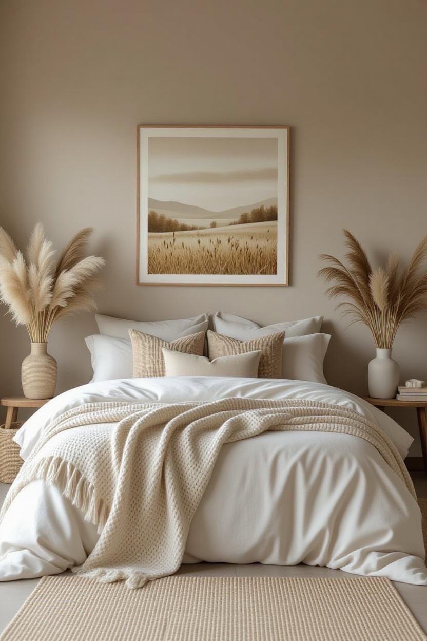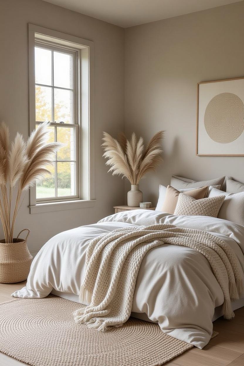 Replace fresh summer blooms with dried flowers like pampas grass, lavender, or wheat stalks. These add texture and a neutral, autumnal vibe perfect for your fall bedroom retreat.