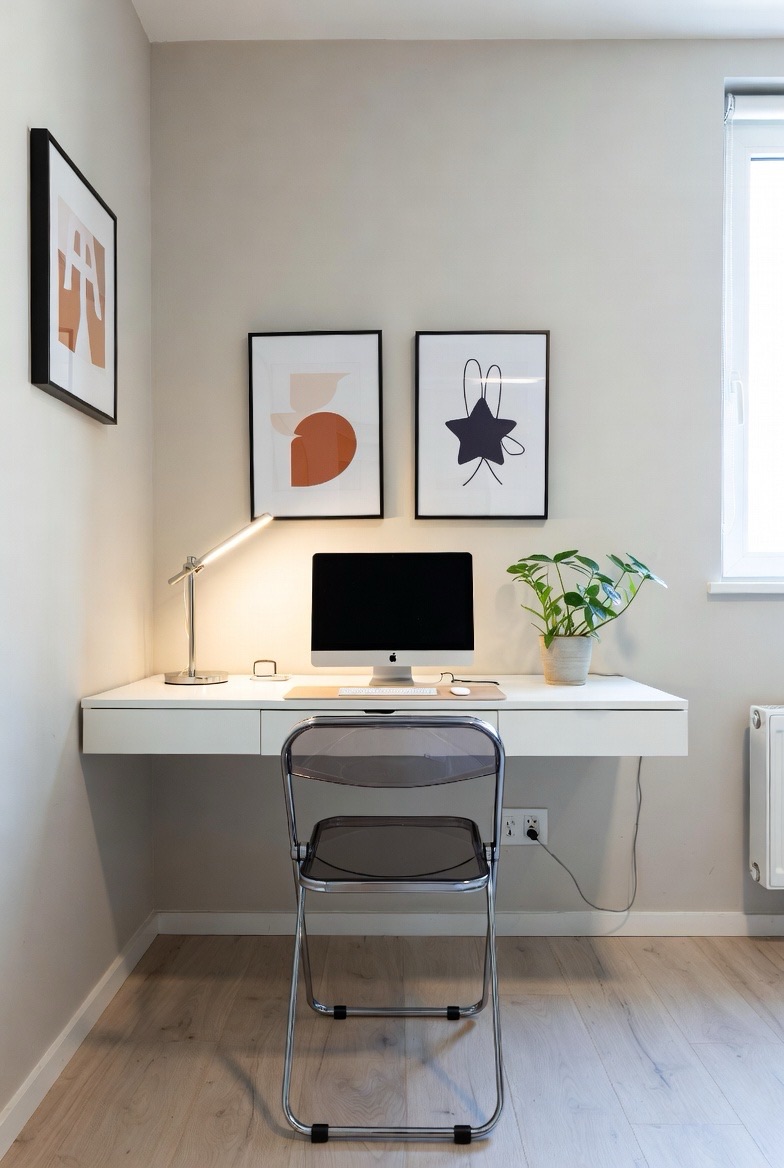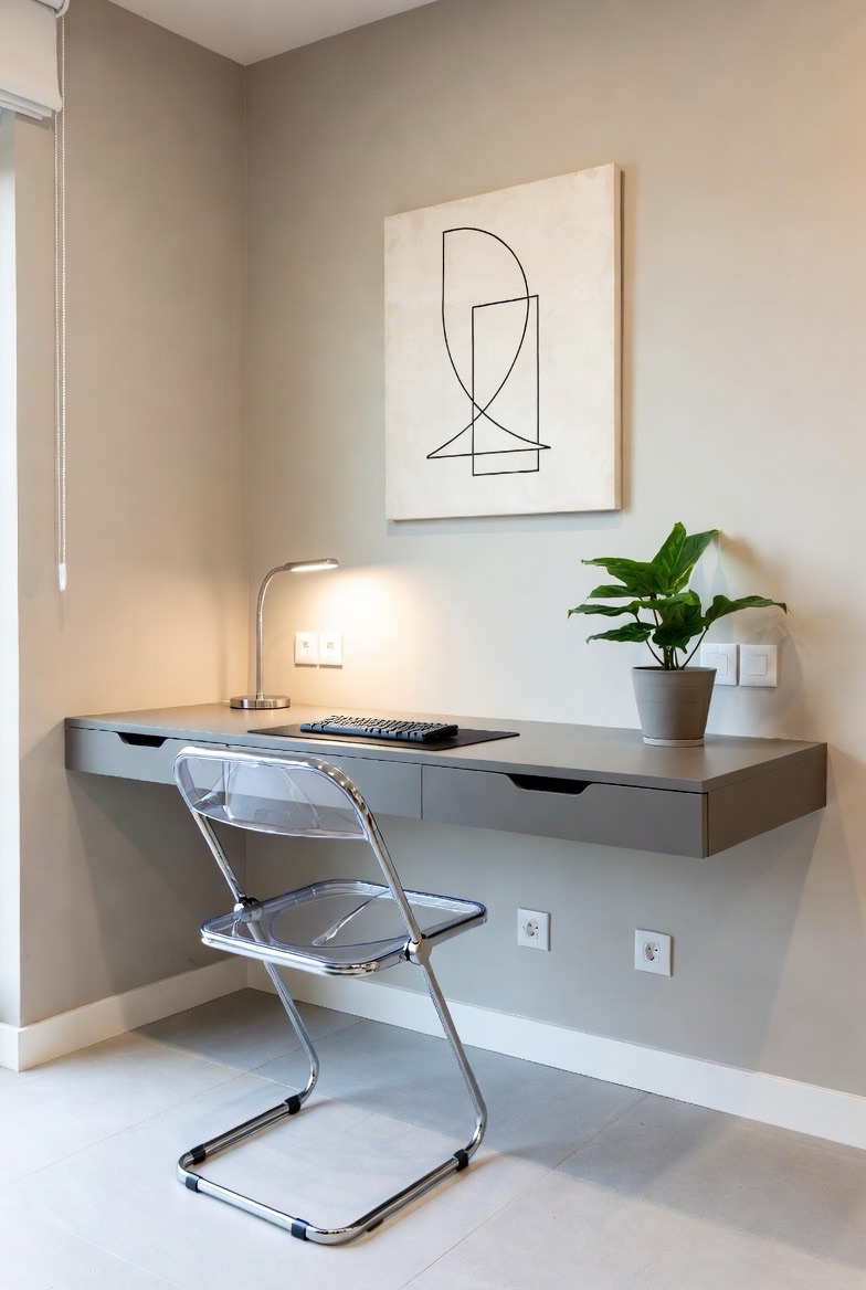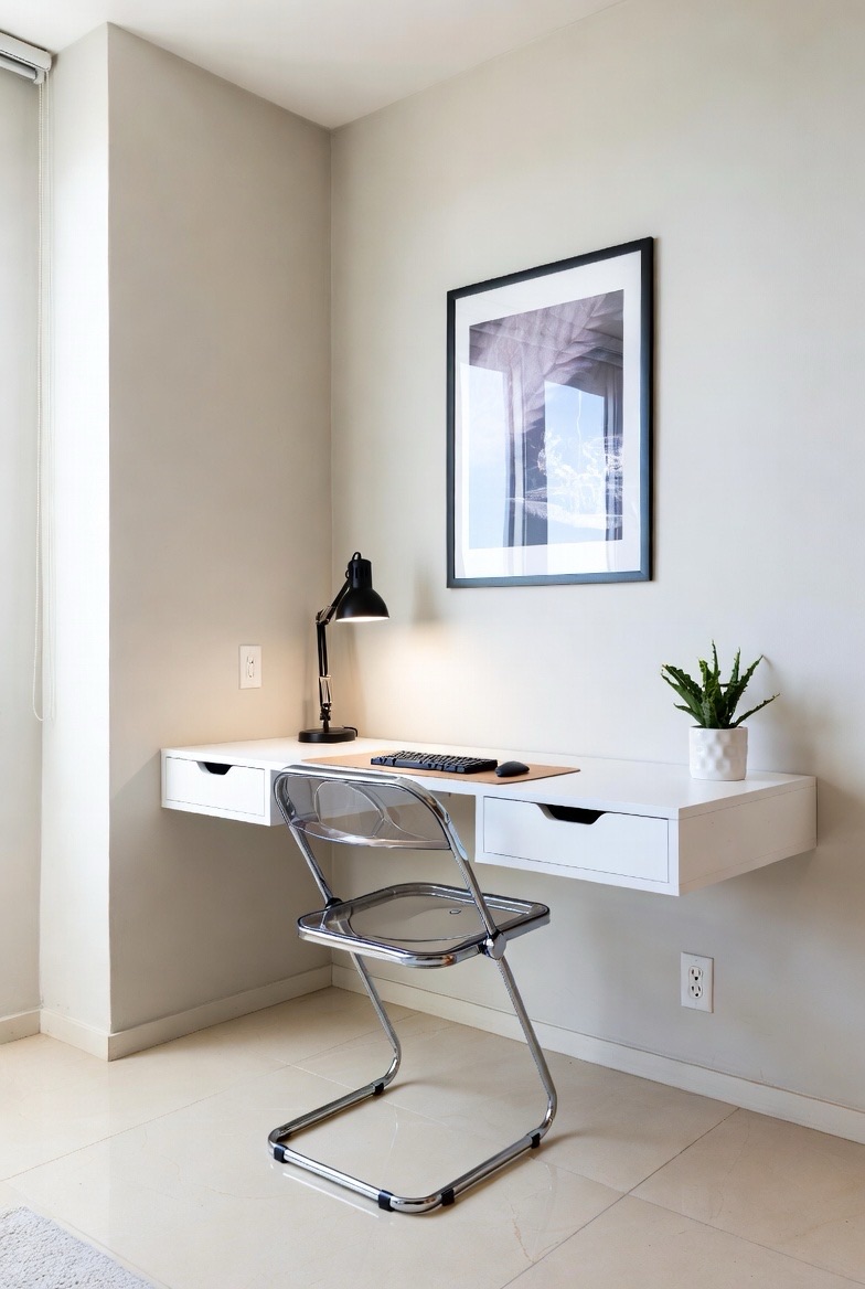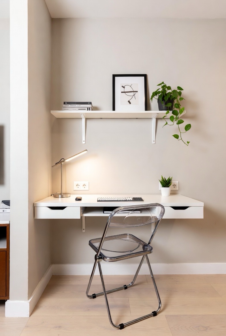 A floating desk maximizes limited floor space, install it along a narrow wall to create a streamlined work zone. Pair it with a foldable or acrylic chair to keep the space visually light. Add a small task lamp, a potted plant, and chic wall art for personality. This modern setup is perfect for tiny apartments, dorms, or multipurpose rooms.