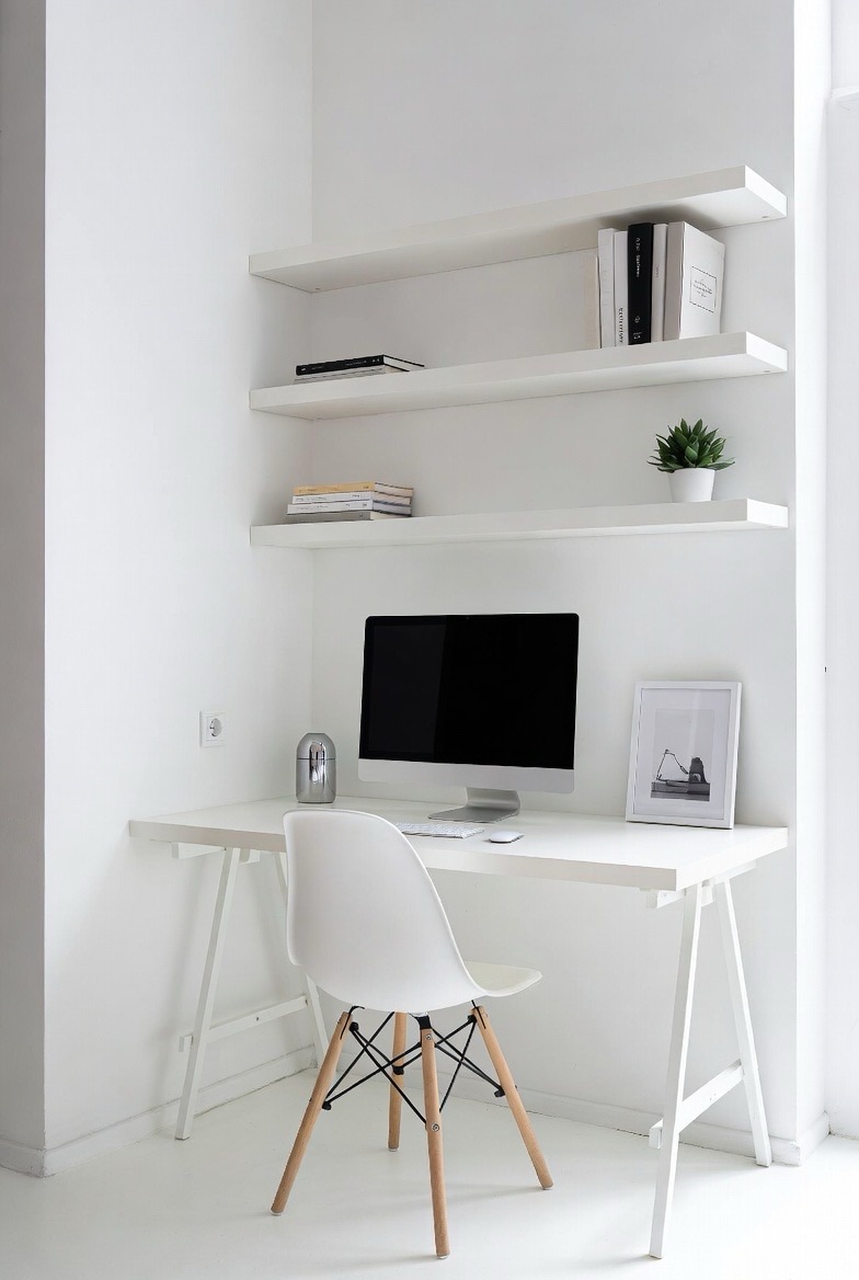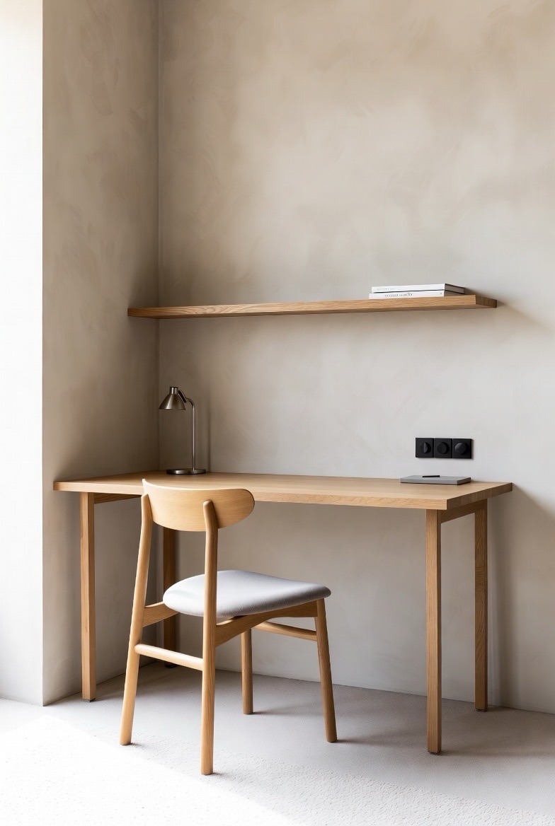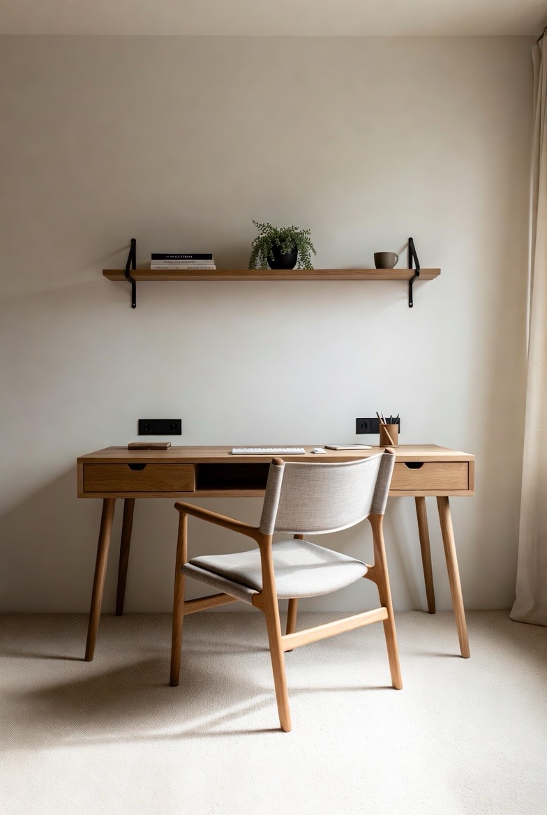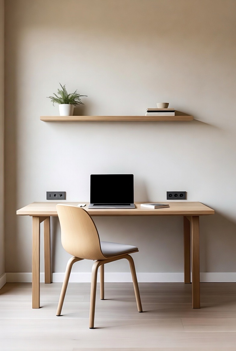 A floating desk maximizes limited floor space, install it along a narrow wall to create a streamlined work zone. Pair it with a foldable or acrylic chair to keep the space visually light. Add a small task lamp, a potted plant, and chic wall art for personality. This modern setup is perfect for tiny apartments, dorms, or multipurpose rooms.