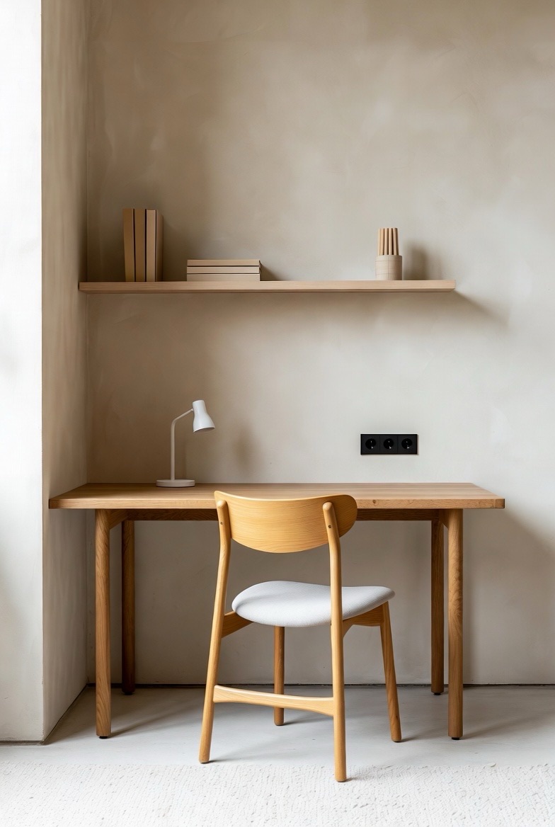 A clean, minimalist desk setup instantly elevates a small office, pair a sleek wooden desk with a lightweight chair to keep the area open and airy. Add a single floating shelf for décor or essentials, keeping clutter out of sight. Soft neutral tones and slim desk accessories help maintain focus and reduce visual stress, making this small corner feel like a polished workspace.