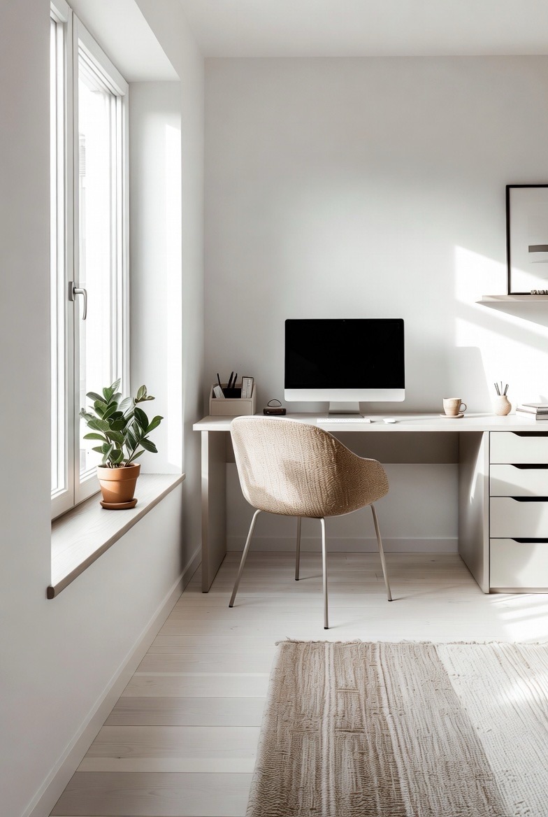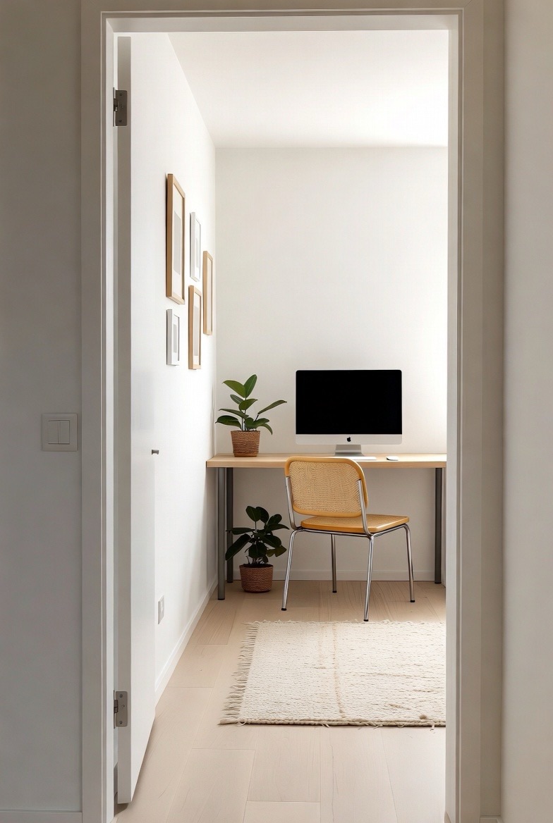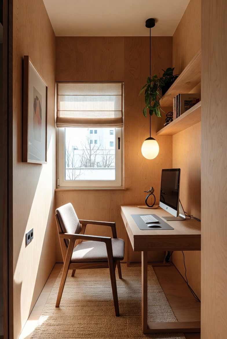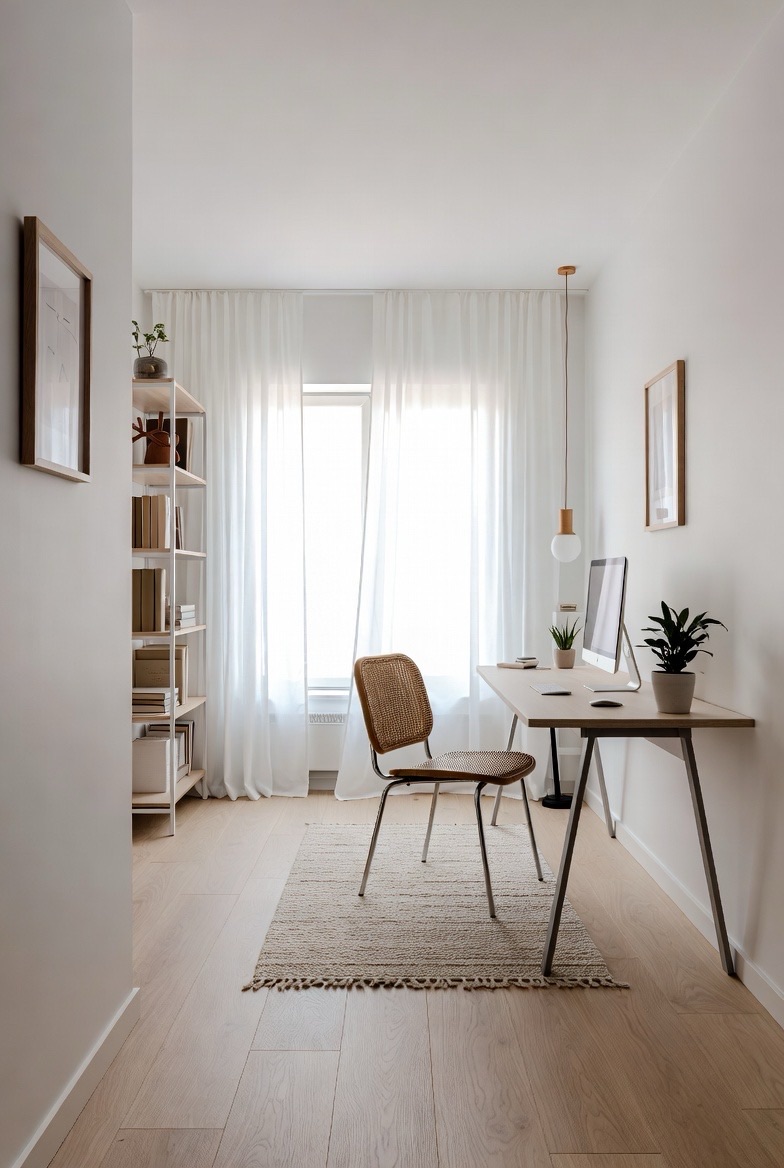 Scandinavian design shines in small offices, light wood, white walls, and soft textures create a calm, modern feel. Choose a slim desk and wicker or fabric chair for comfort. Add greenery, a cozy rug, and minimal décor for balance. This style blends function and beauty, making it ideal for stress-free productivity.
