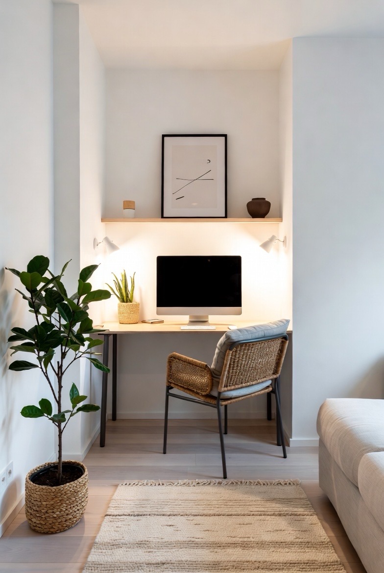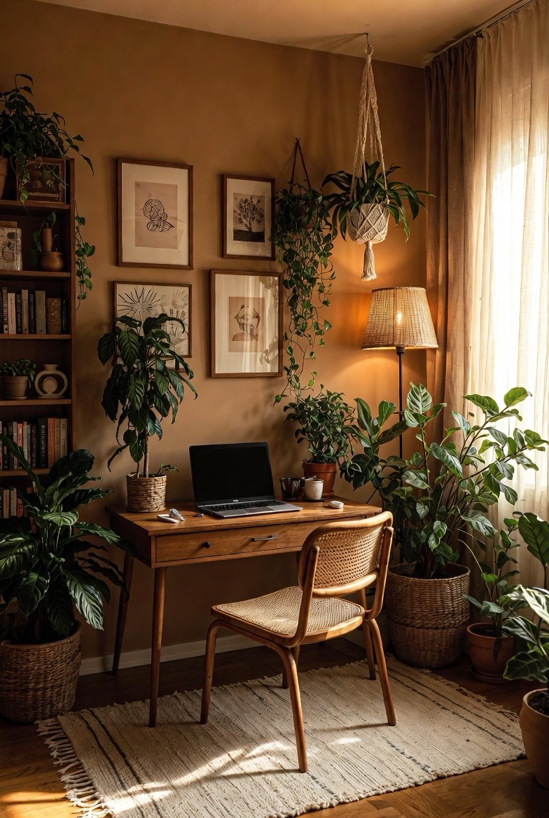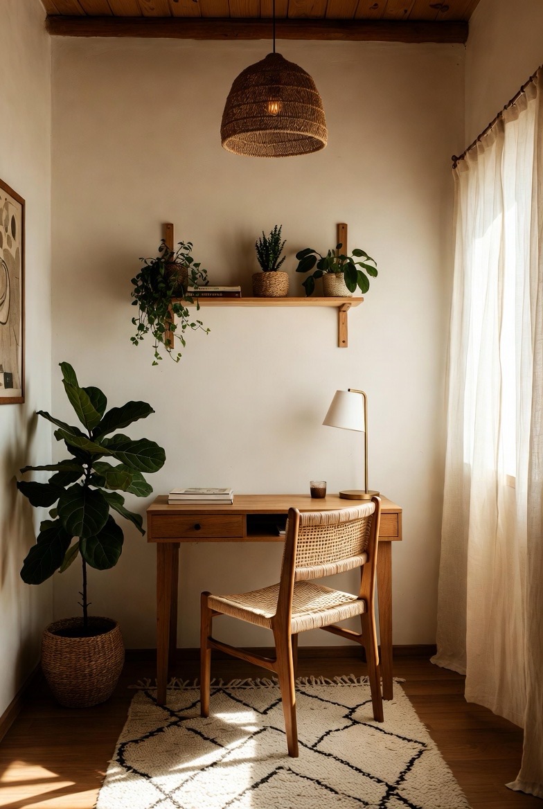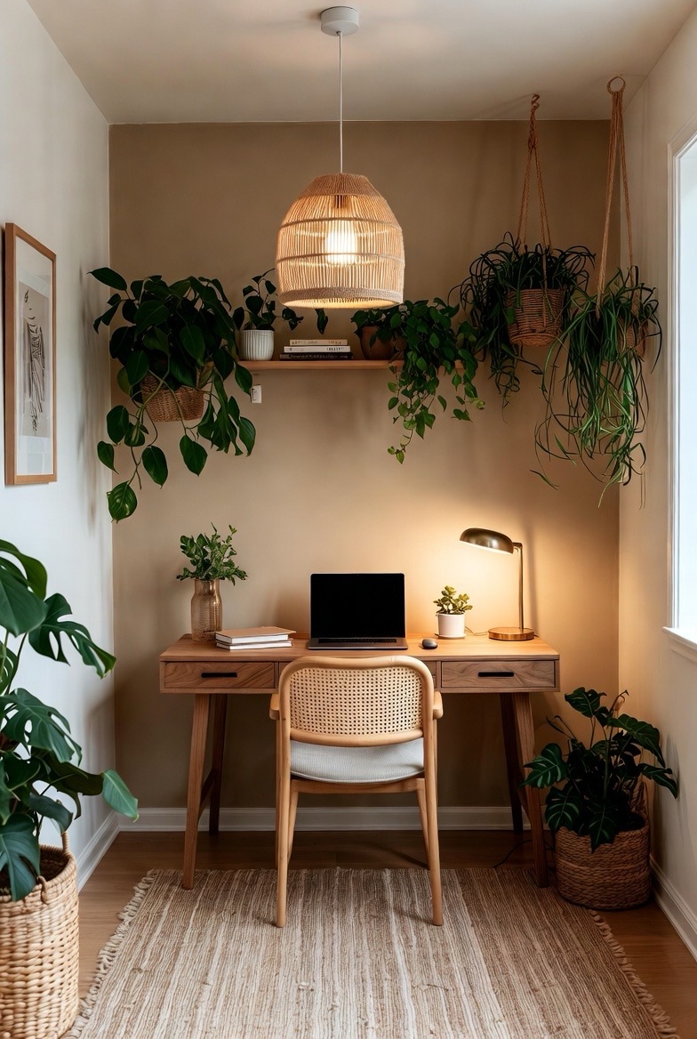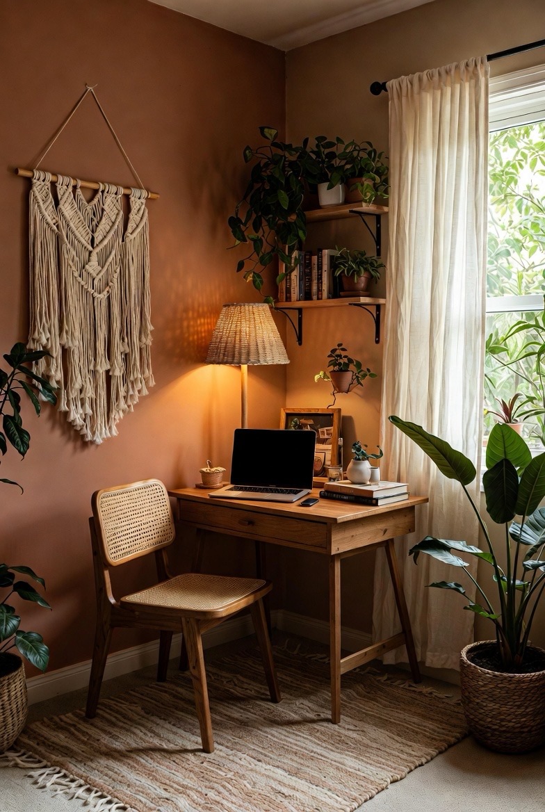 For a warm, relaxed small office, add boho accents like rattan furniture, woven textures, and indoor plants. A small wooden desk, textured rug, and ambient lighting complete the look. This style creates a cozy, inspiring workspace that feels like a retreat.