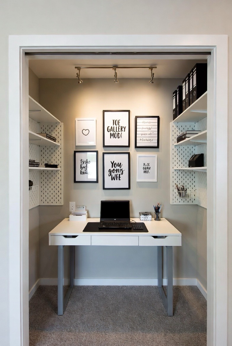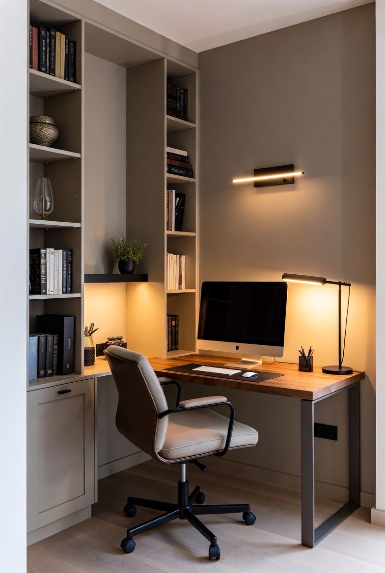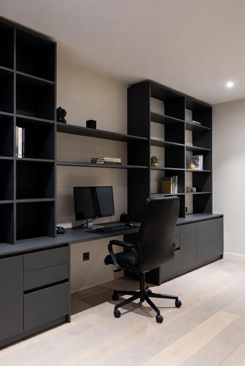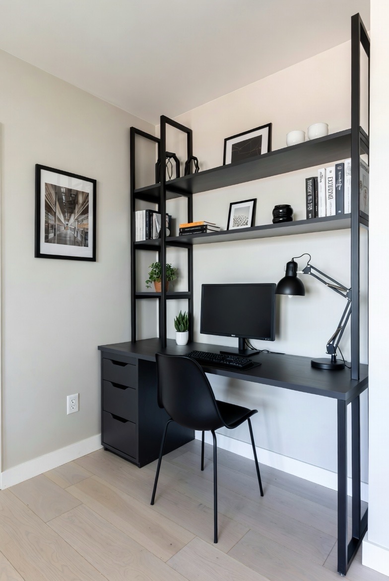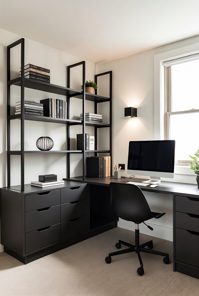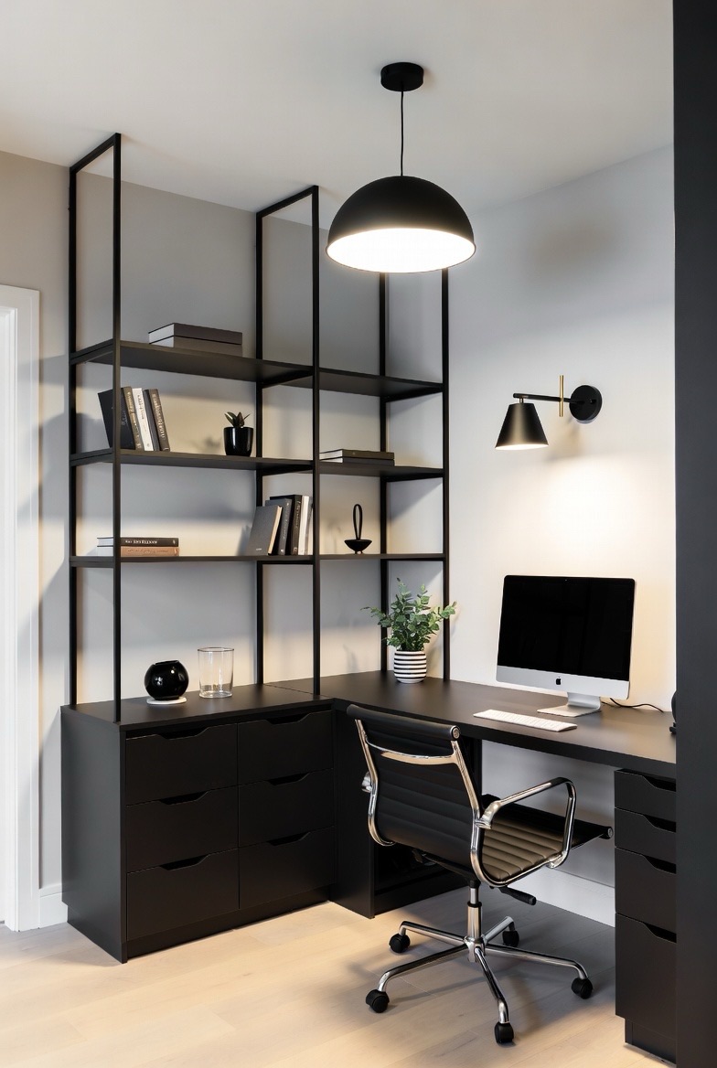 Create a sophisticated workspace with black accents, think black shelving, a dark desk, or matte fixtures. Pair with light walls for contrast. Keep décor minimal and opt for clean lines. This bold modern style works well even in tiny rooms.