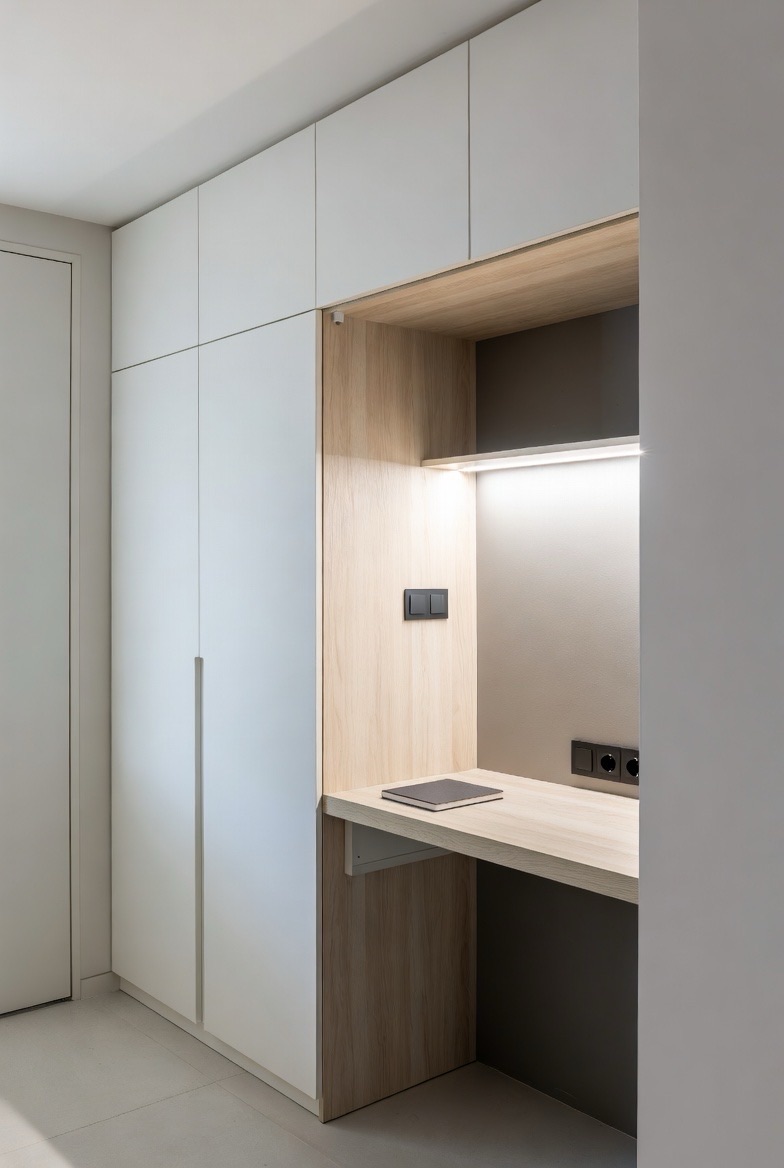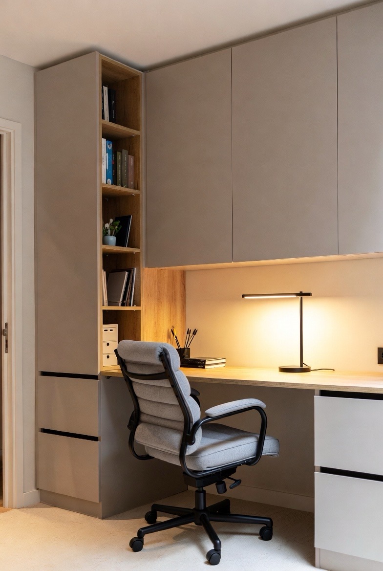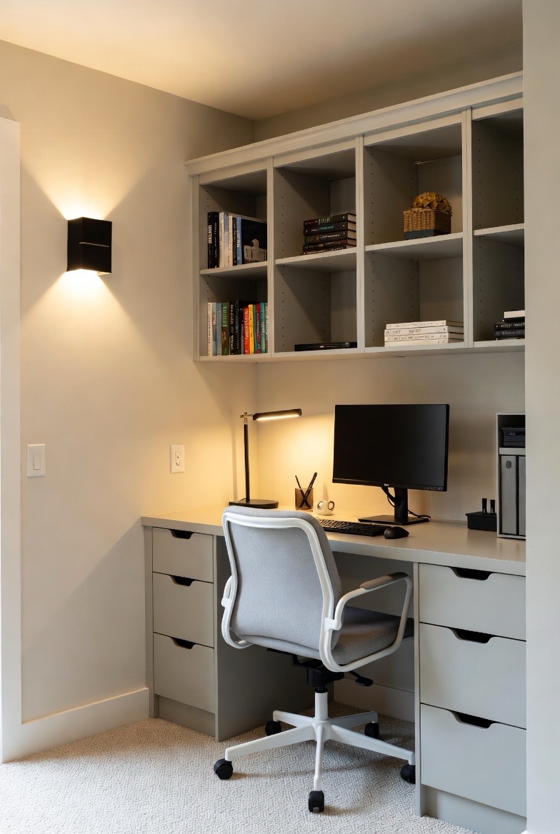 Turn an unused nook into a functional office with built-in shelving and a custom desk. Vertical storage keeps everything organized without overwhelming the room. Add warm lighting and a comfortable ergonomic chair to complete the look. This thoughtful layout makes even the smallest nook feel intentional and stylish.
