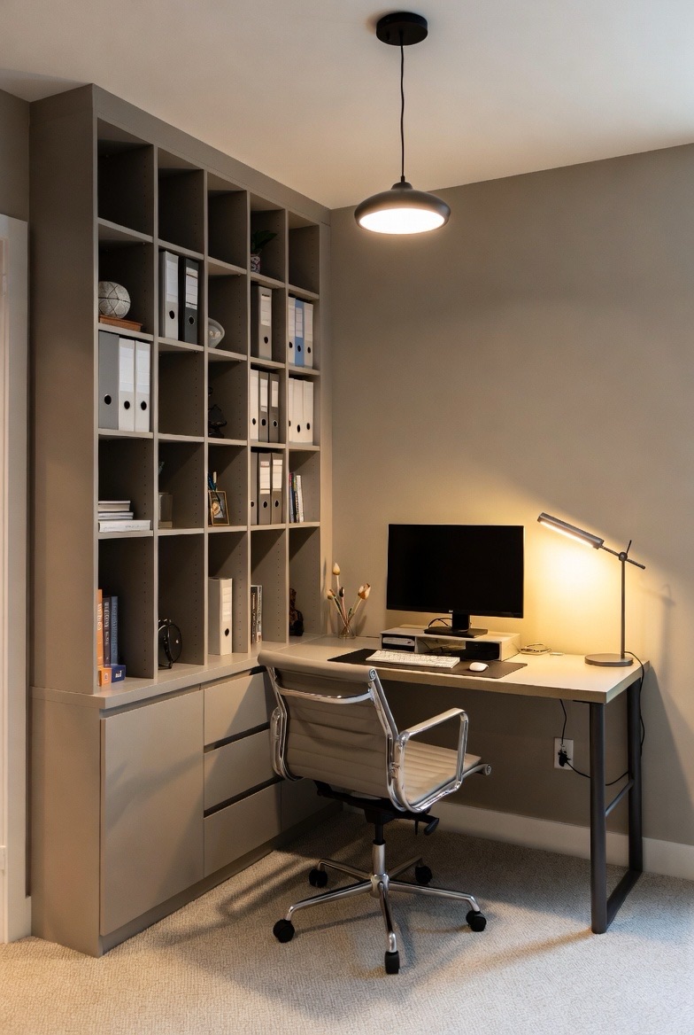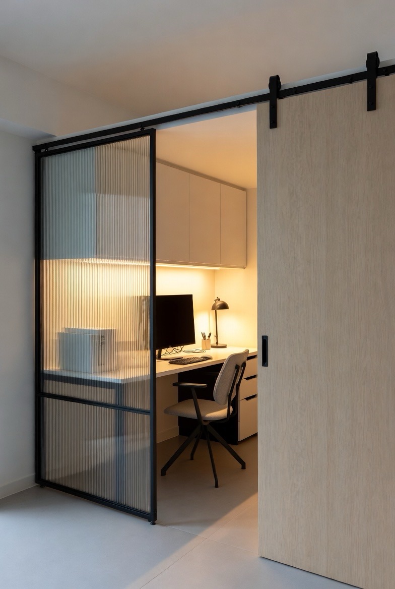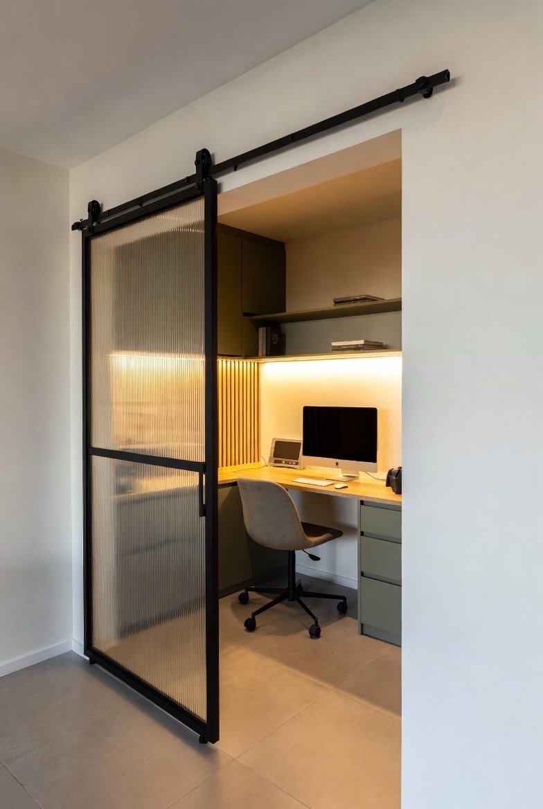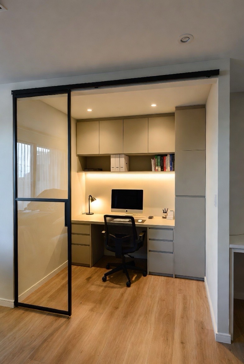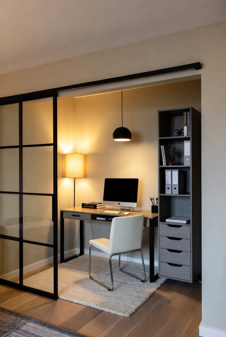 A sliding door or barn door enclosure keeps a small office private while saving space. Choose glass or wood depending on your style. Inside, opt for a slim desk, vertical storage, and warm lighting. This modern feature creates separation without sacrificing style.