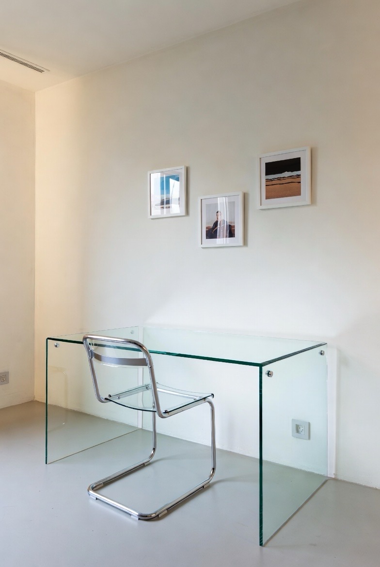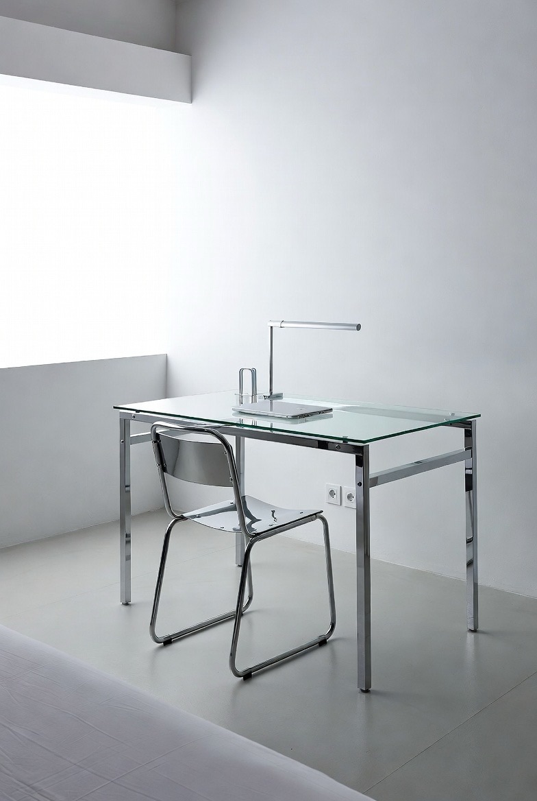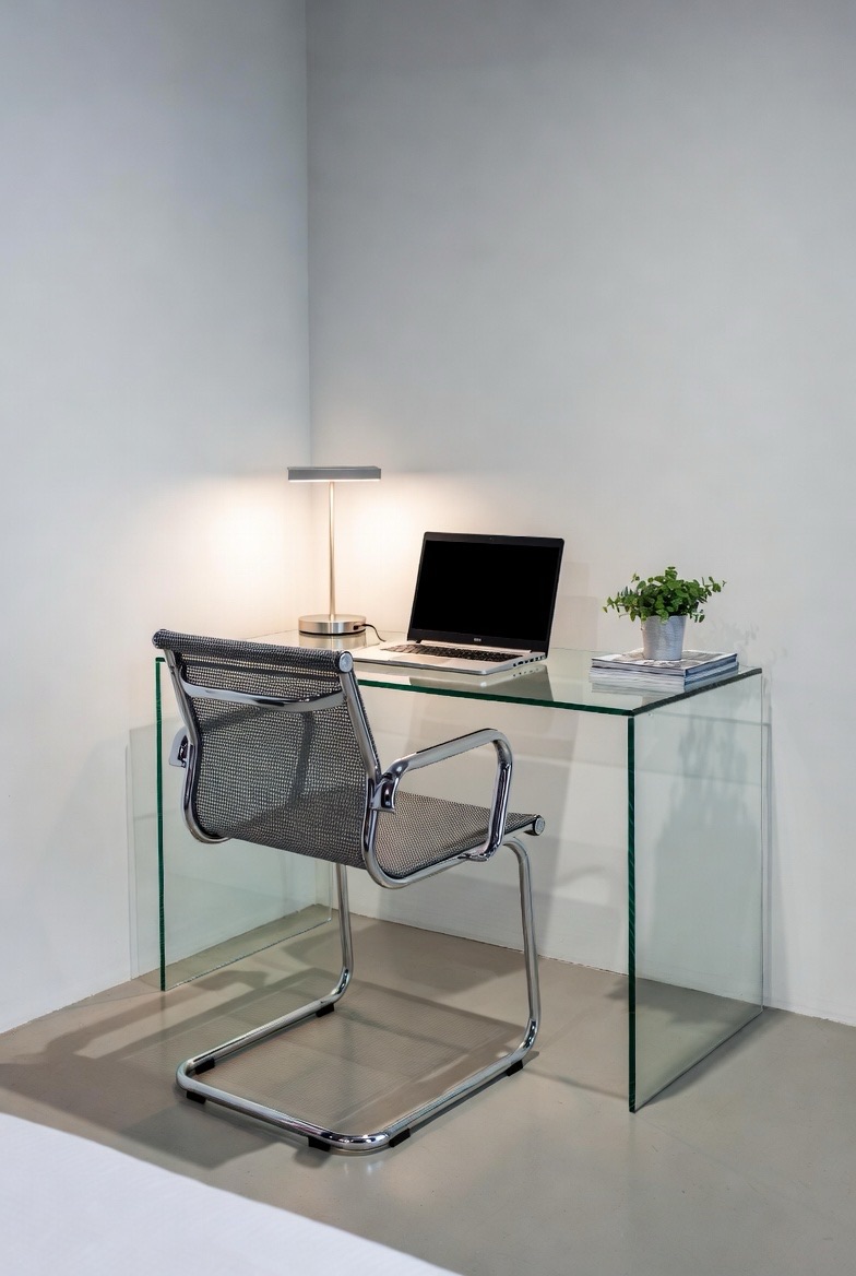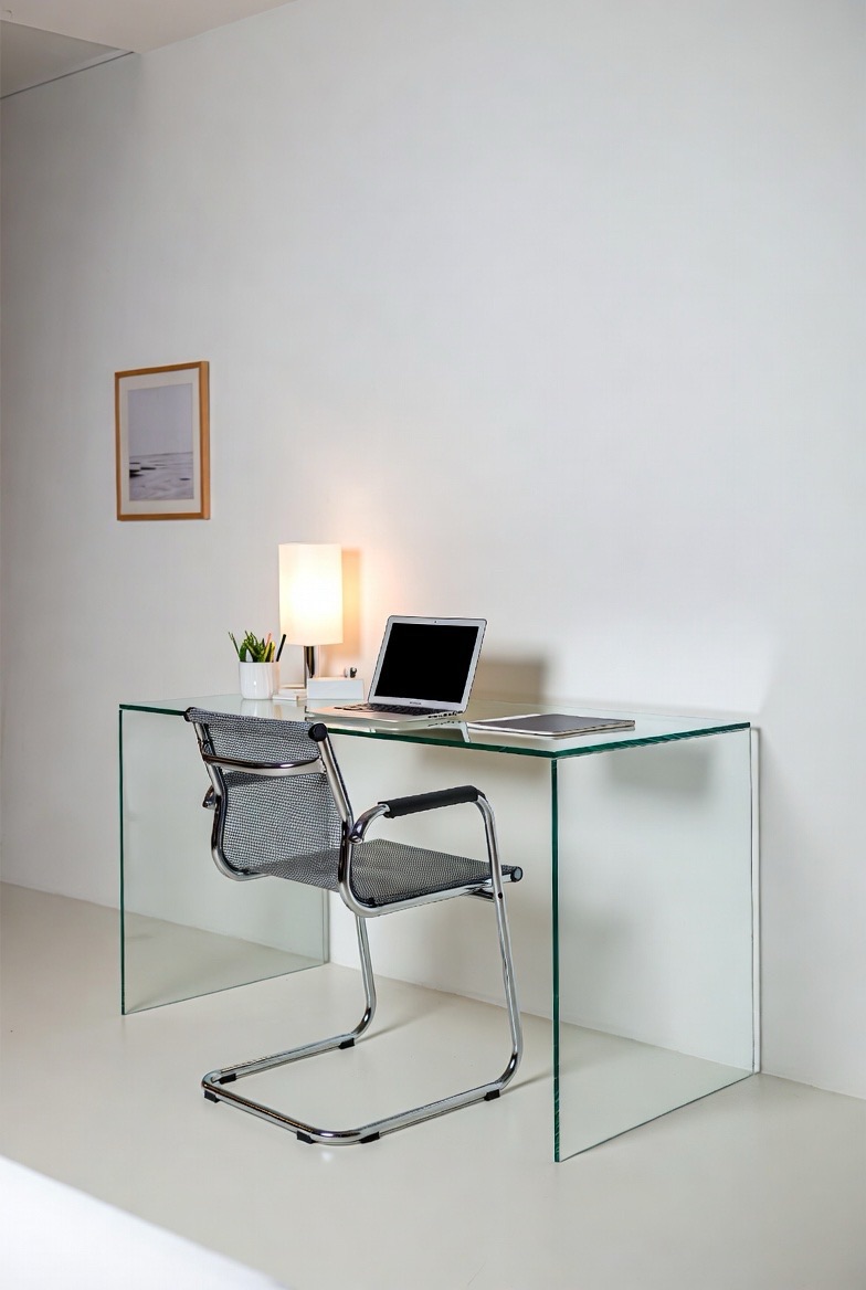 A transparent glass desk makes a small office feel larger, its airy design reduces visual weight while enhancing modern aesthetics. Pair with a sleek metal chair, minimal décor, and soft lighting. This setup works beautifully in compact bedrooms or studio apartments where space must be maximized.