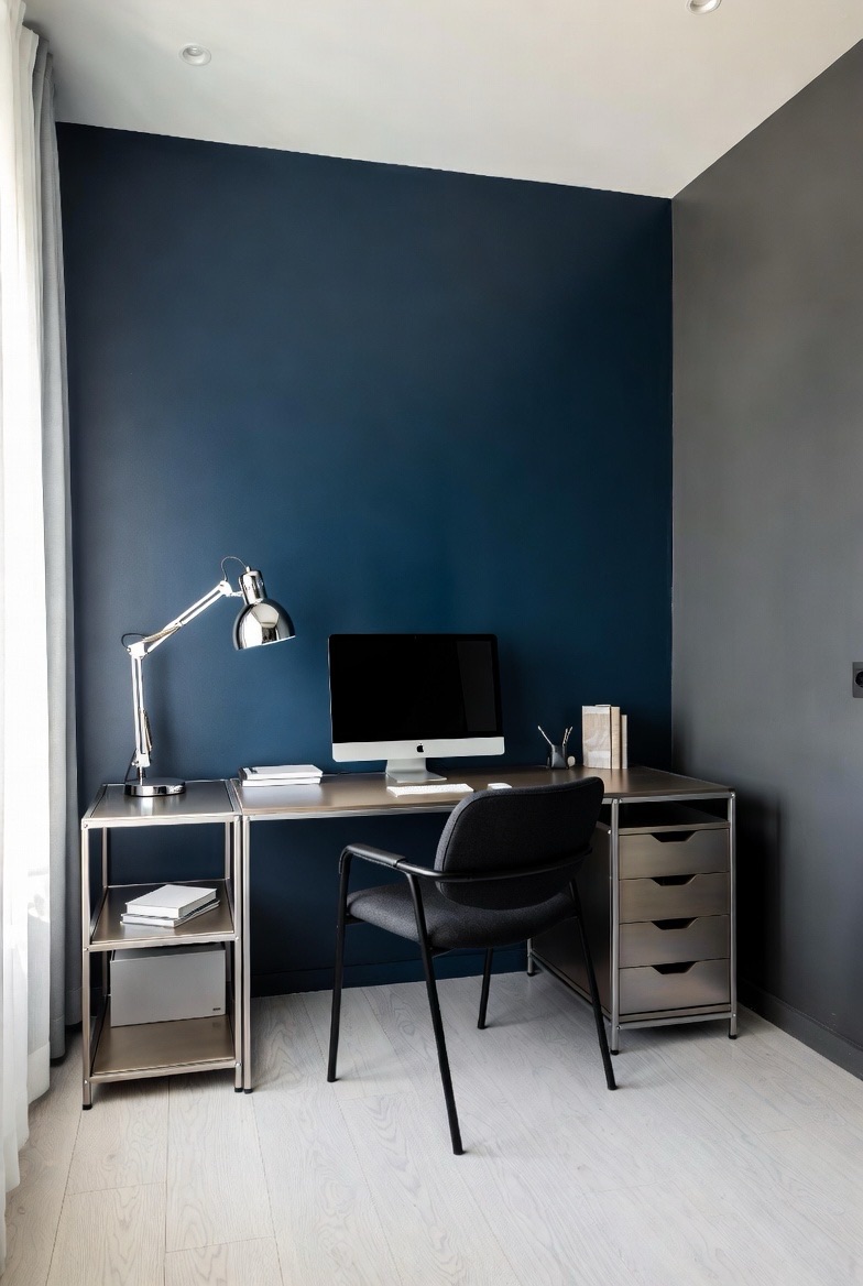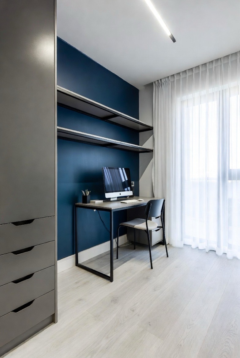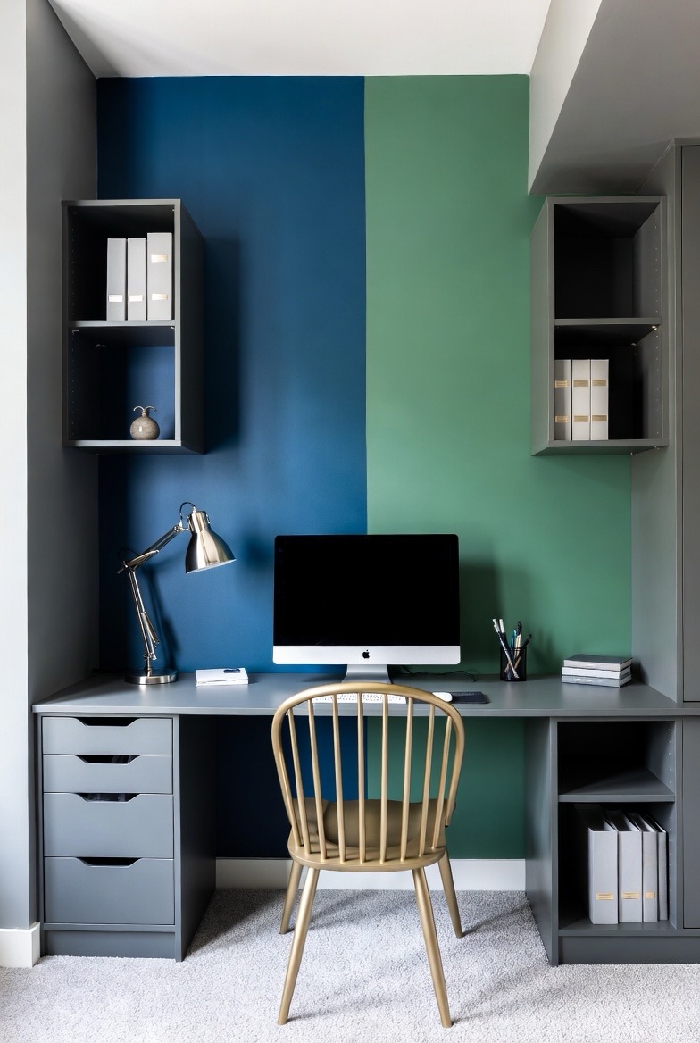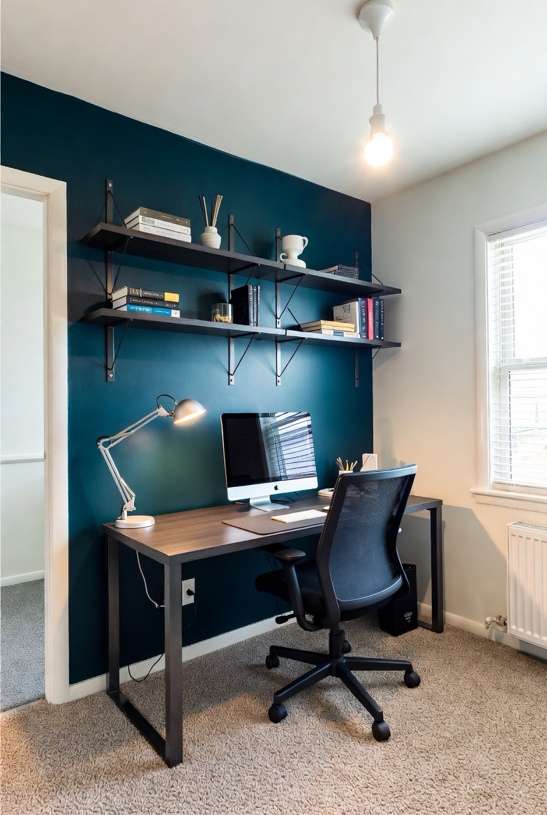 A bold accent wall instantly defines a small office and brings energy to your workspace. Choose colors like navy, emerald, or charcoal for a sophisticated look. Pair with a simple desk, metallic accents, and clean storage solutions. This modern design boosts creativity without overwhelming the room.
