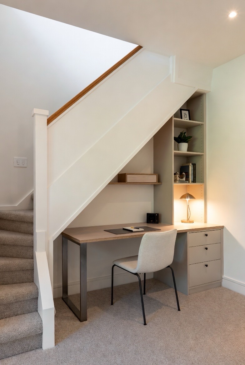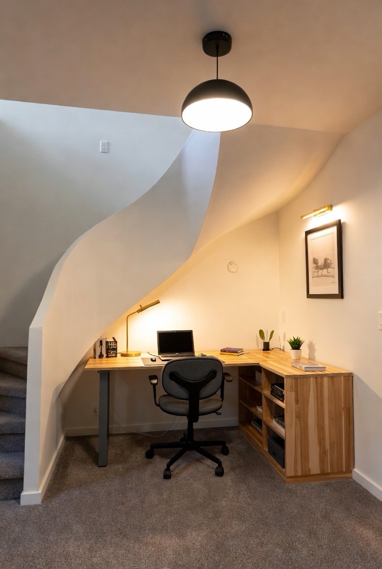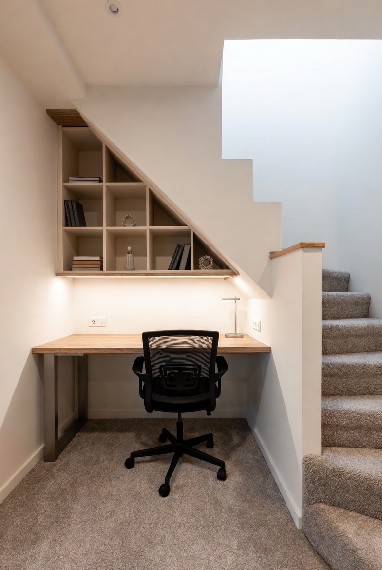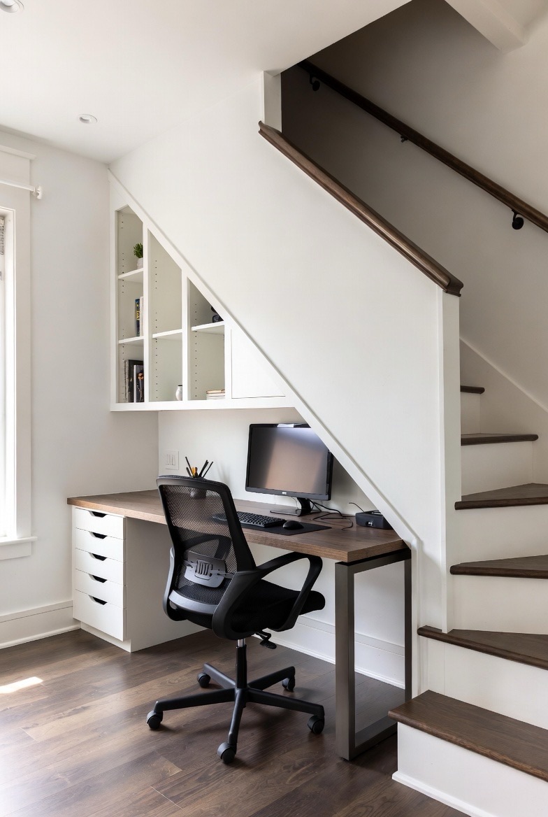 Transform the unused space under your staircase into a clever mini office. Add a custom desk, built-in shelving, and soft lighting to create a functional nook. Keep decorative items minimal to avoid clutter. This hidden office concept is ideal for maximizing space in small homes.