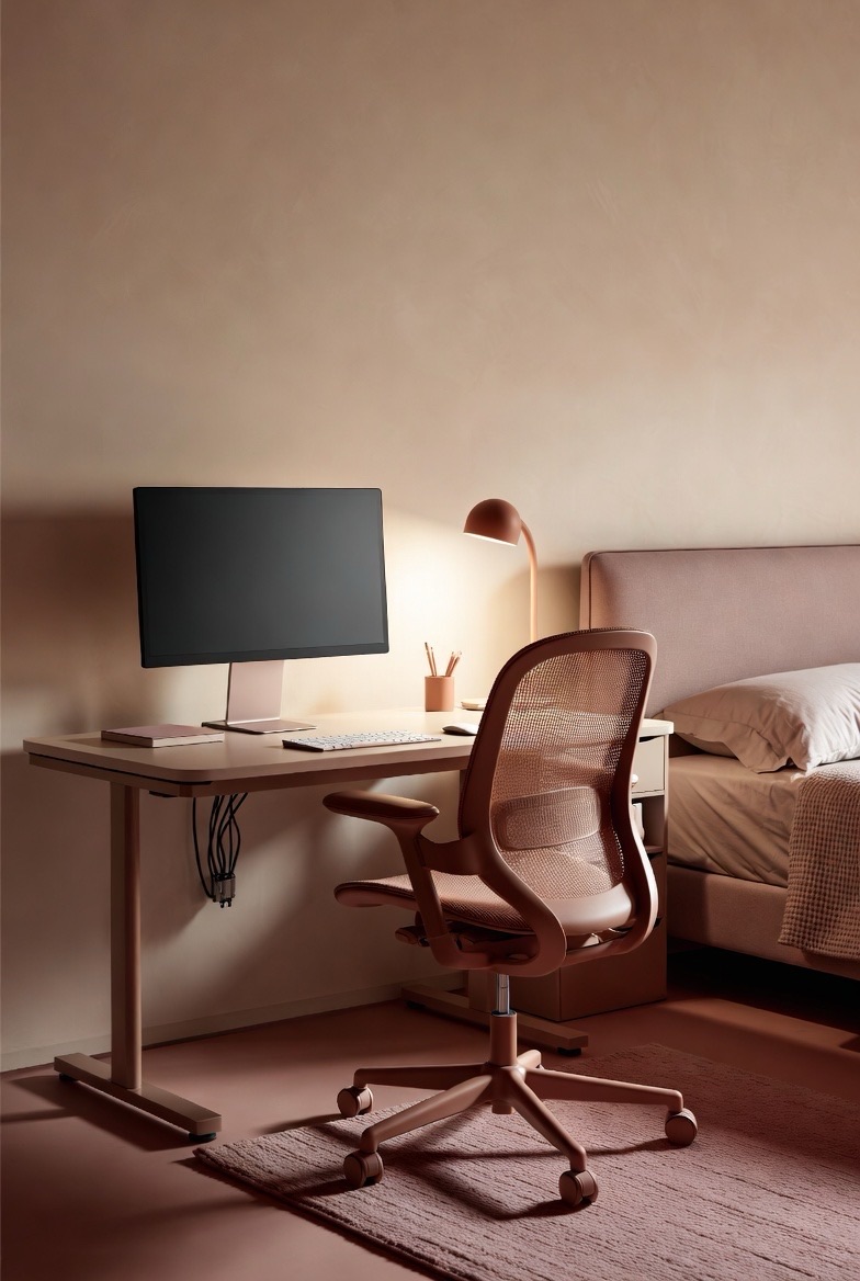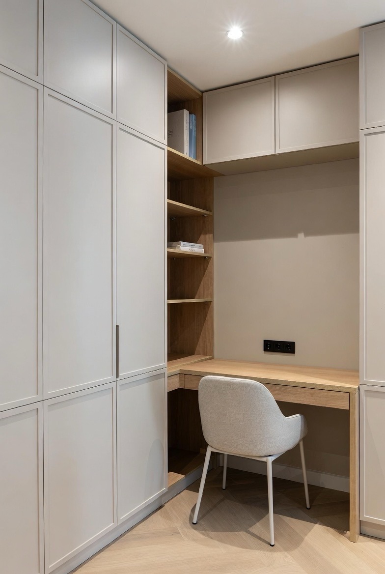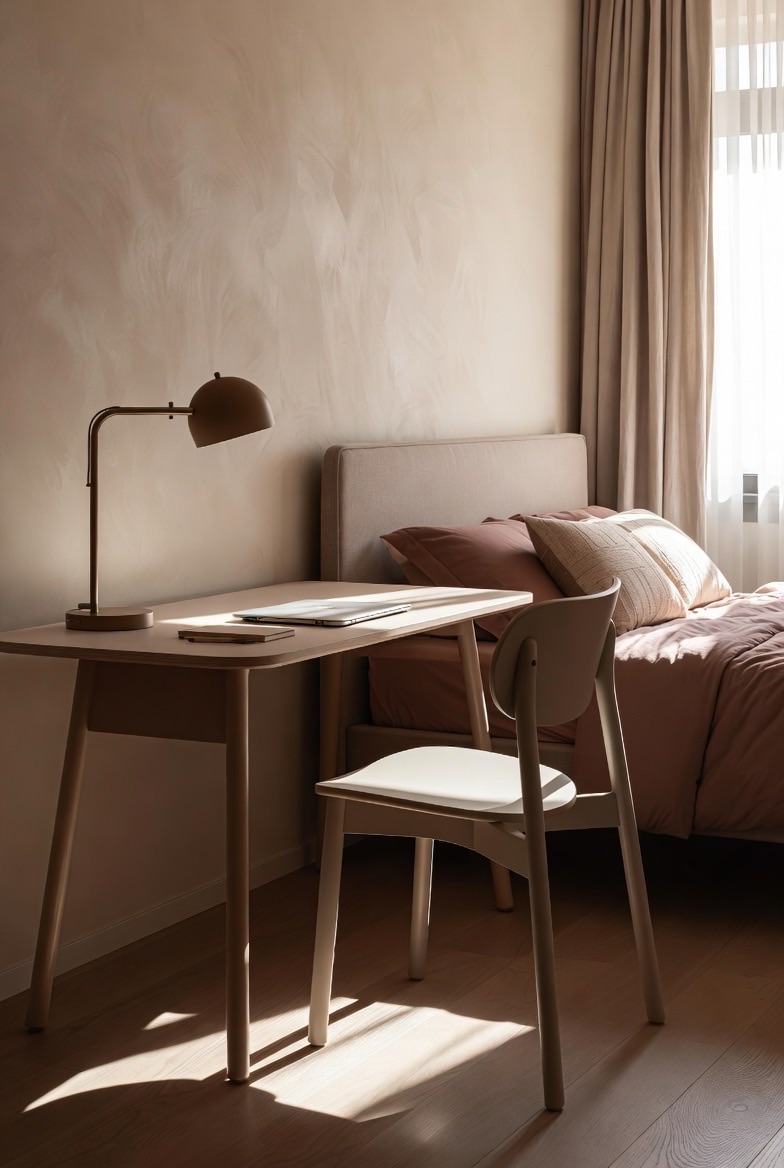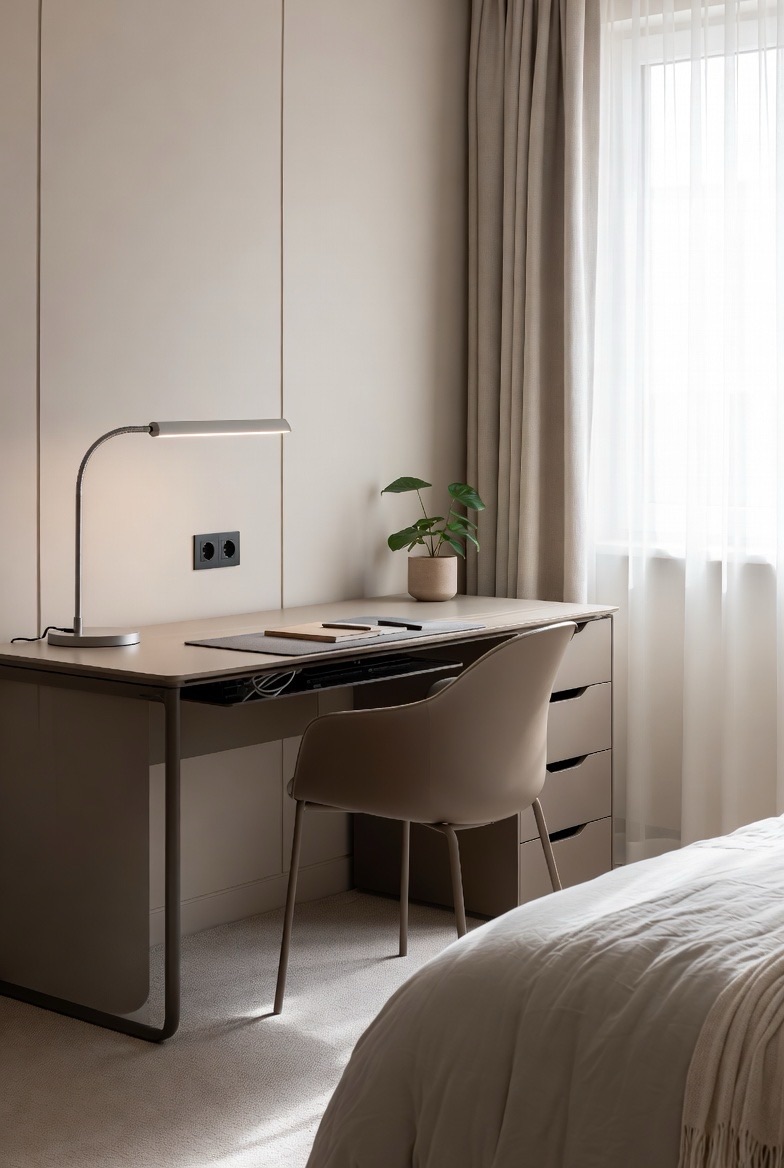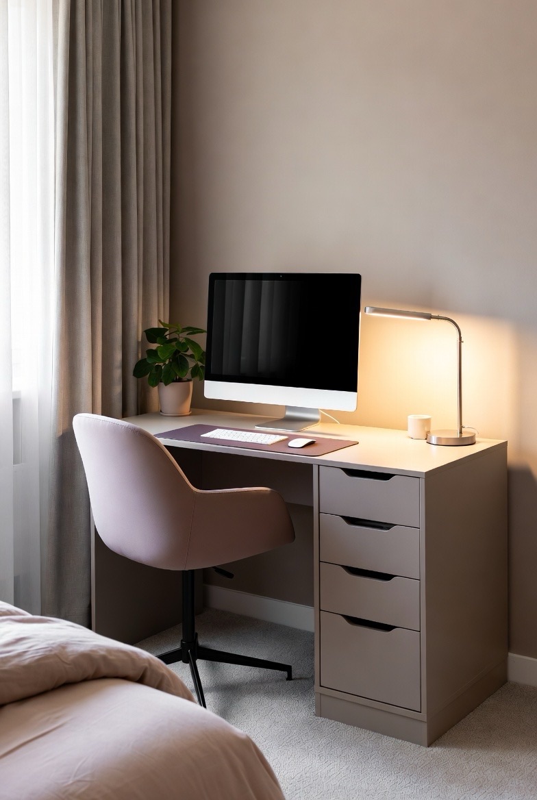 Create a stylish workspace within your bedroom using a compact desk and modern chair. Use matching colors and textures to blend the office seamlessly with the rest of the décor. Add a desk lamp, soft linens, and natural accents to keep the space calm and cohesive.