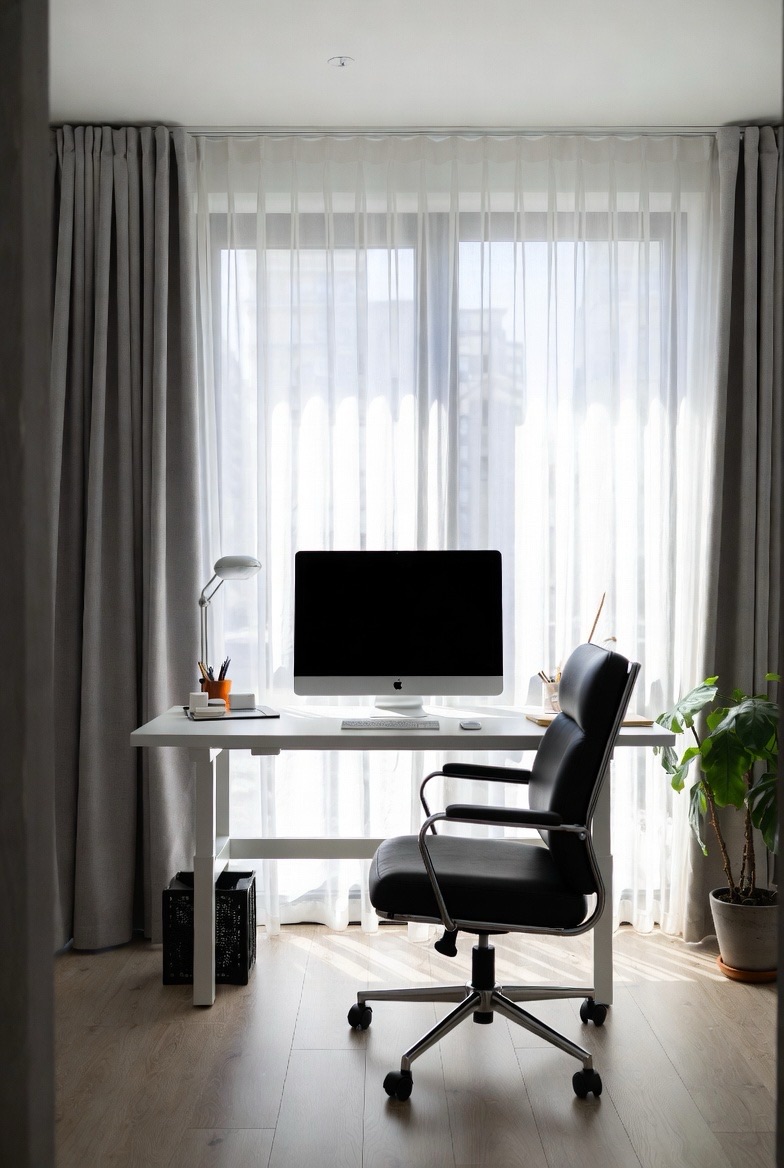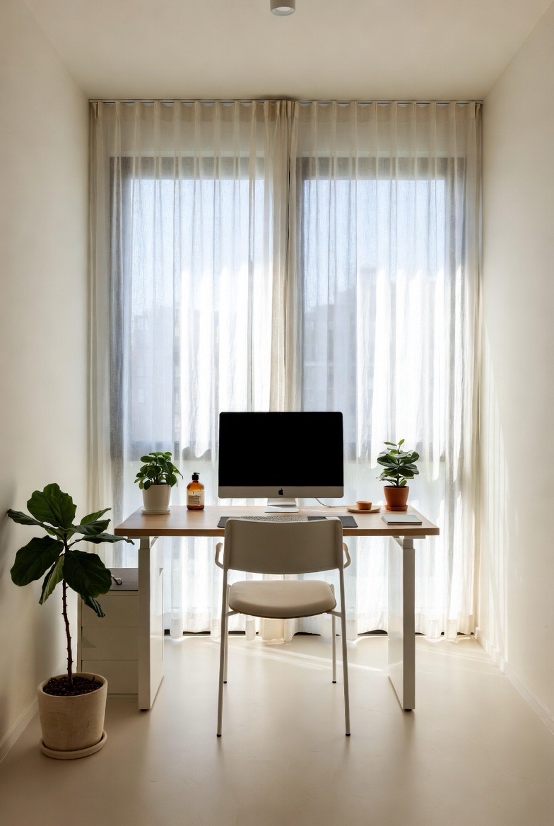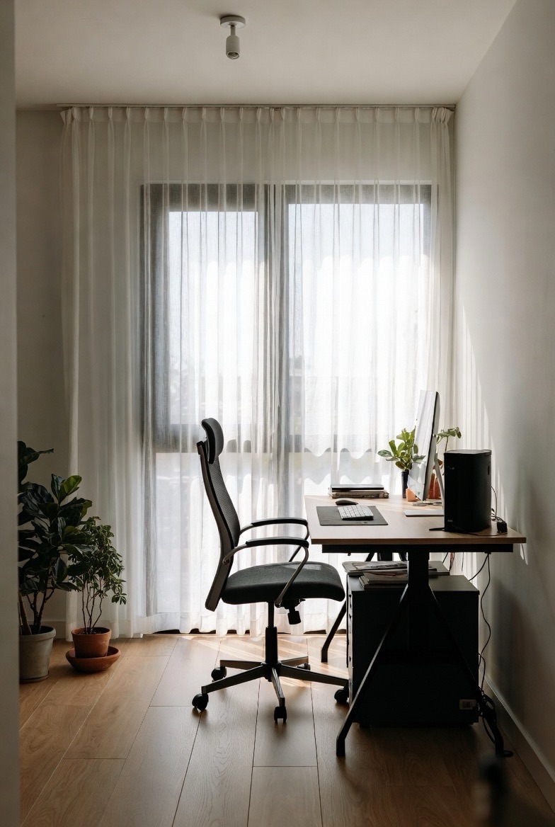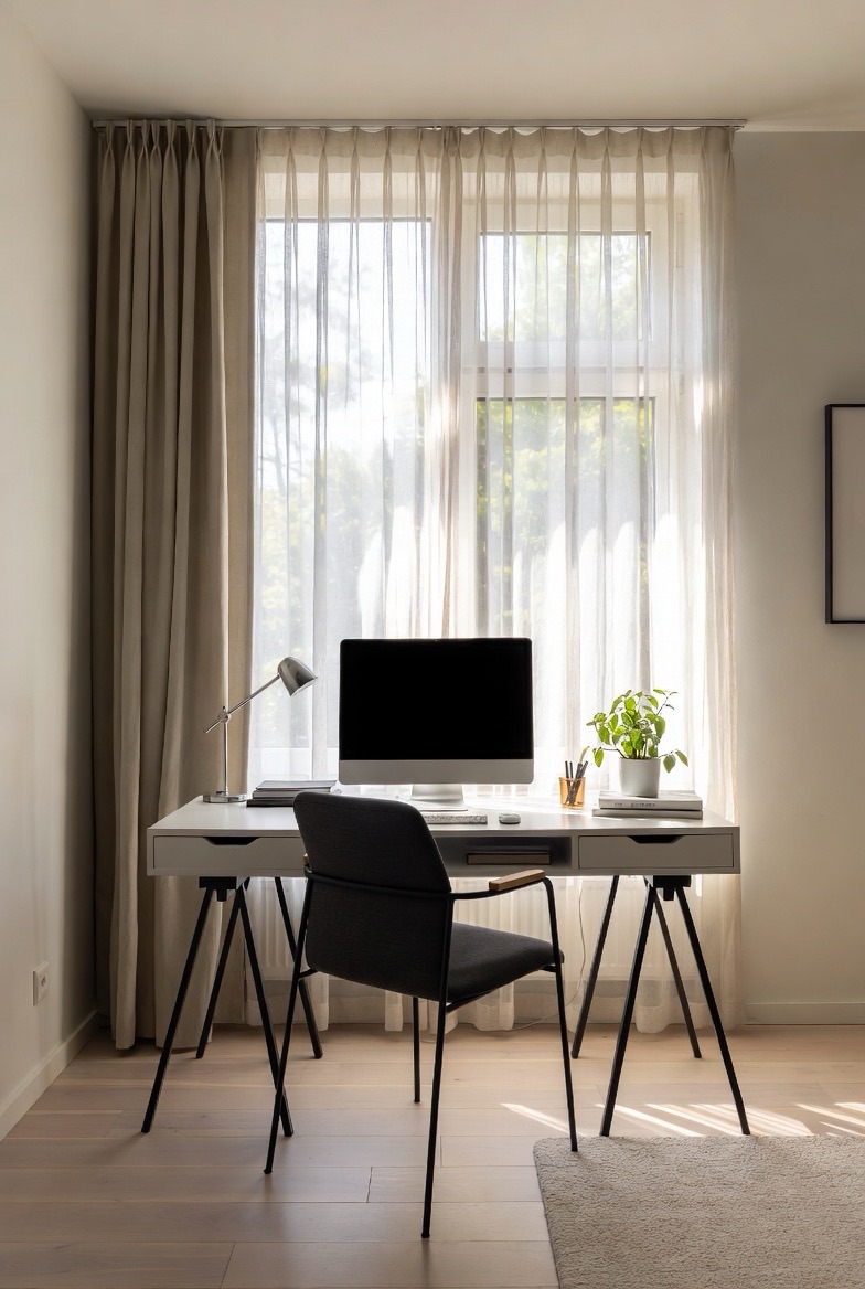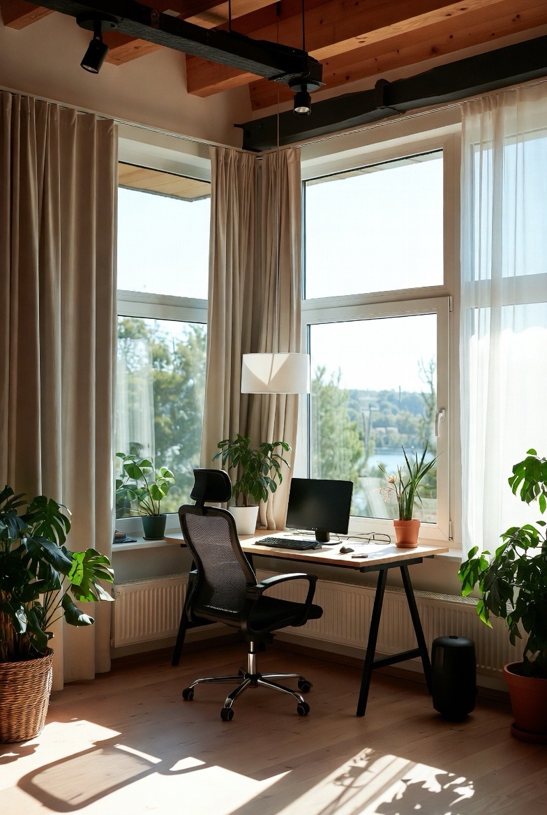 Position your desk near a window to maximize natural light, perfect for small offices. Pair with sheer curtains, a minimal desk, and greenery for a calming, modern vibe. Natural light boosts focus and productivity while making the space feel bright and open.