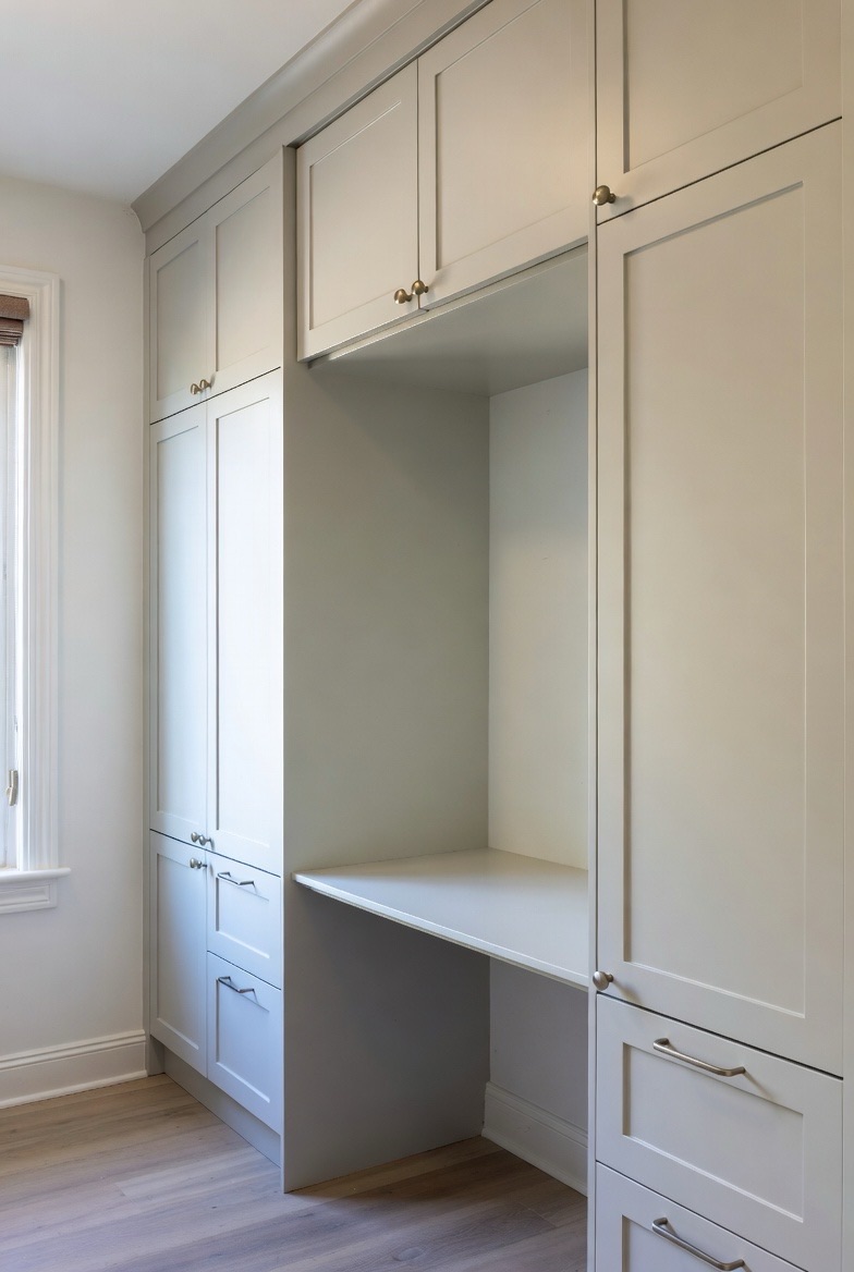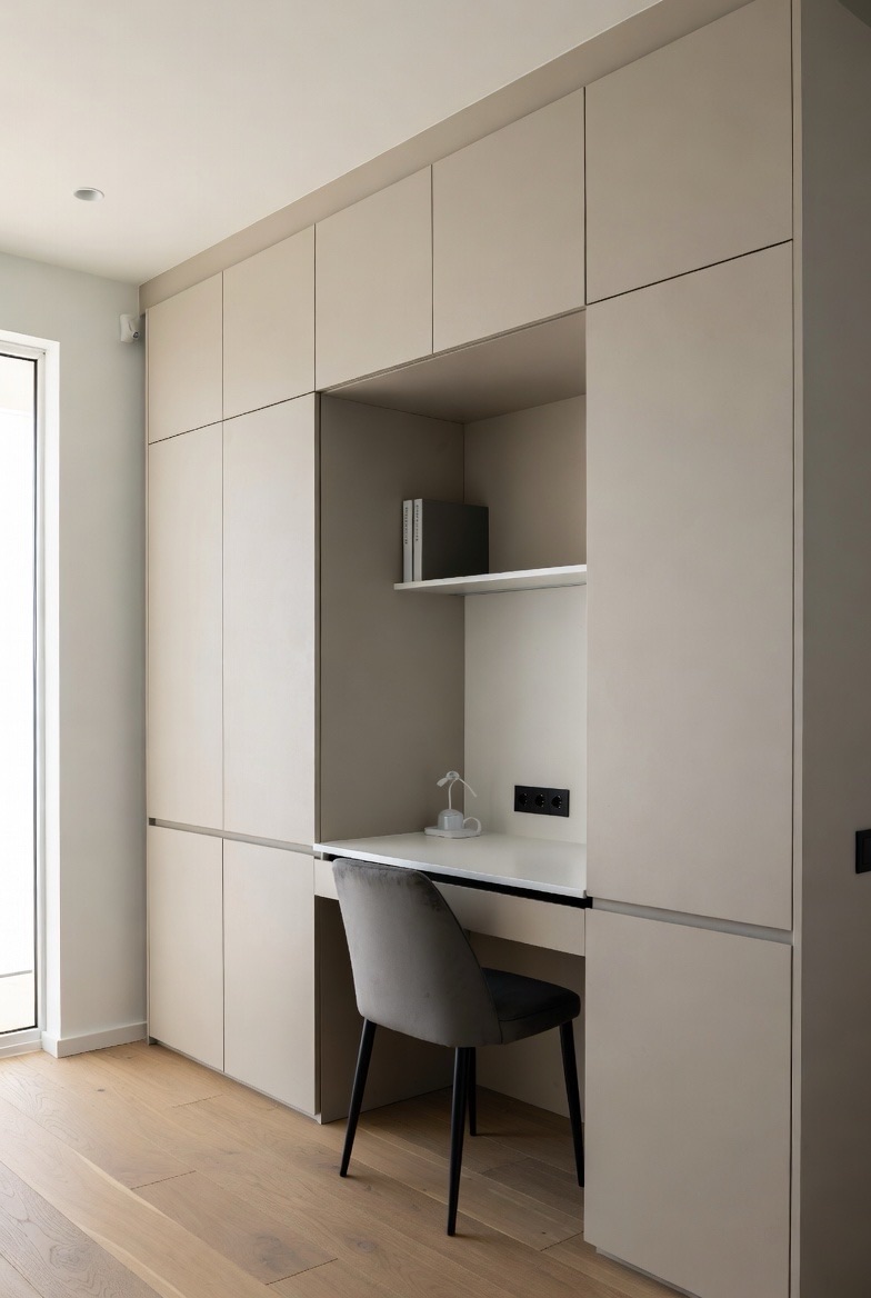 Create a sleek, modern office using built-in cabinets with a desk integrated between them. This layout provides ample hidden storage while maintaining clean lines. Use neutral tones to keep the space open and serene. Ideal for home offices that require organization.