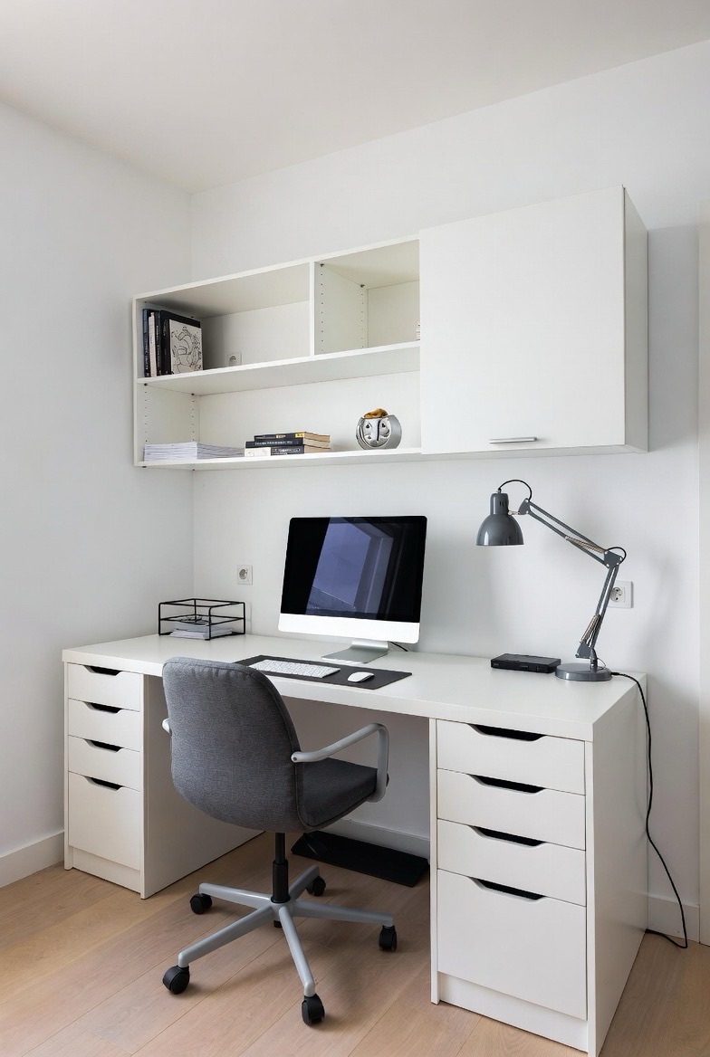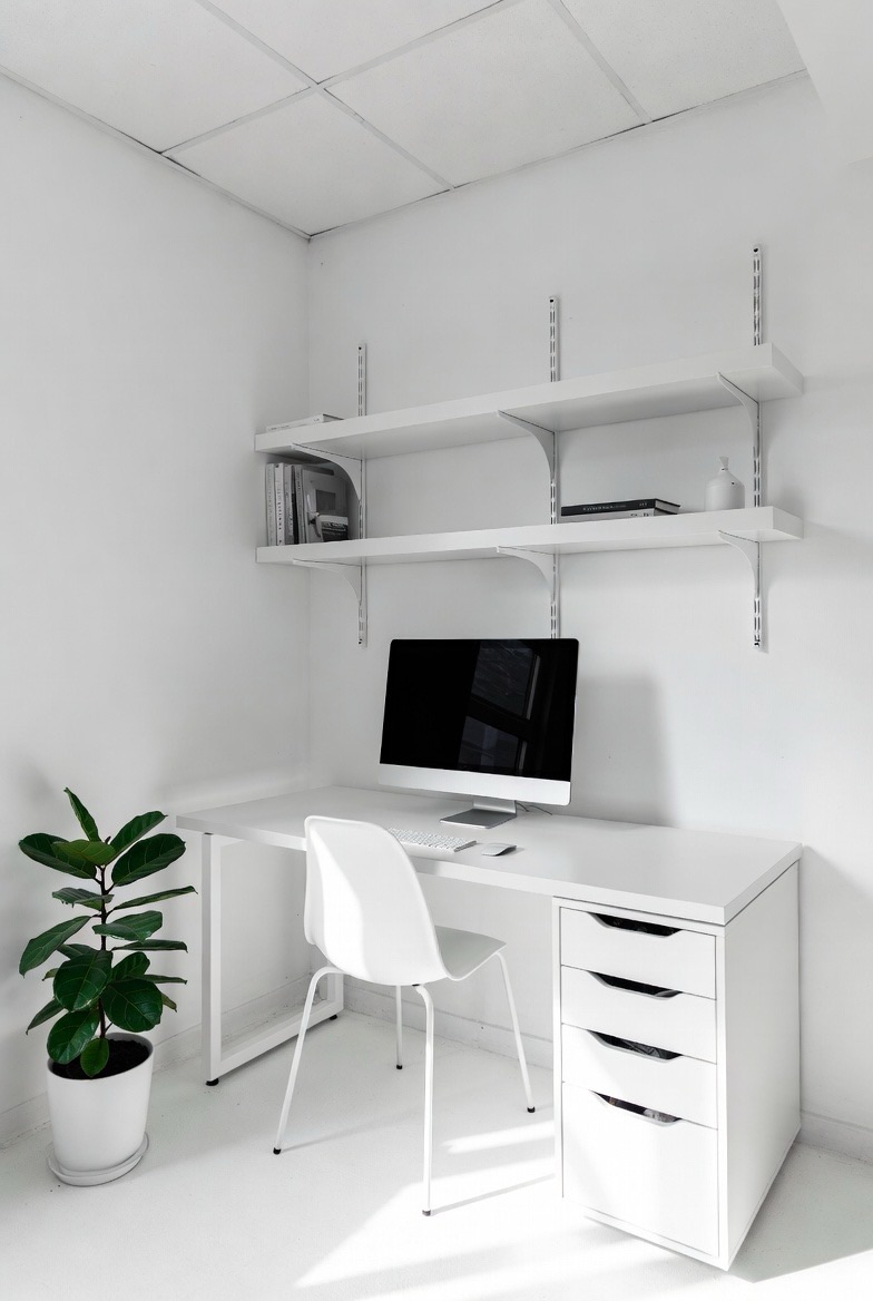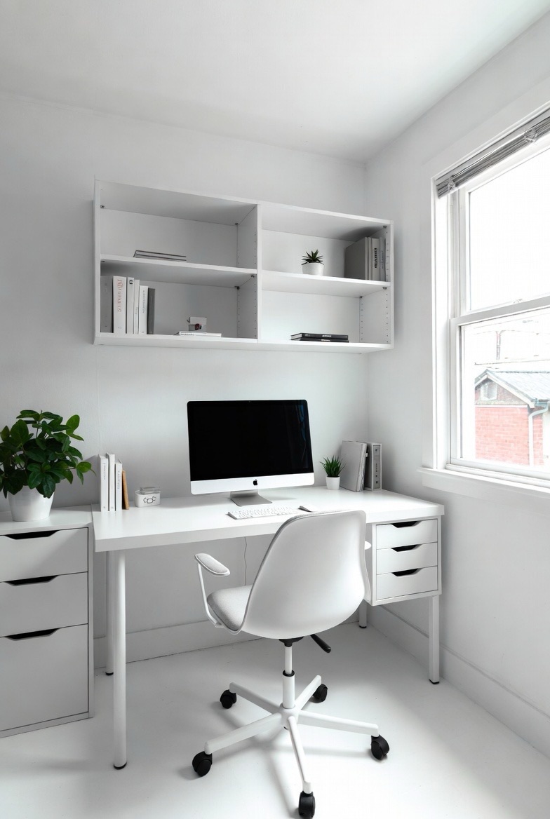 An all-white office brightens small spaces and creates a crisp modern feel. Choose a white desk, matching shelves, and minimal décor. Add a plant or metallic accent for subtle contrast. This simple setup enhances clarity and organization.