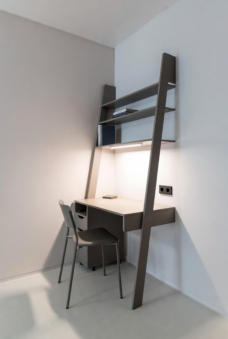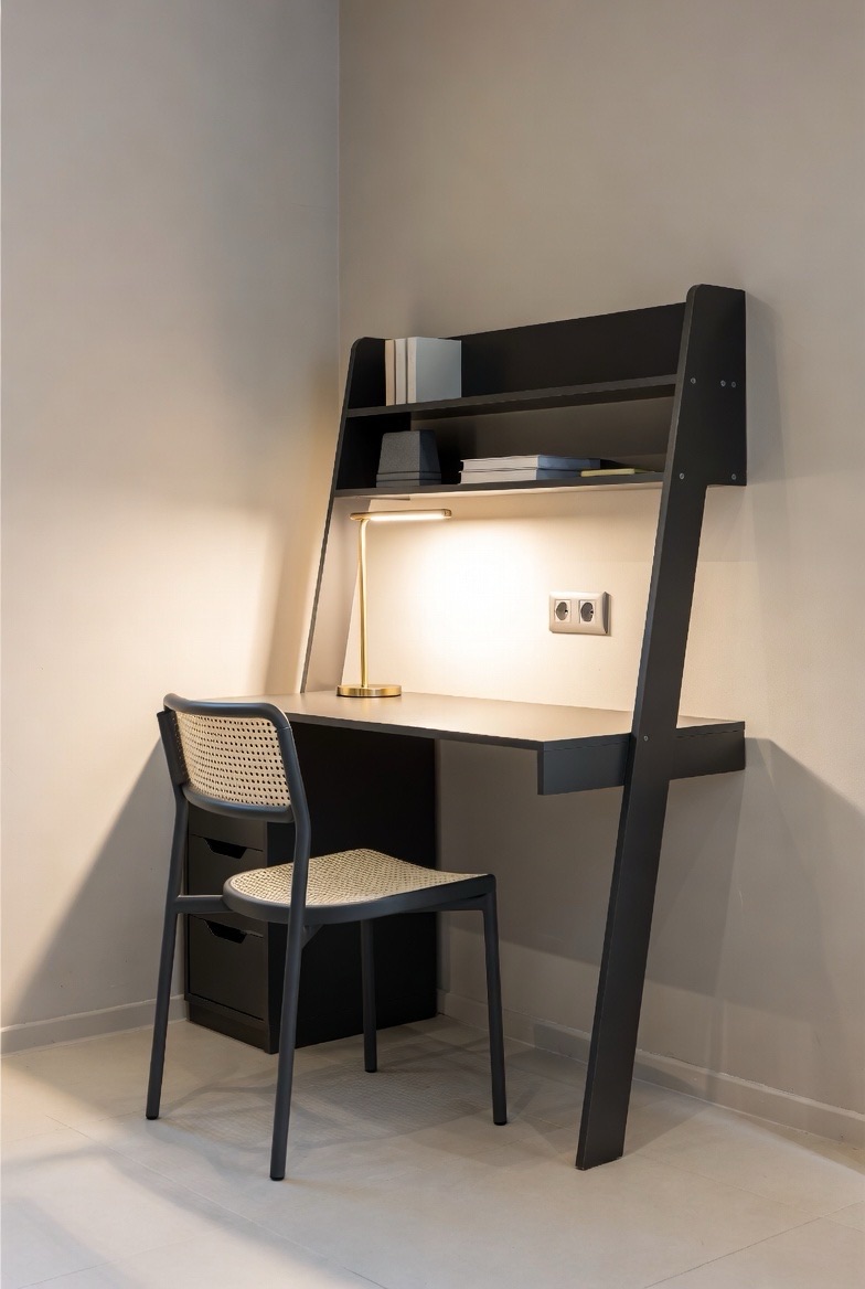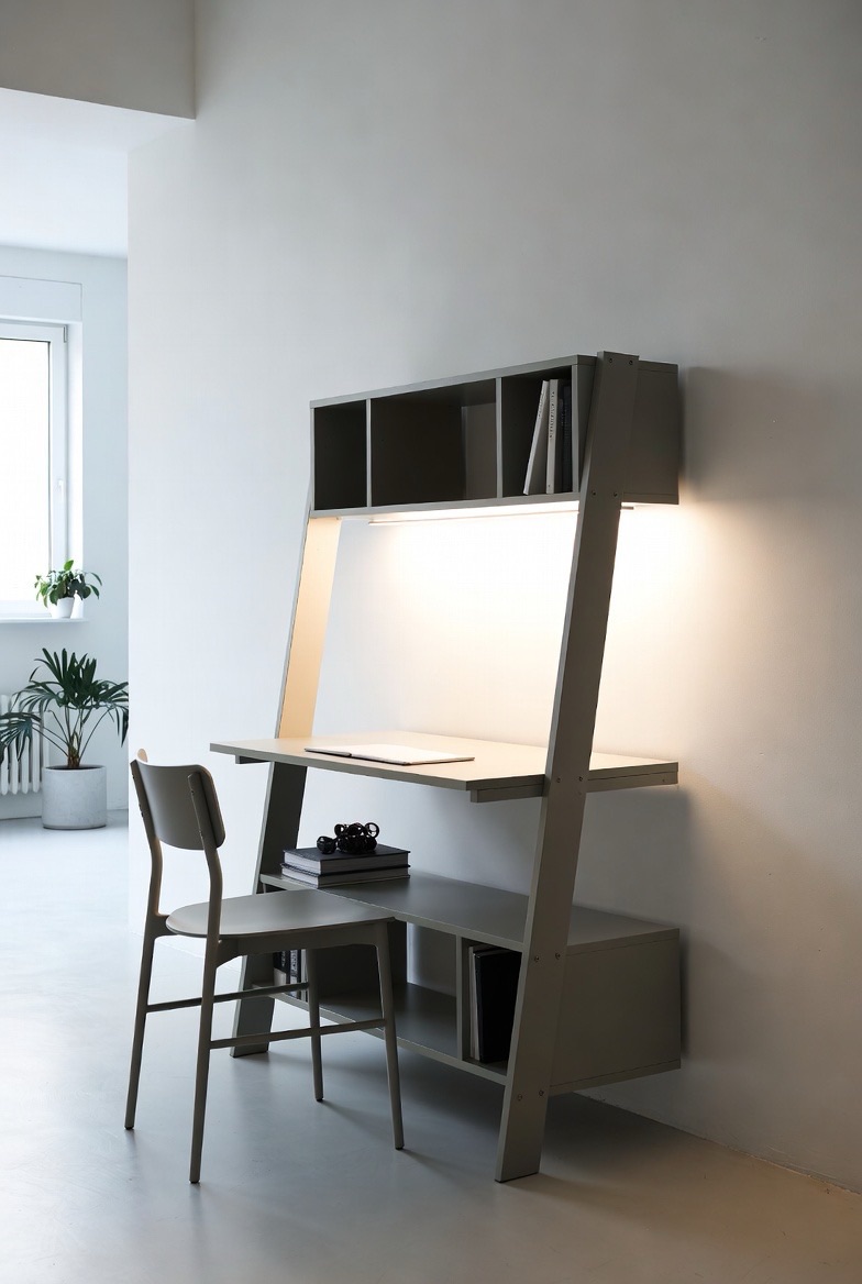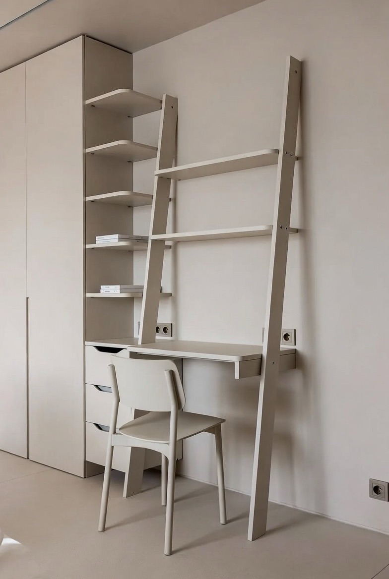 A ladder desk is perfect for tight spaces, its vertical structure offers shelving and a compact work surface. Pair with a slim chair and soft lighting for a sleek, modern look. This creative design is ideal for hallways, bedrooms, and small apartments.