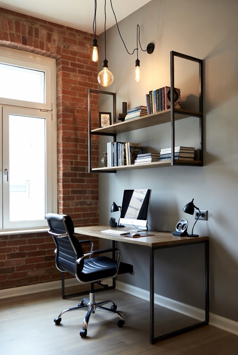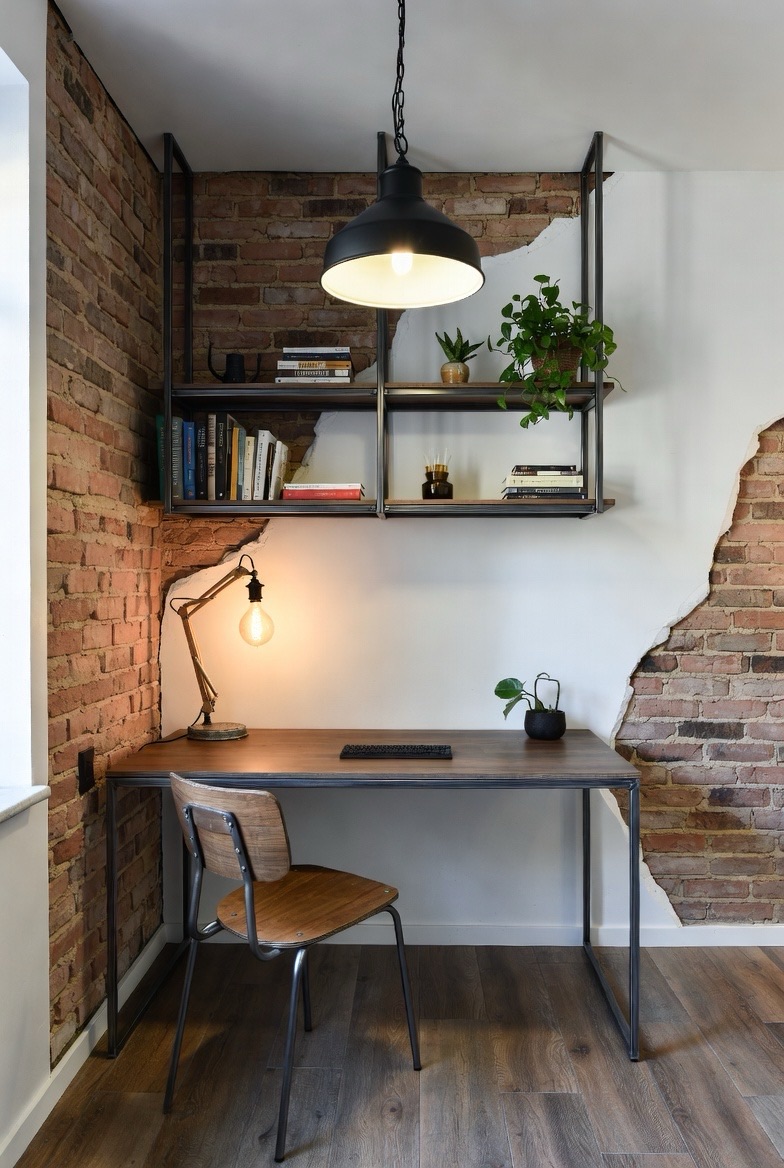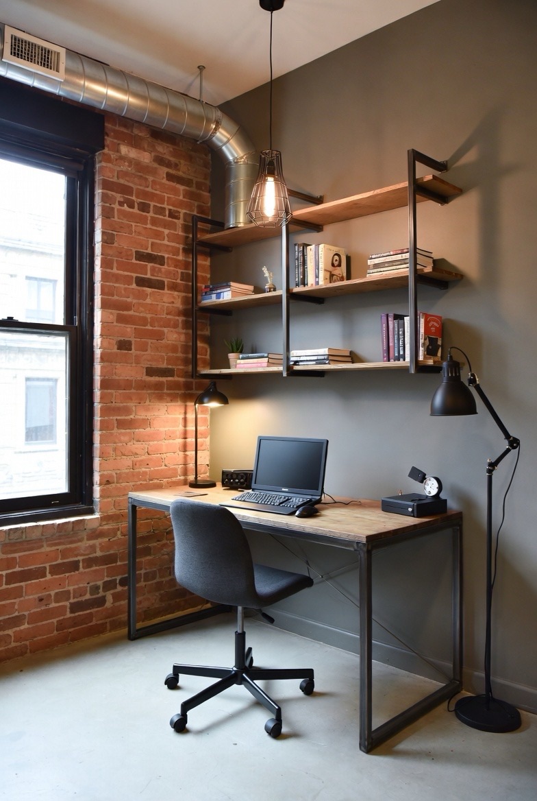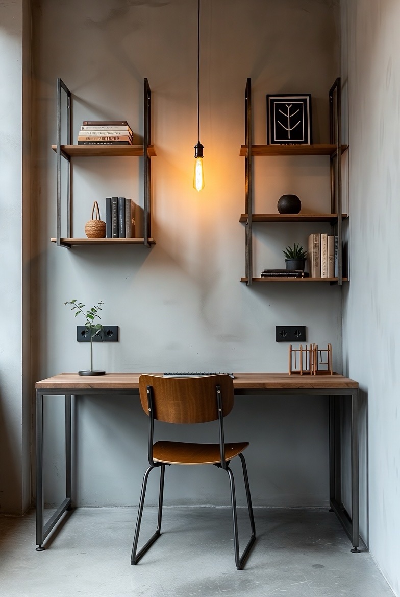 Combine metal, wood, and bold lighting for an industrial-modern small office. A metal-framed desk, exposed bulb lamp, and floating shelves create an edgy yet functional vibe. This compact design blends character with efficiency.