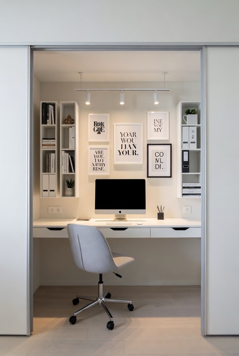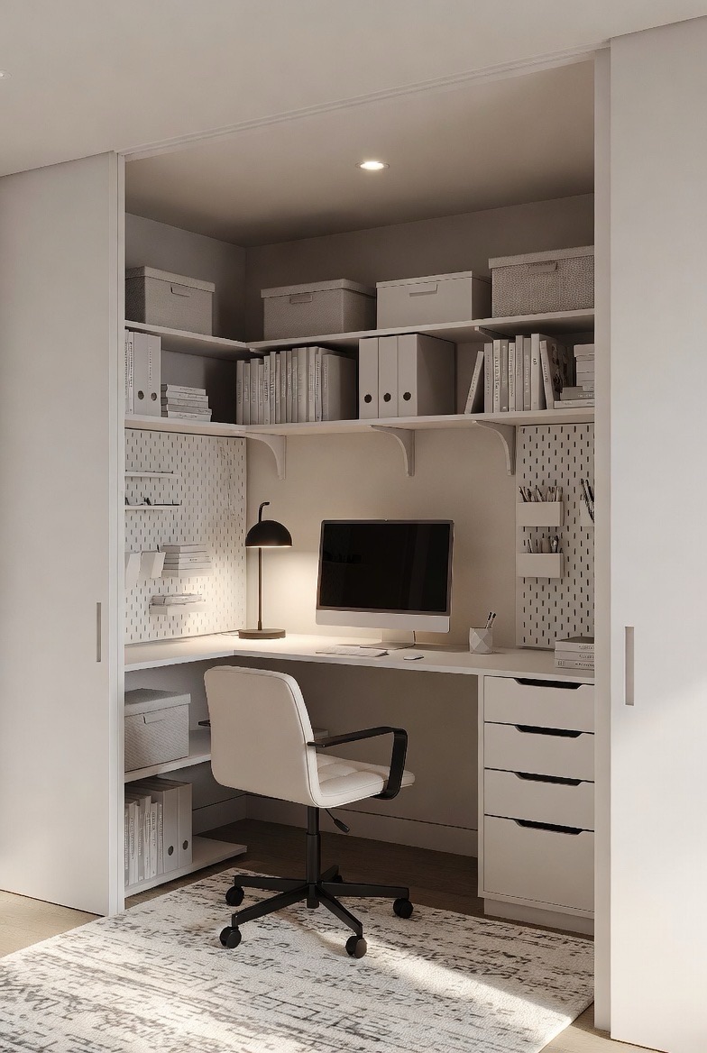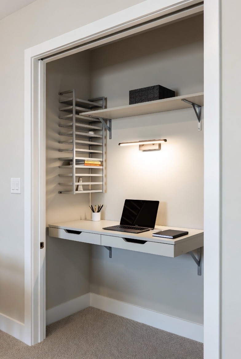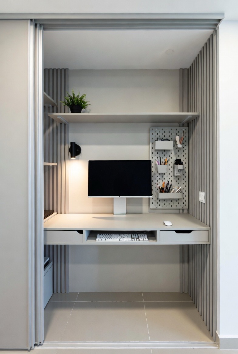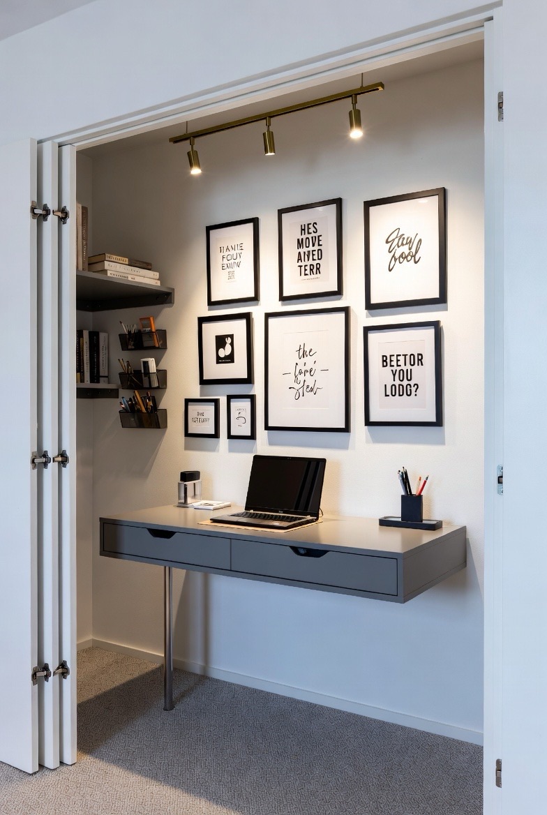Transform a small closet into a chic hidden office, add a floating desk, sleek lighting, and wall organizers. Close the doors when you’re done working to keep your space tidy. This modern hack is perfect for small homes needing a dedicated work zone.