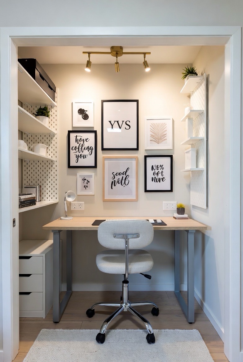 Add personality to your small office with a mini gallery wall above your desk. Choose framed prints, quotes, and minimalist art. Keep the desk simple and use vertical storage to maintain balance. This design energizes your workspace without clutter.