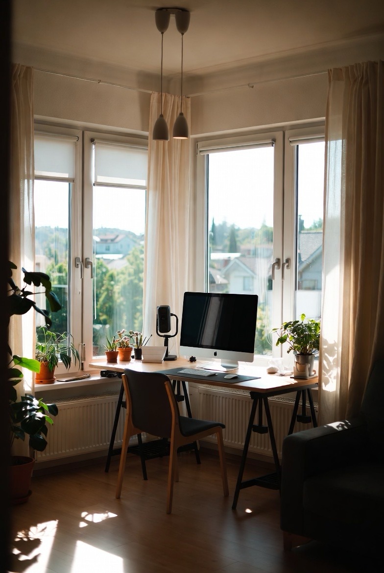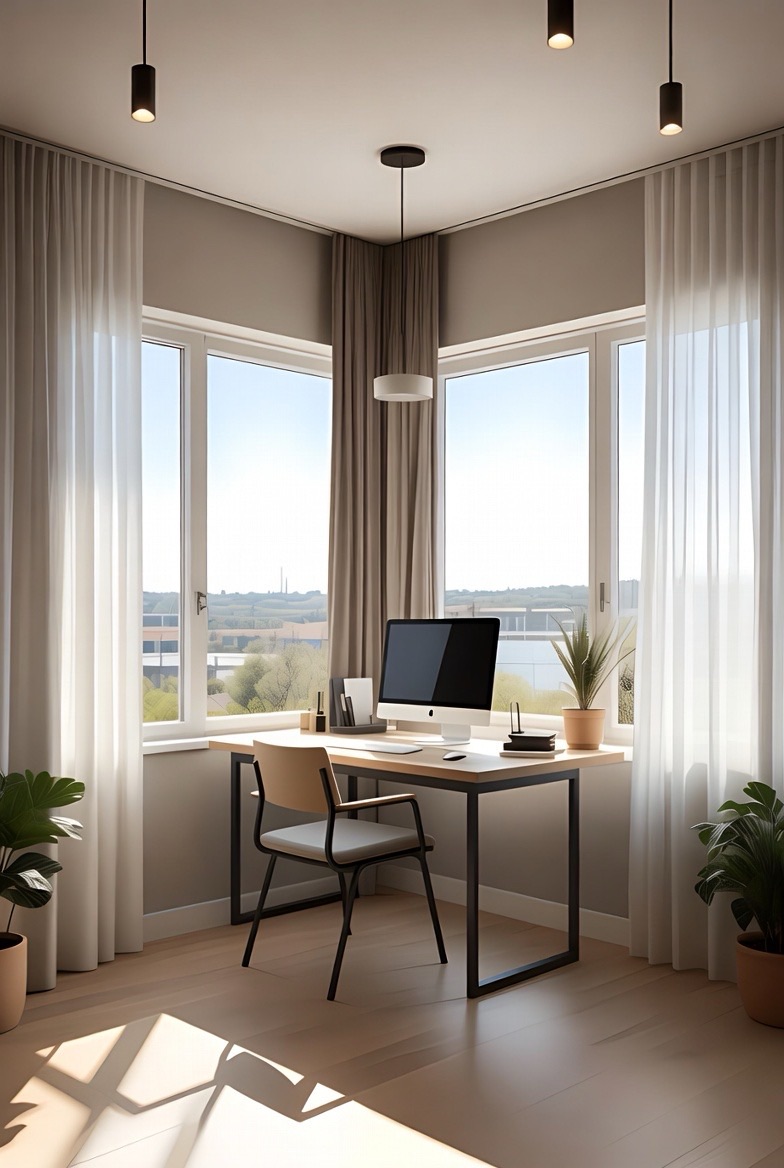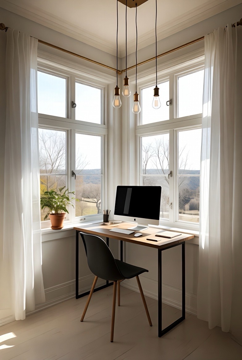Place your desk in a corner with windows for a bright, scenic workspace. Use a small wooden or metal desk to keep things open. Add soft curtains, modern lighting, and plants. This layout brings the outdoors in, enhancing creativity.