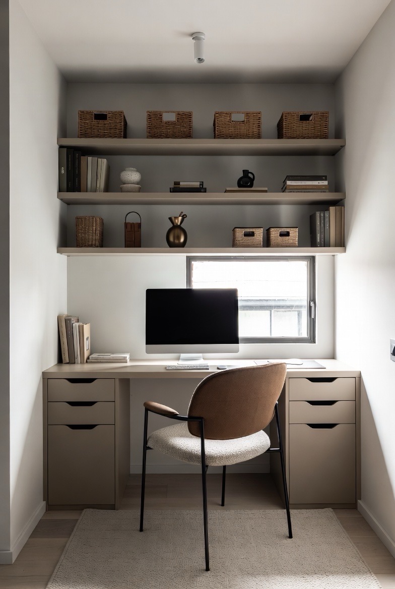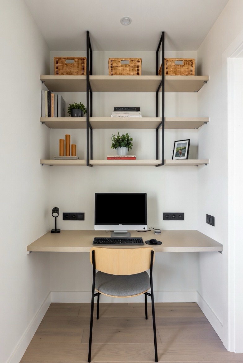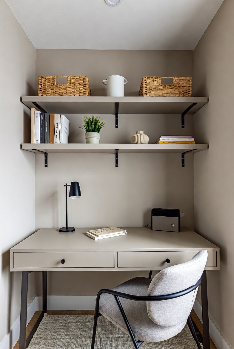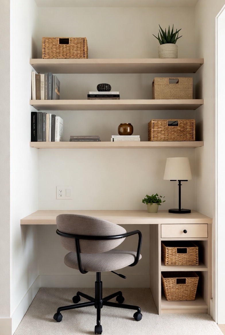 Maximize storage with floating shelves above your desk, perfect for small offices. Use them for books, décor, and baskets. A simple desk and comfortable chair complete the design. This organized layout keeps essentials accessible without clutter.