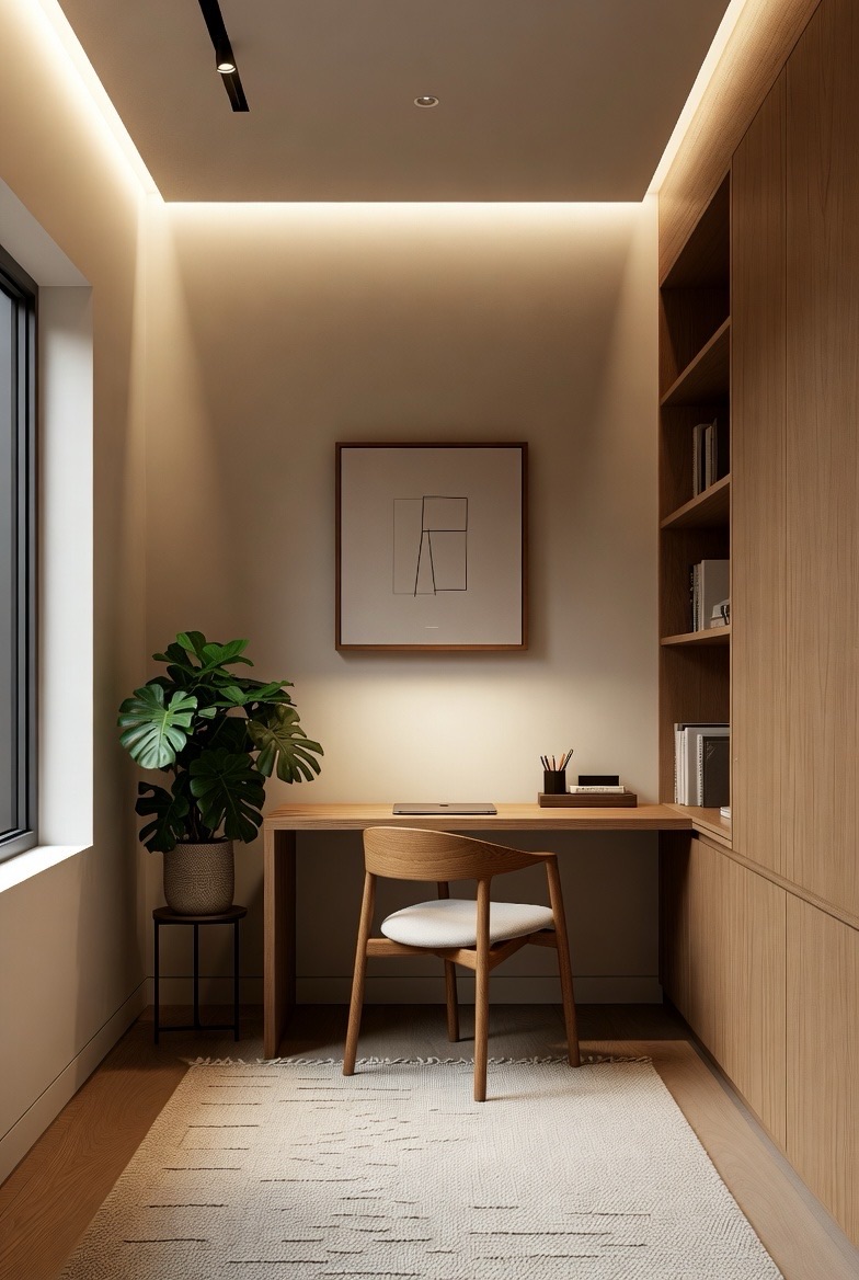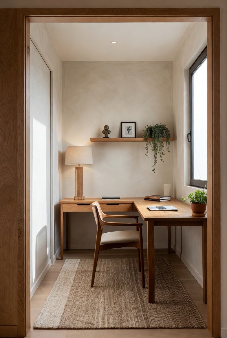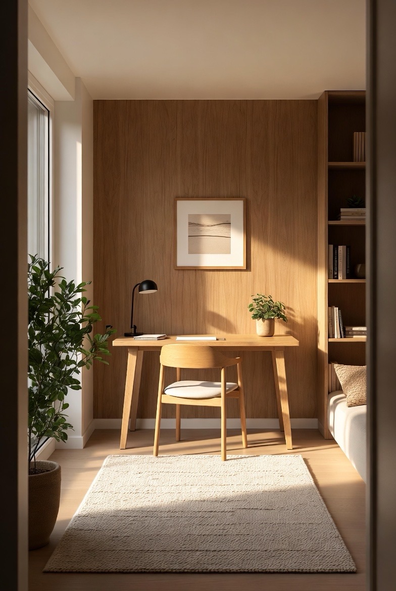 Warm wooden tones create a peaceful, modern small office. Choose a wood desk, textured rug, and soft lighting for comfort. Add greenery and minimal décor for a balanced look. This natural, calming design supports focus and creativity.