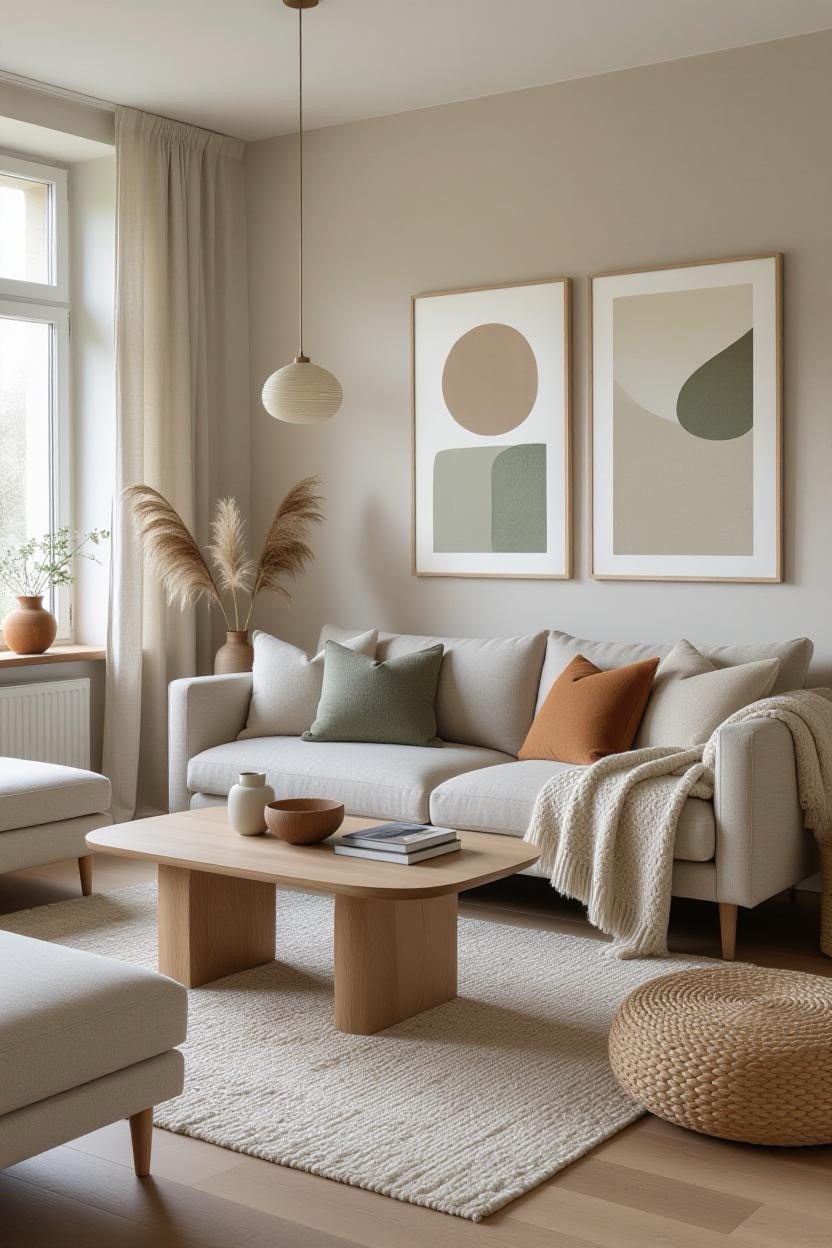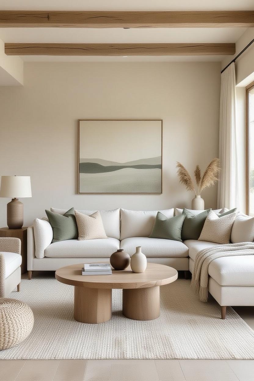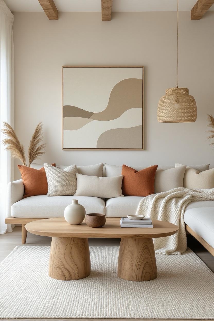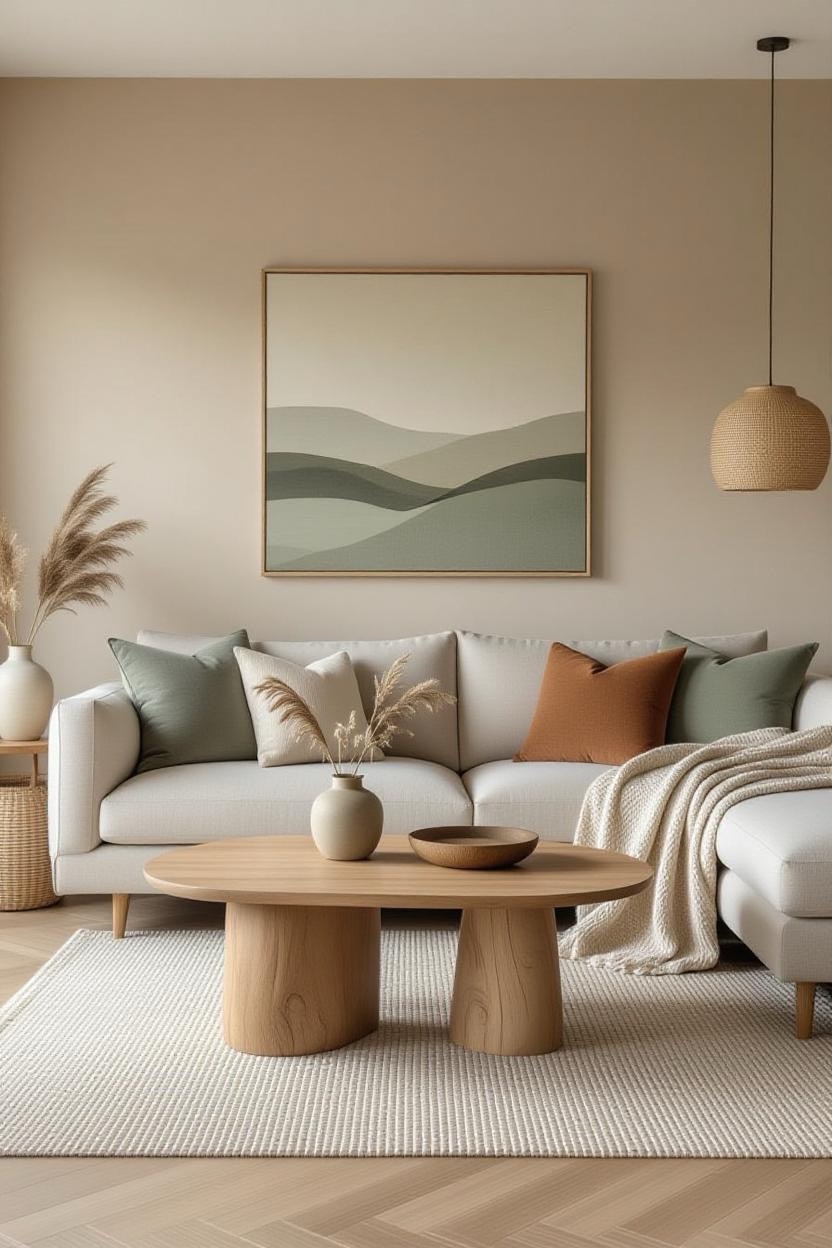 Choose warm neutrals like beige, taupe, and cream as your base colors, then layer in muted greens, browns, and grays for depth. These natural shades set the foundation for a serene organic modern living room.