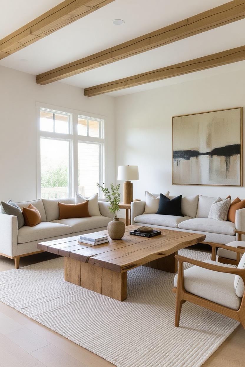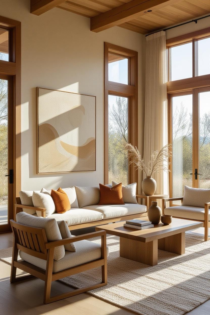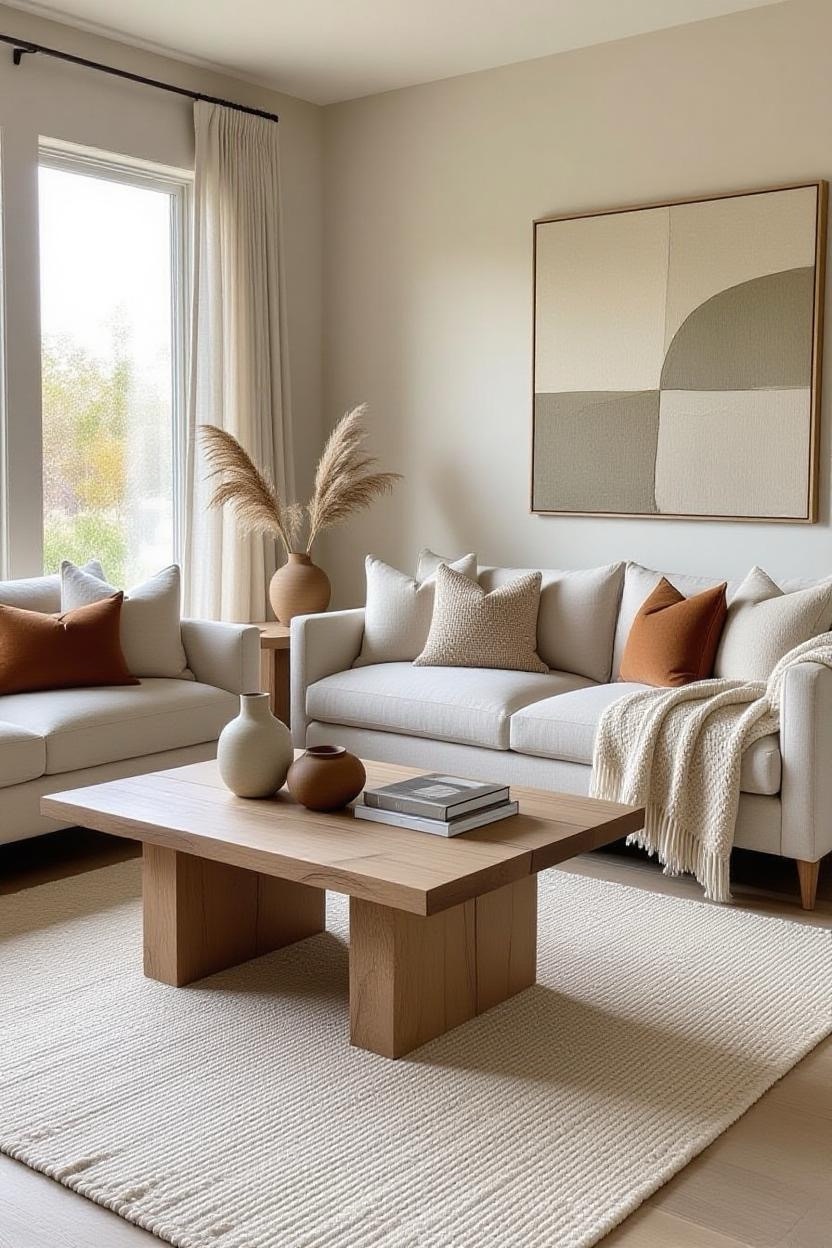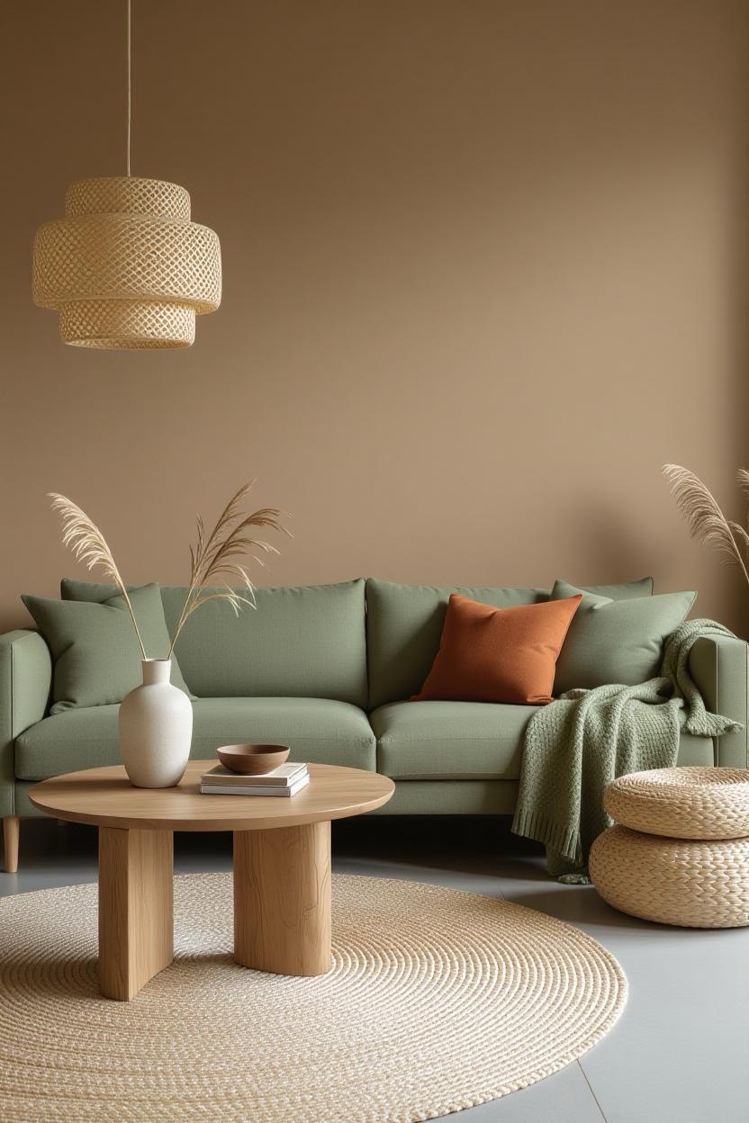 Choose warm neutrals like beige, taupe, and cream as your base colors, then layer in muted greens, browns, and grays for depth. These natural shades set the foundation for a serene organic modern living room.
