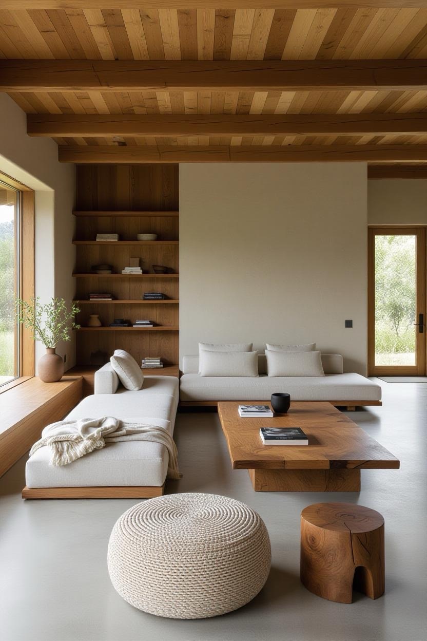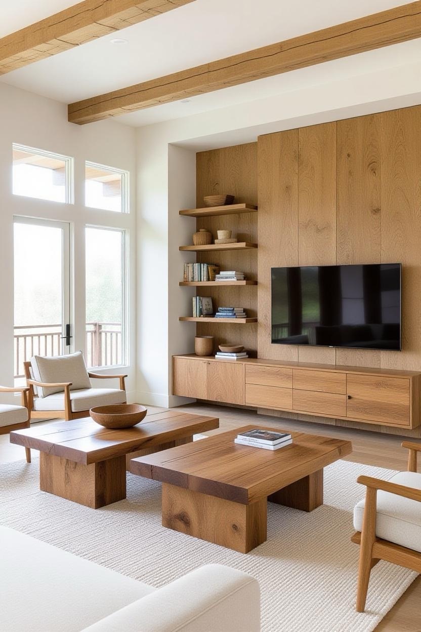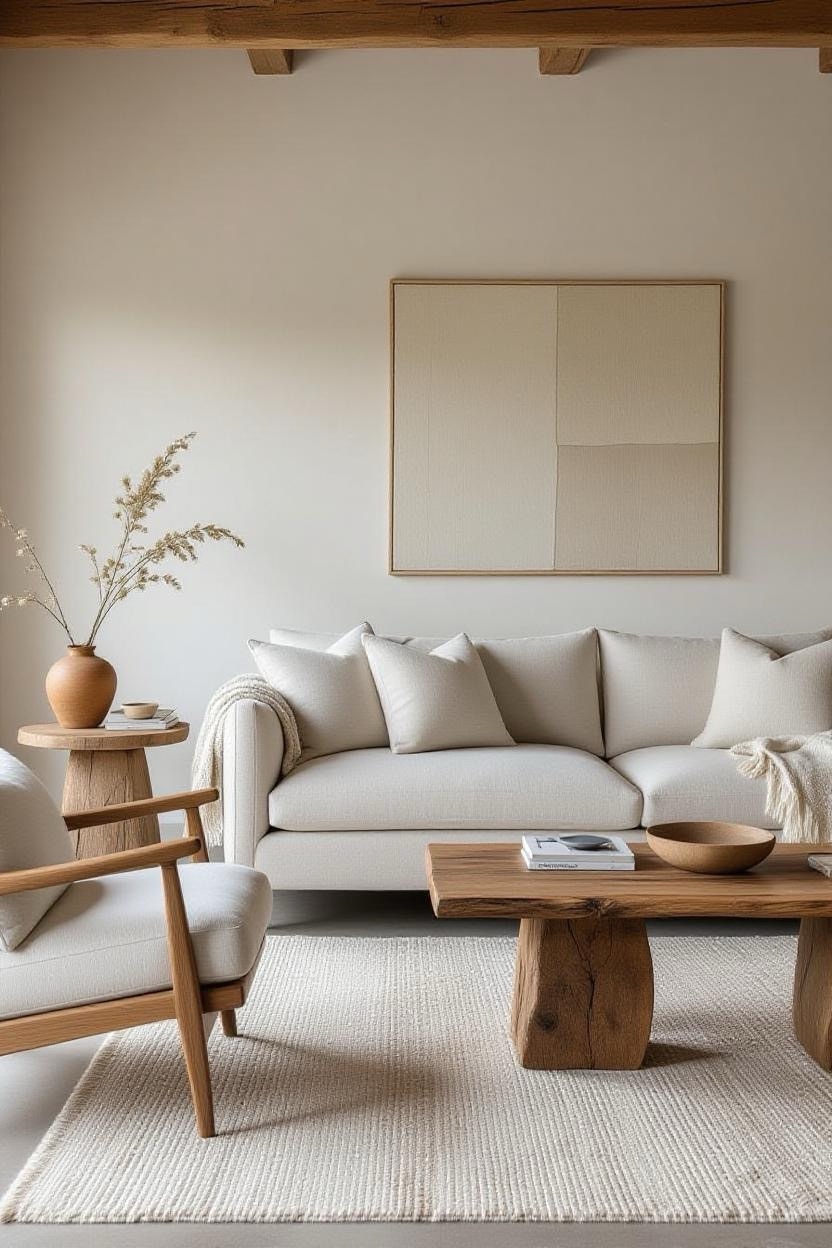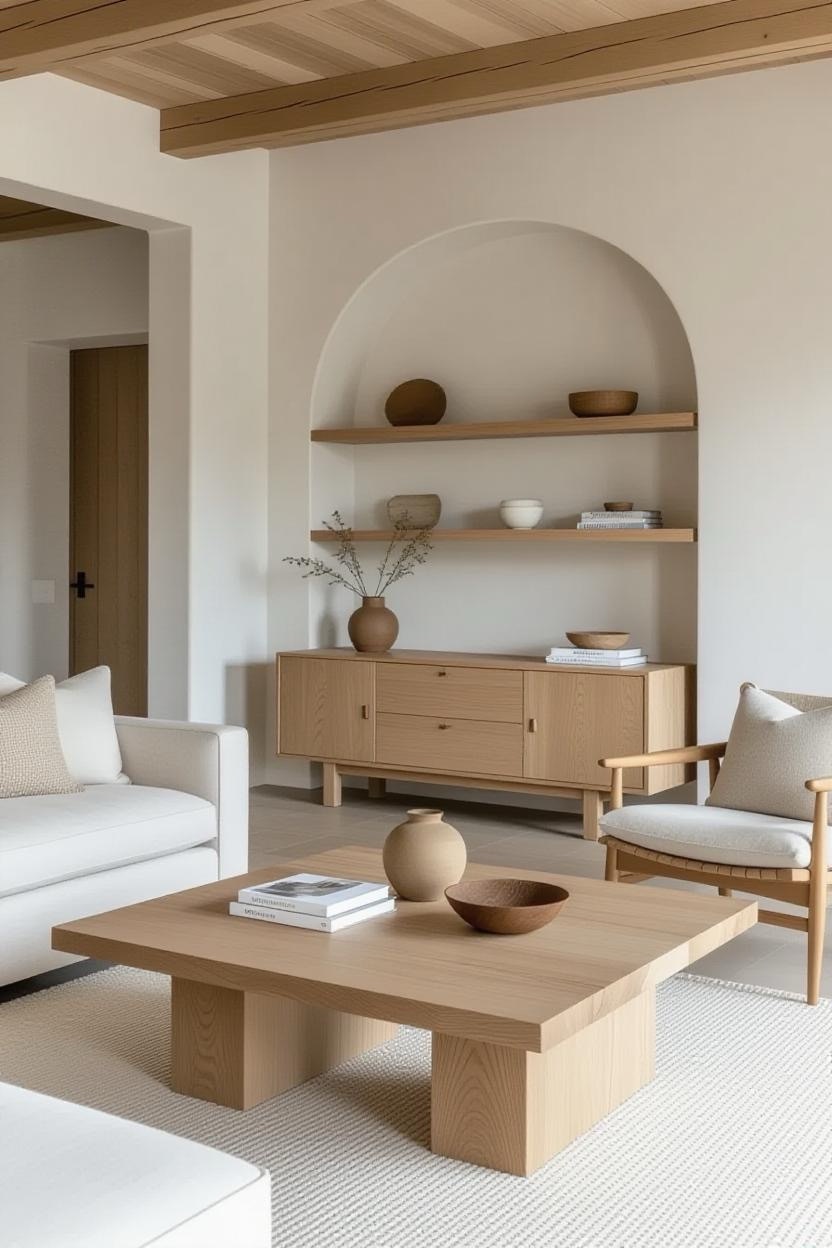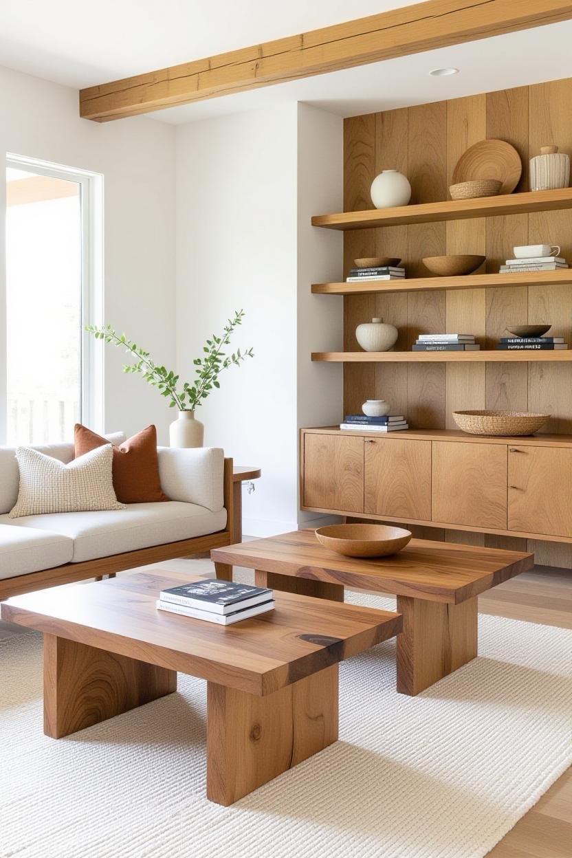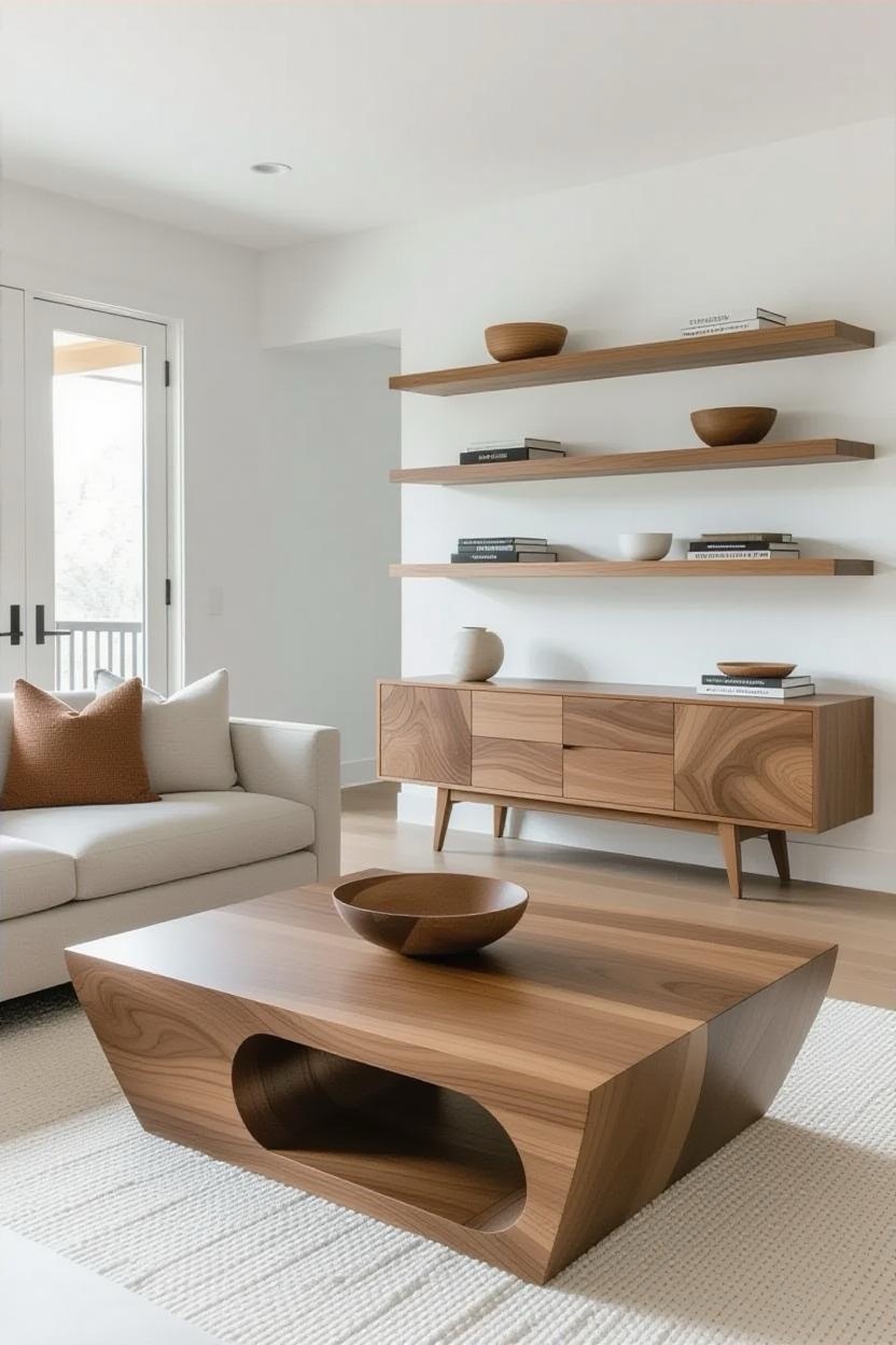 Incorporate wood through coffee tables, sideboards, or wall shelving. Opt for raw or lightly finished woods that show natural grain patterns, adding warmth and texture to your space.