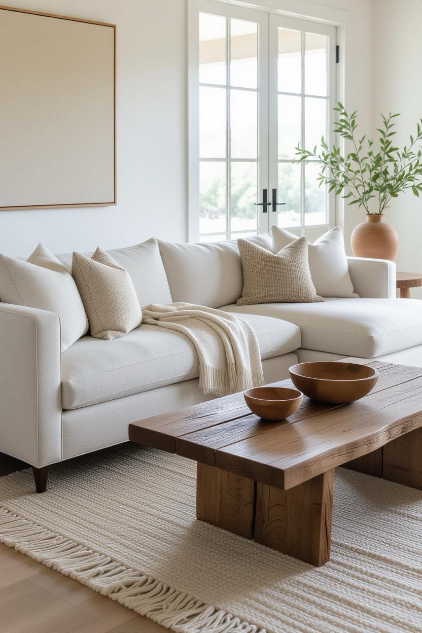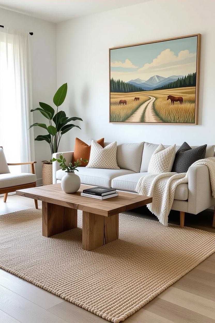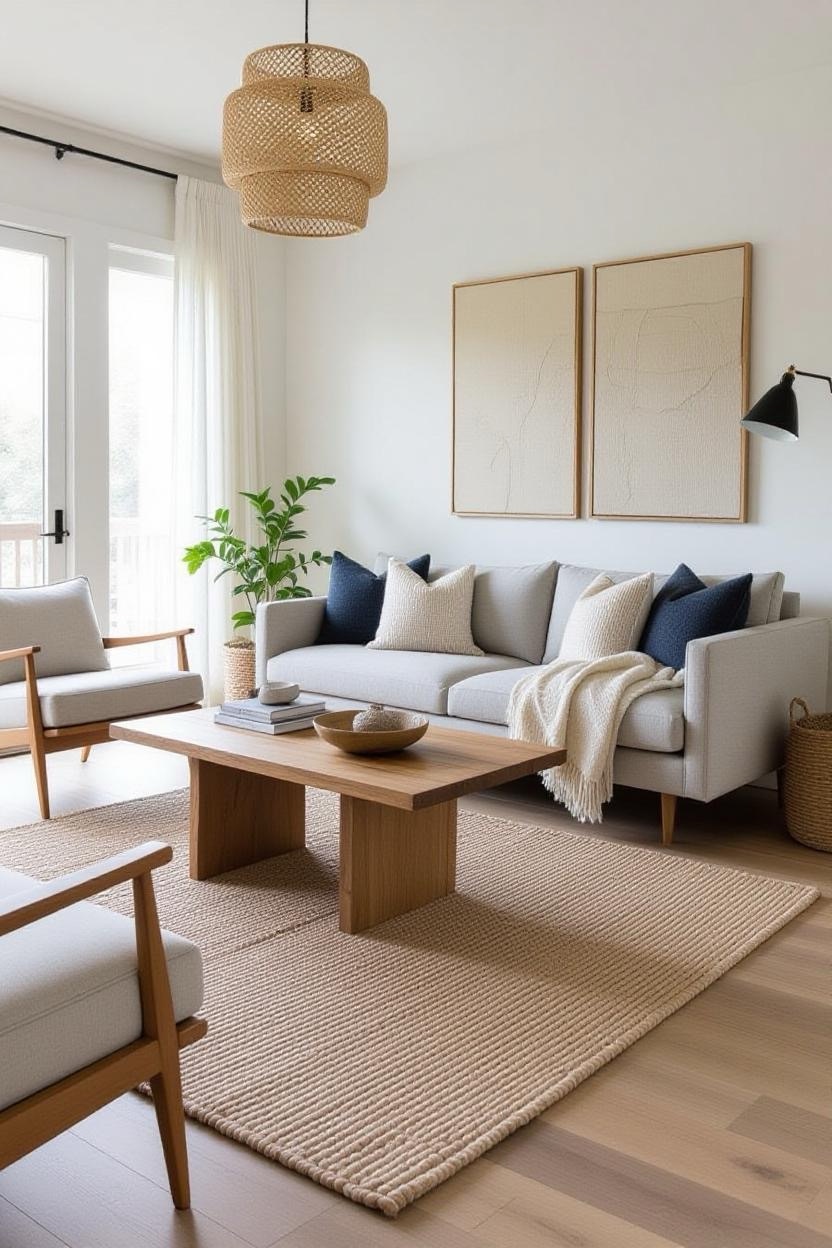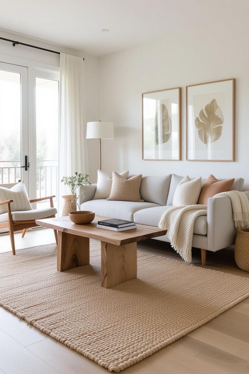 Anchor your living room with a jute, wool, or sisal rug. The texture adds a cozy organic feel while grounding the modern furniture in the space.