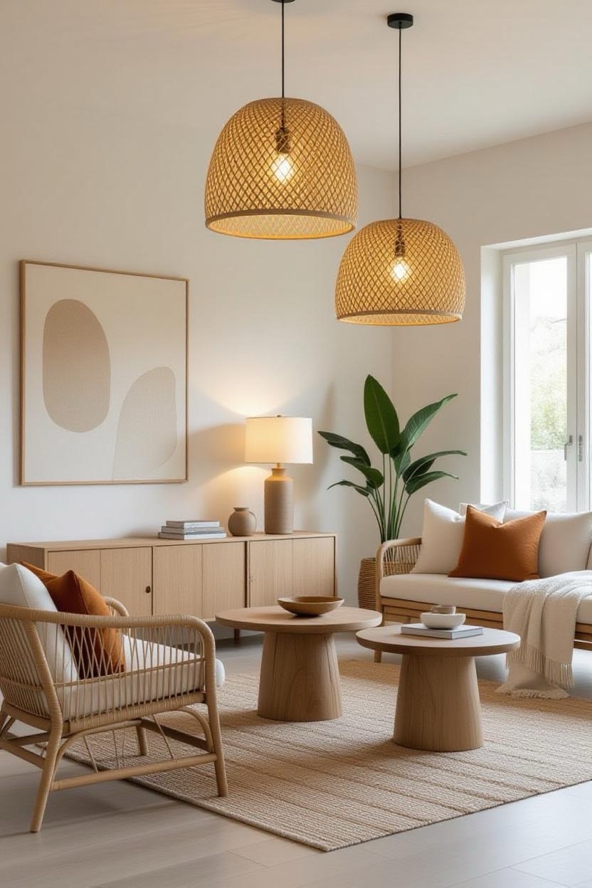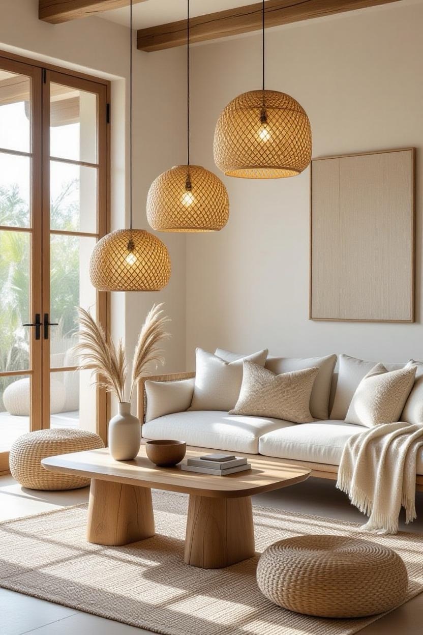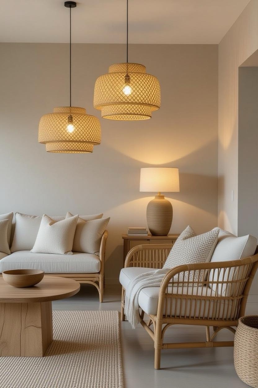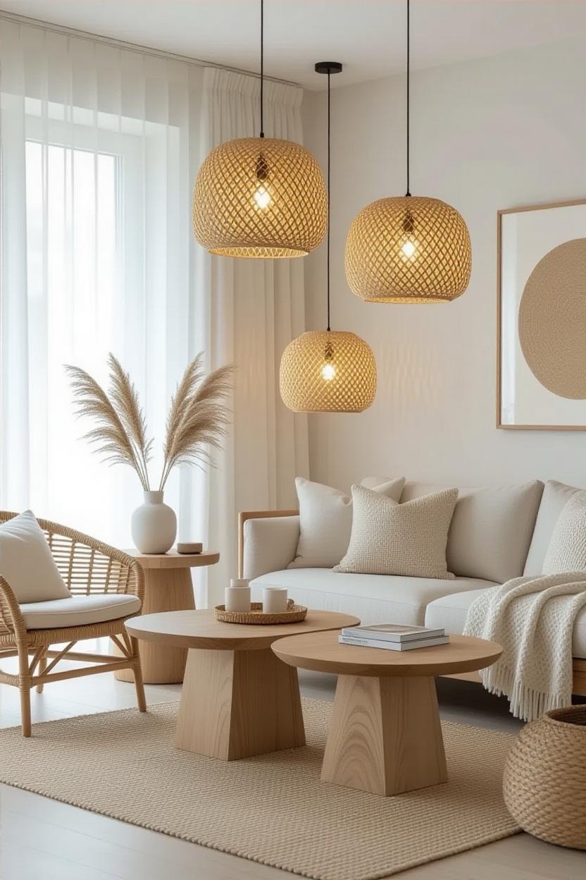Go for lighting with natural finishes, such as rattan pendants, woven lampshades, or sleek wooden bases. The glow they emit softens the modern aesthetic.