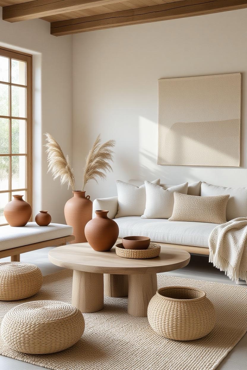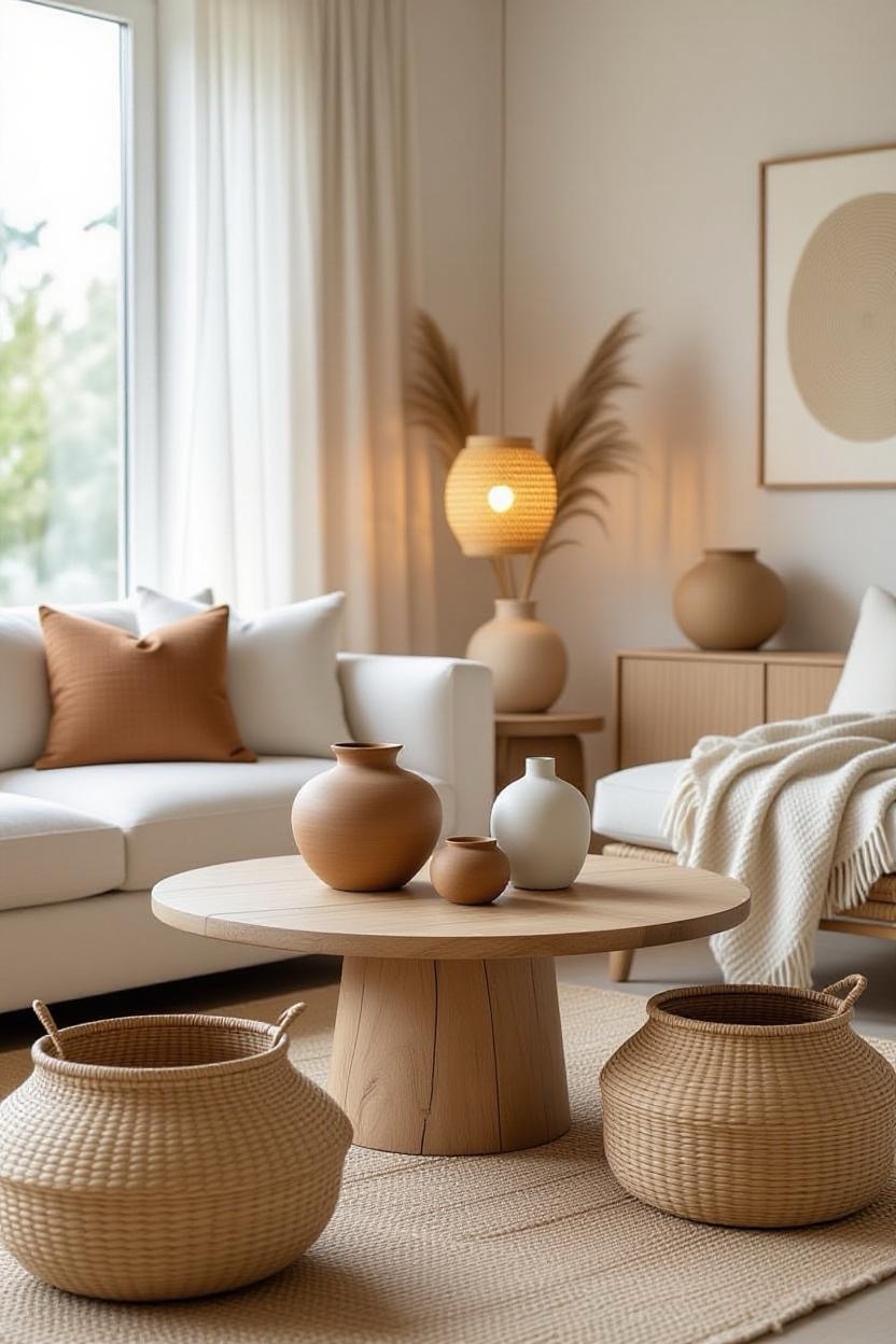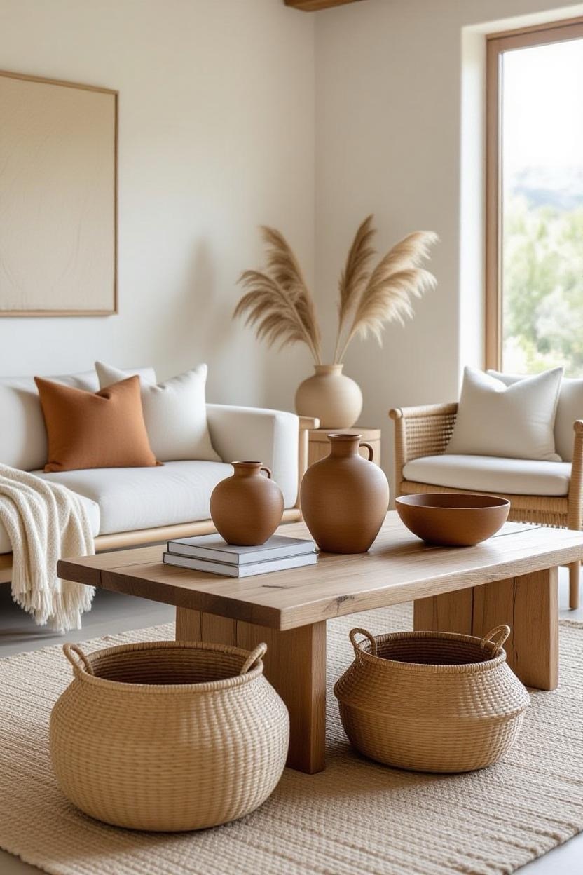 Incorporate pottery, woven baskets, or ceramic vases to add natural charm. These details give the room personality while staying aligned with the organic theme.