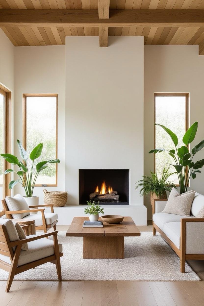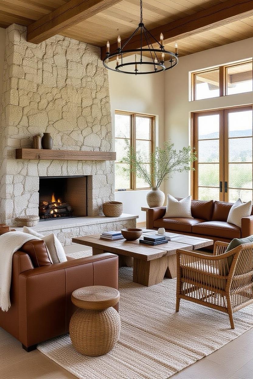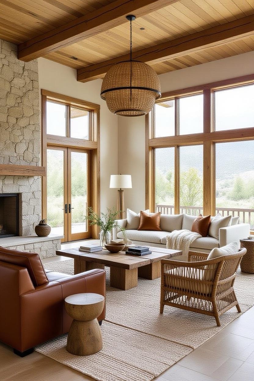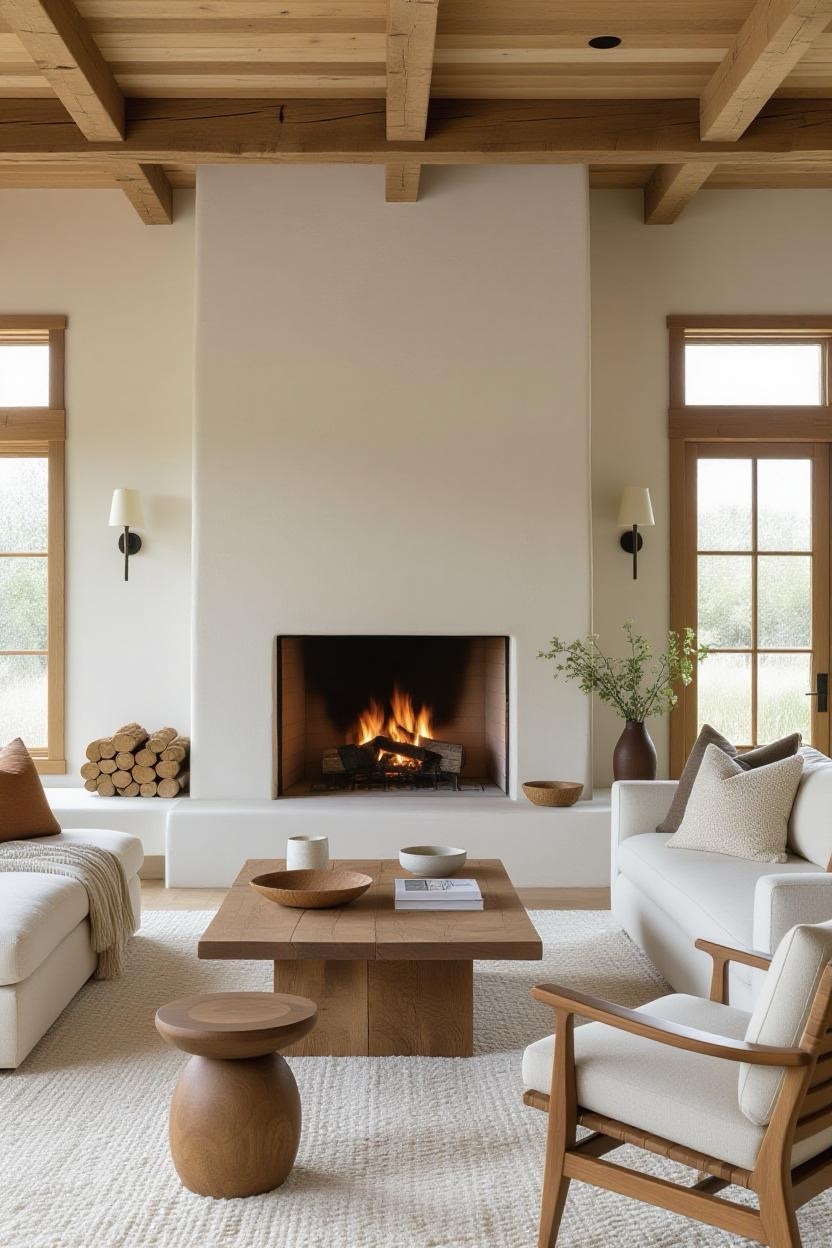 If possible, include a fireplace with a stone or plaster finish. It creates a warm, grounding focal point while enhancing the organic aesthetic.