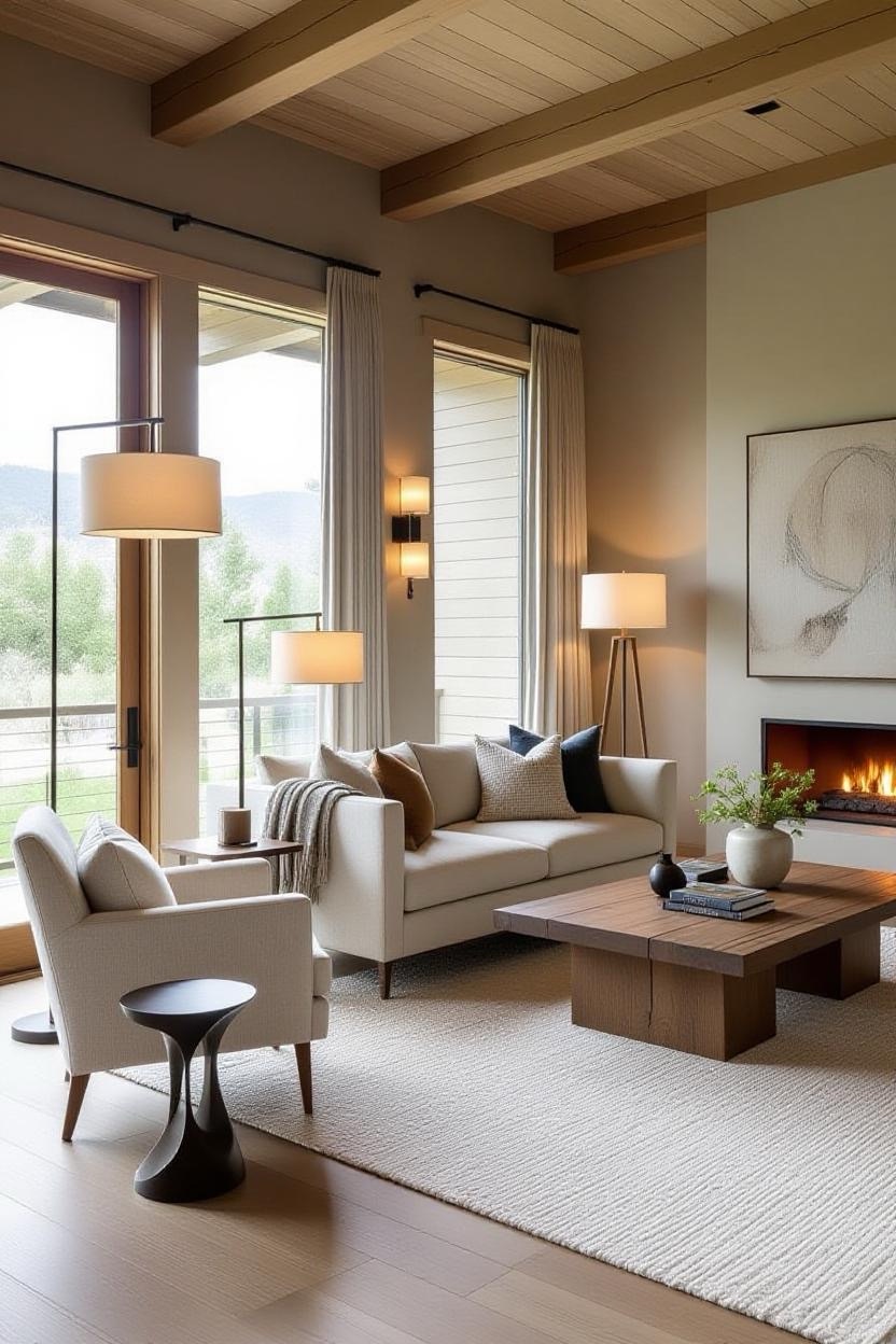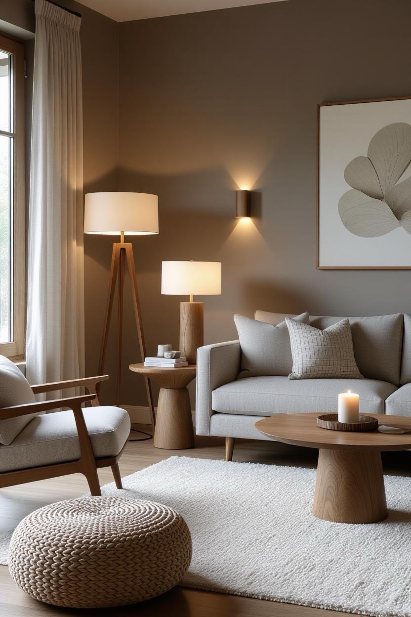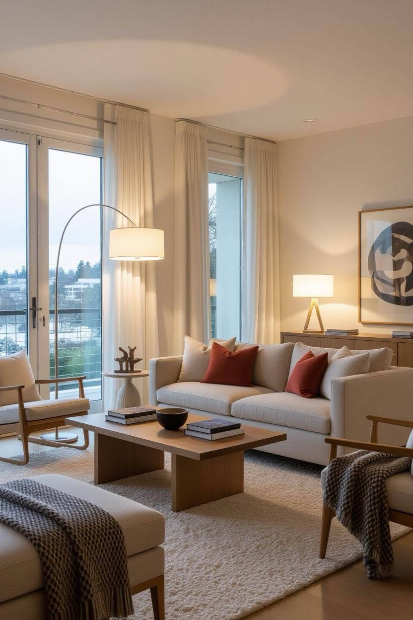 Use floor lamps, sconces, and table lamps to create cozy pools of light. Layering lighting prevents the room from feeling stark or overly modern.