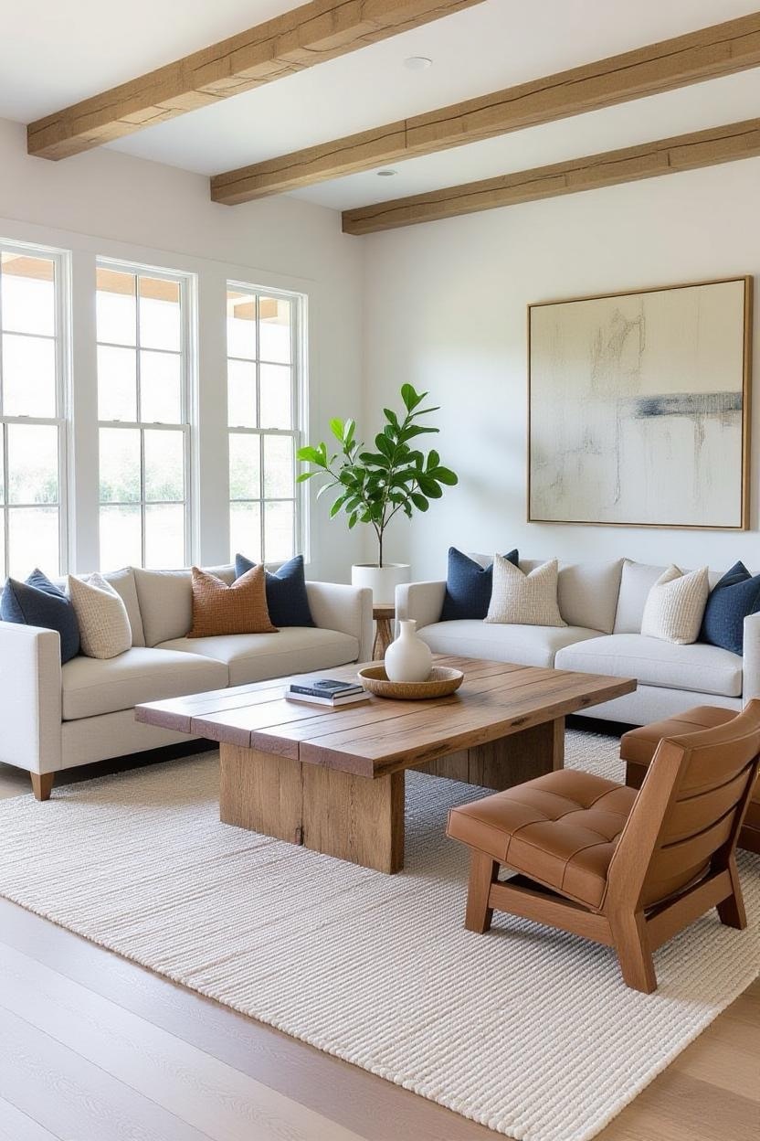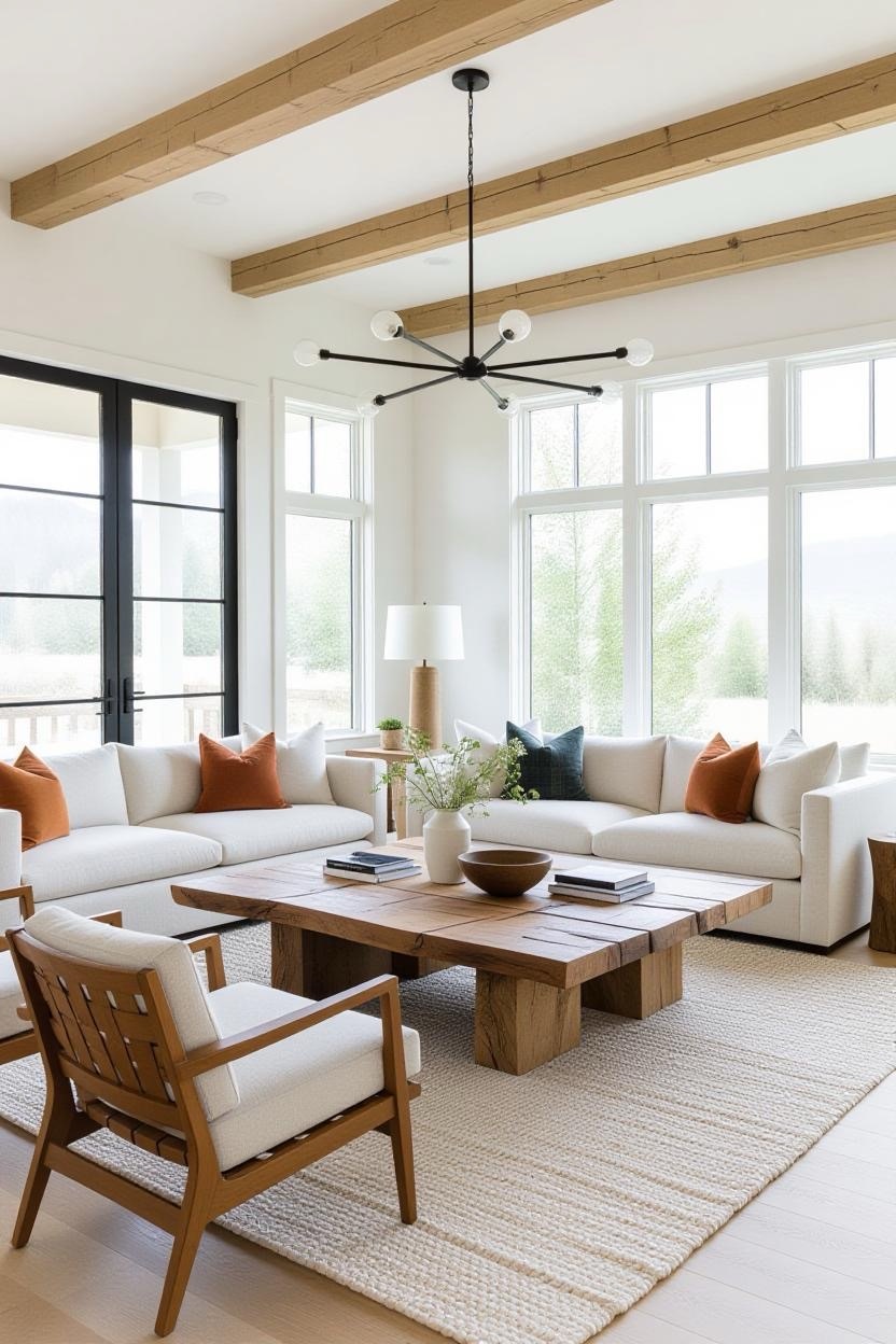 Choose a reclaimed wood or live-edge table to act as a centerpiece. The rugged look pairs beautifully with clean-lined sofas and chairs.