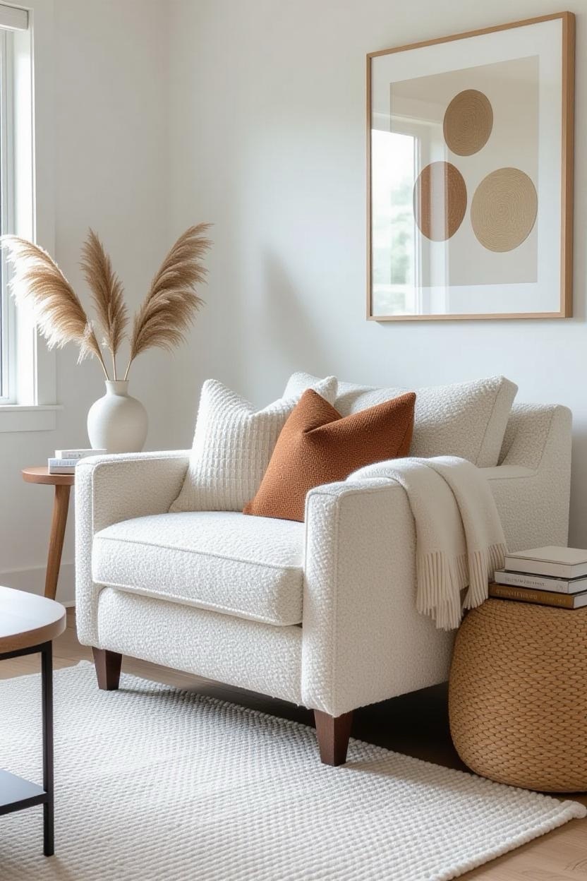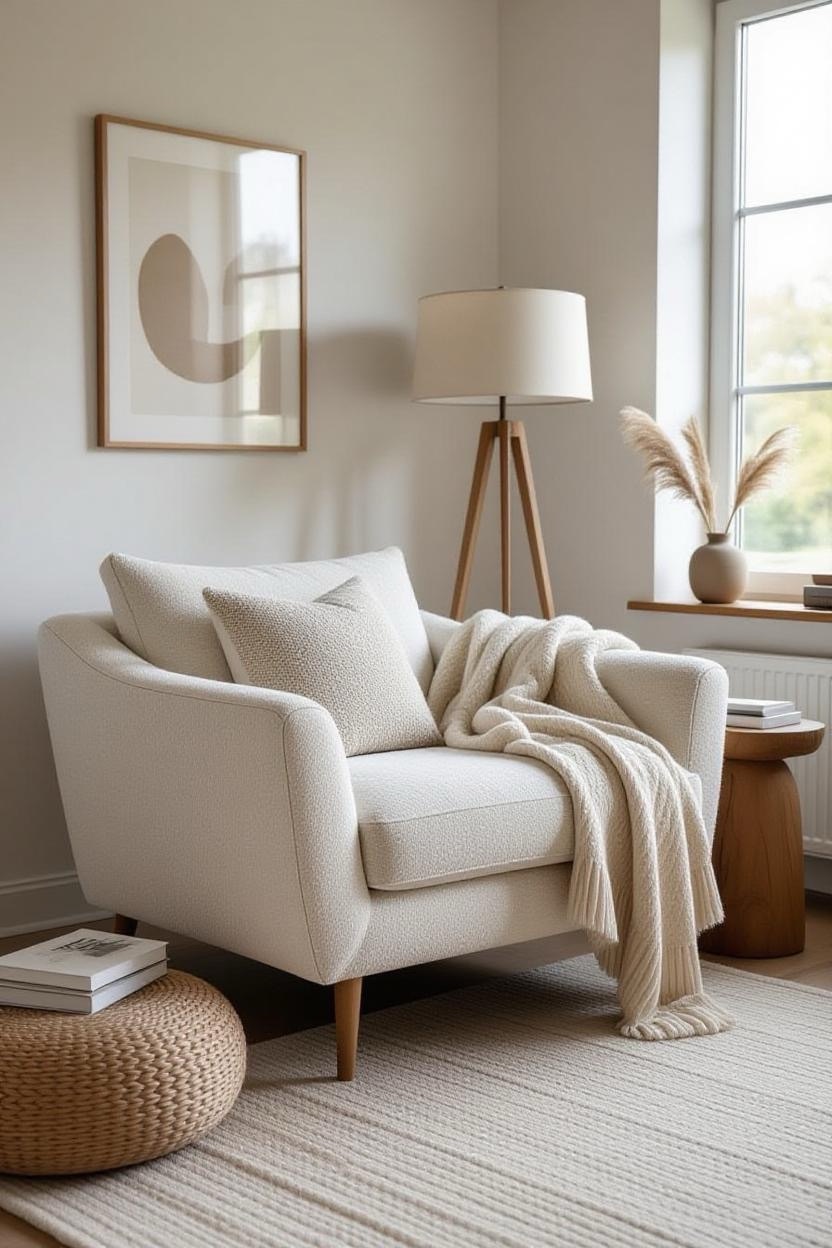 Add a cozy armchair in a textured fabric like boucle or soft leather. This brings both comfort and a stylish focal point to your living room.