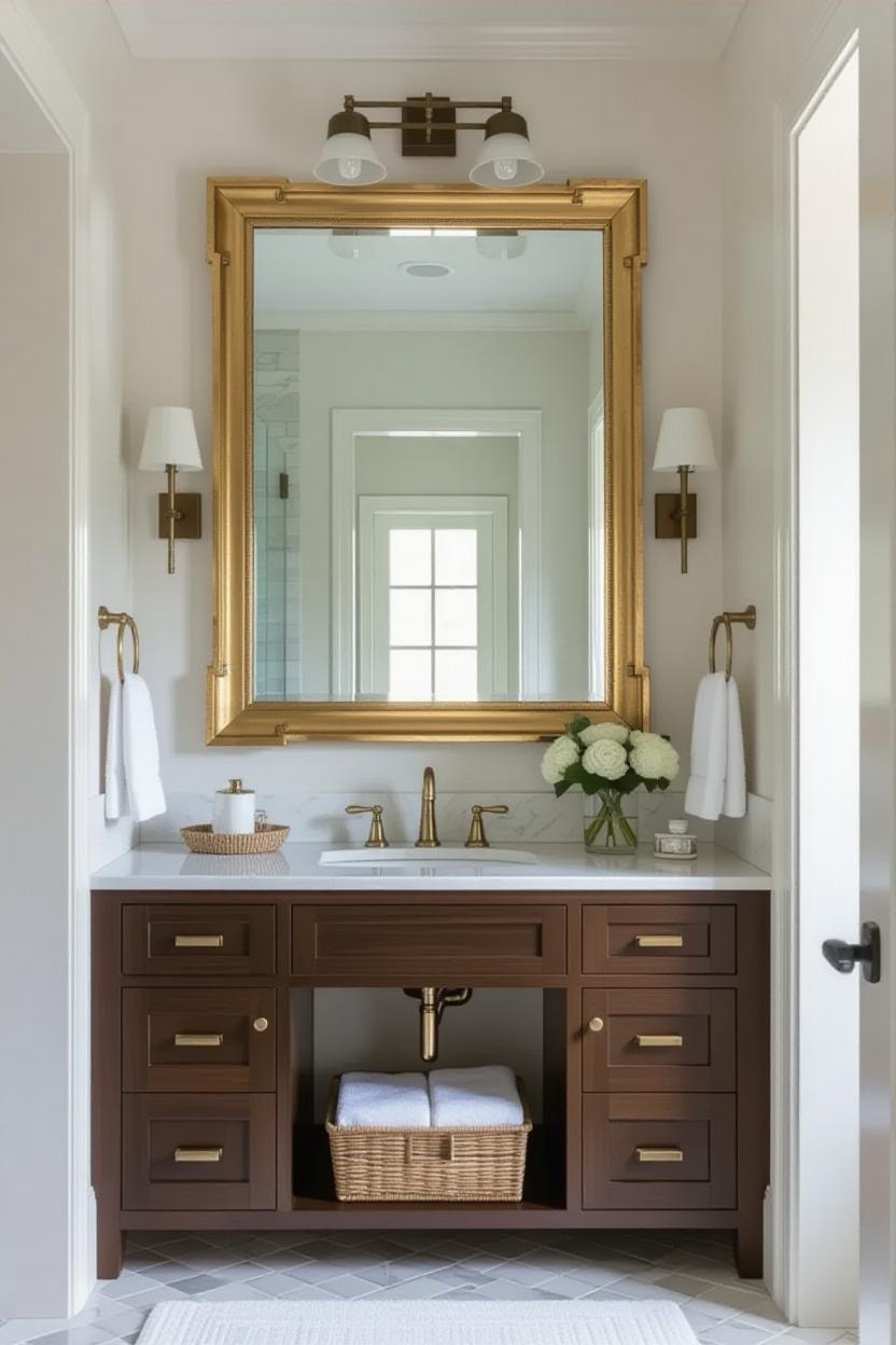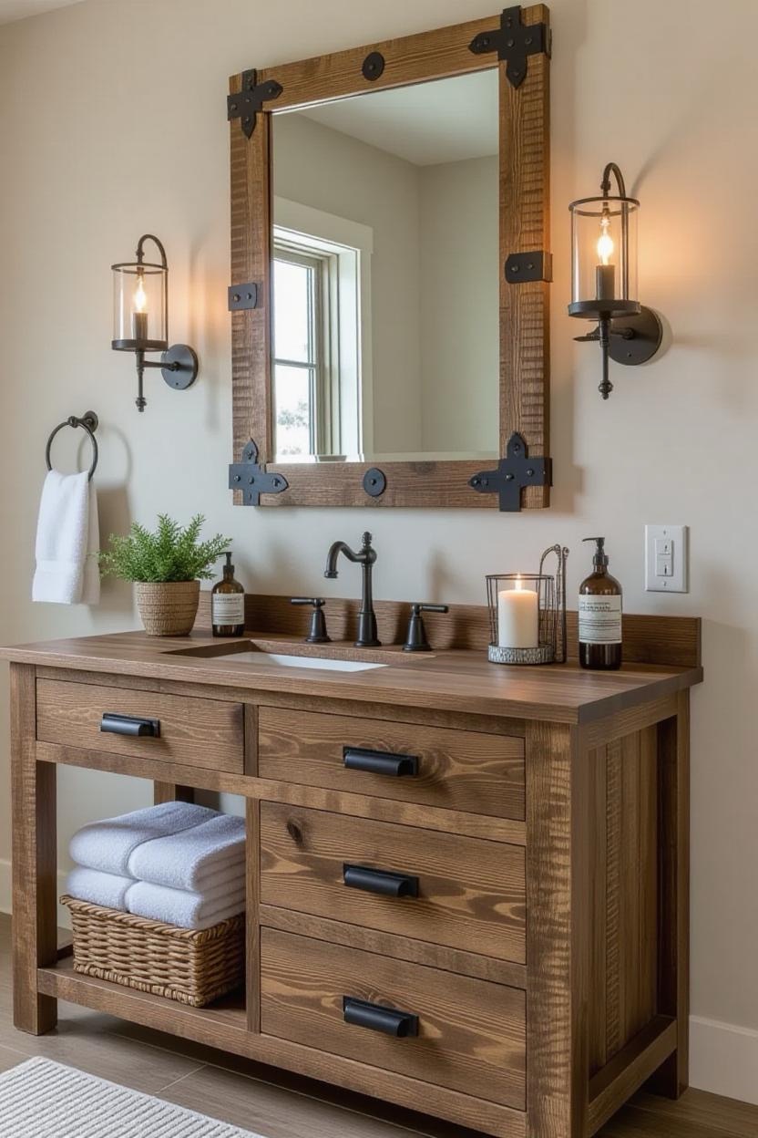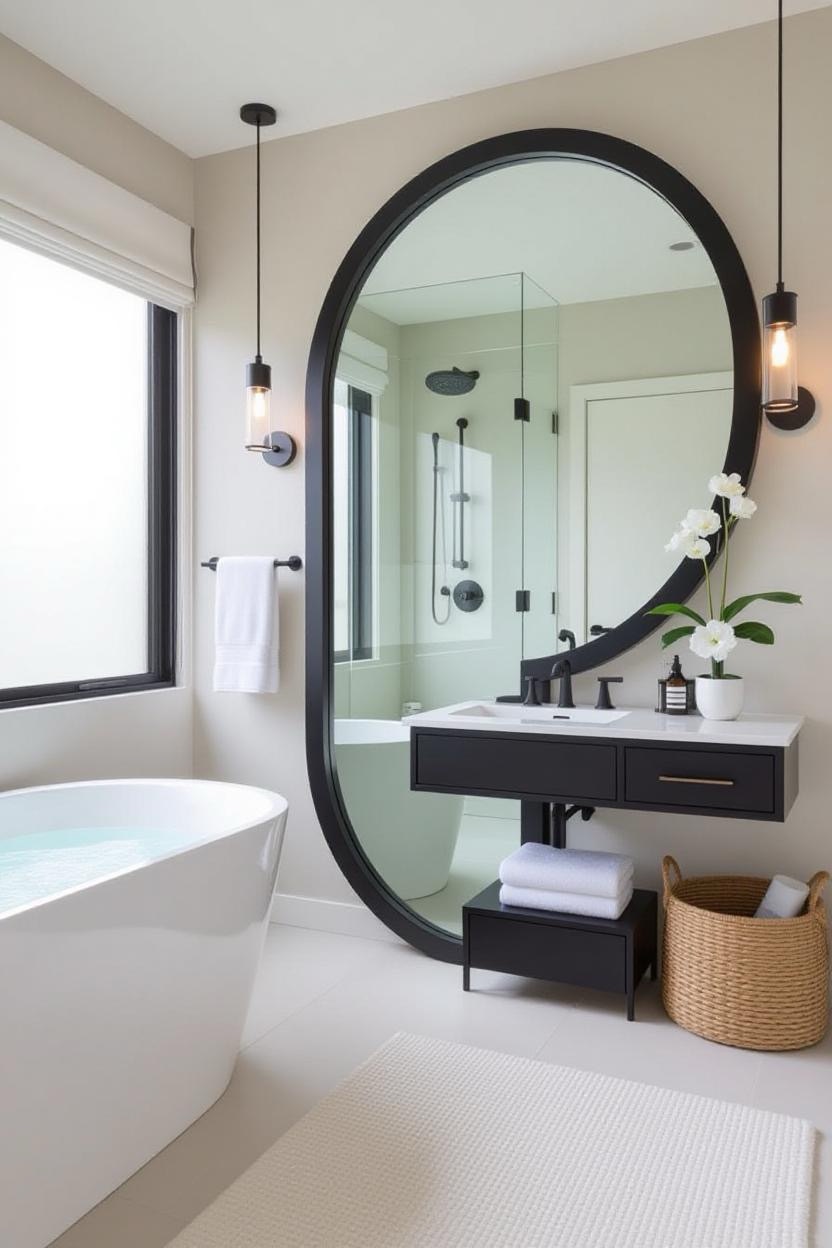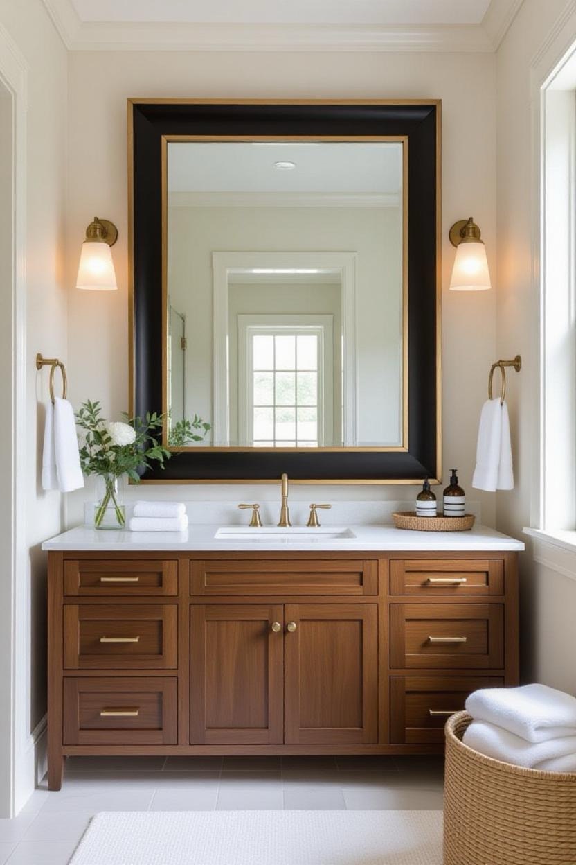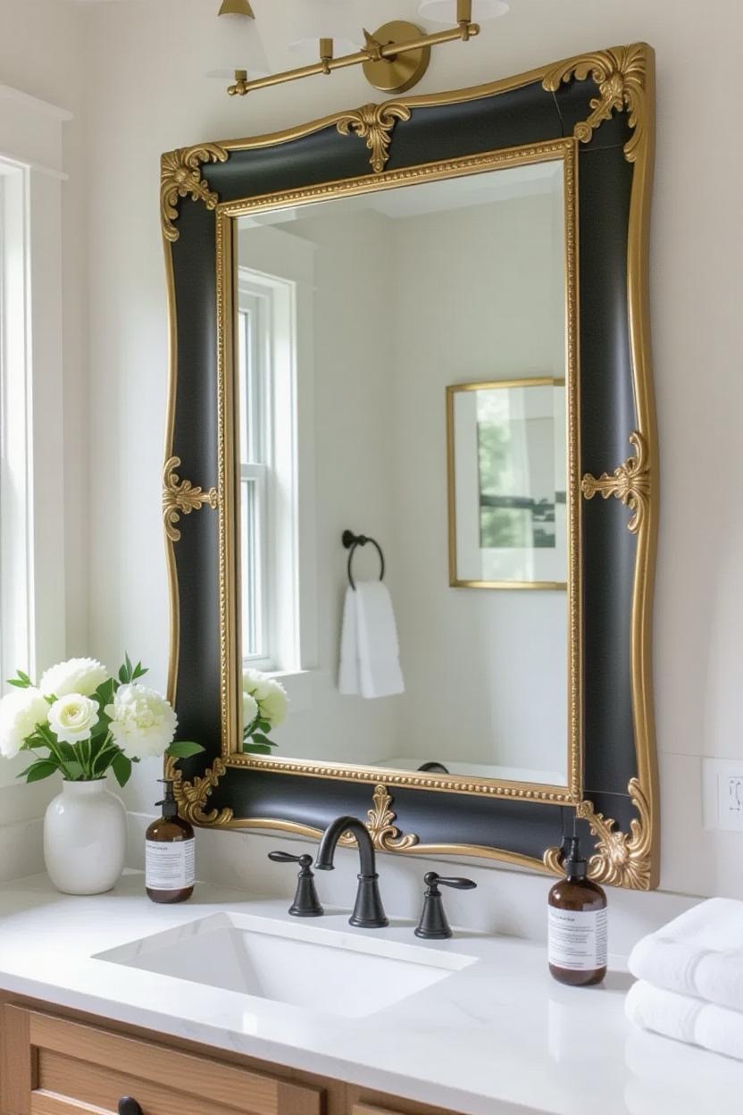 An oversized statement mirror instantly adds glamour while creating the illusion of more space. Choose a bold frame, like gold, matte black, or wood, to tie in with your overall theme. This simple upgrade brings both beauty and function to your bathroom walls.