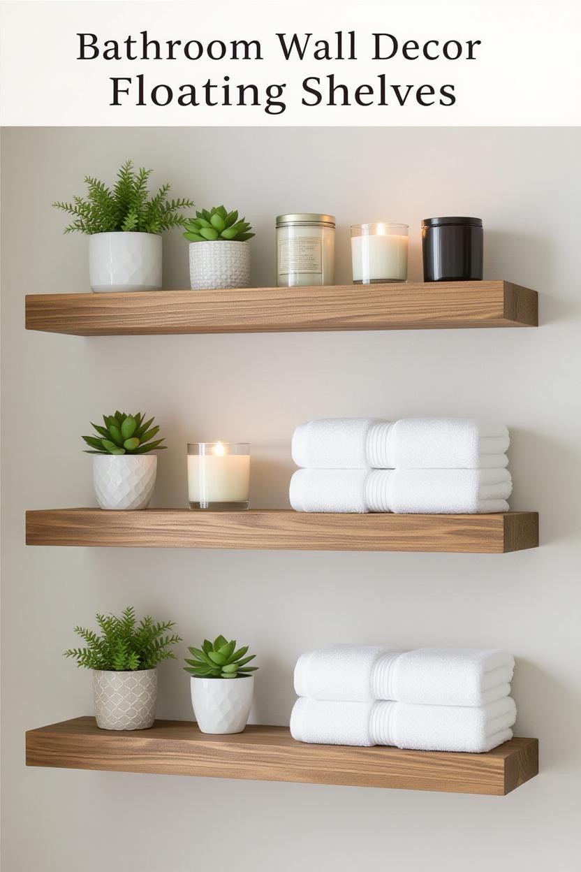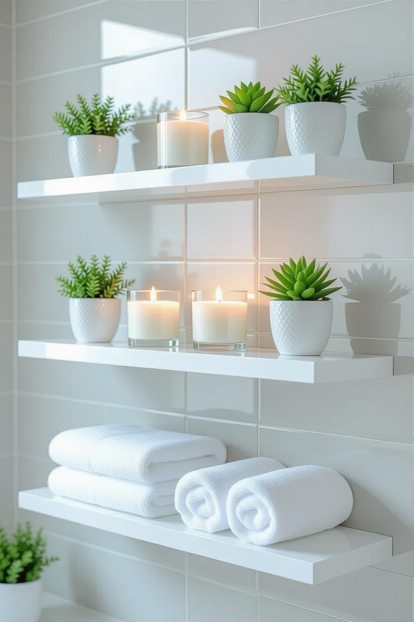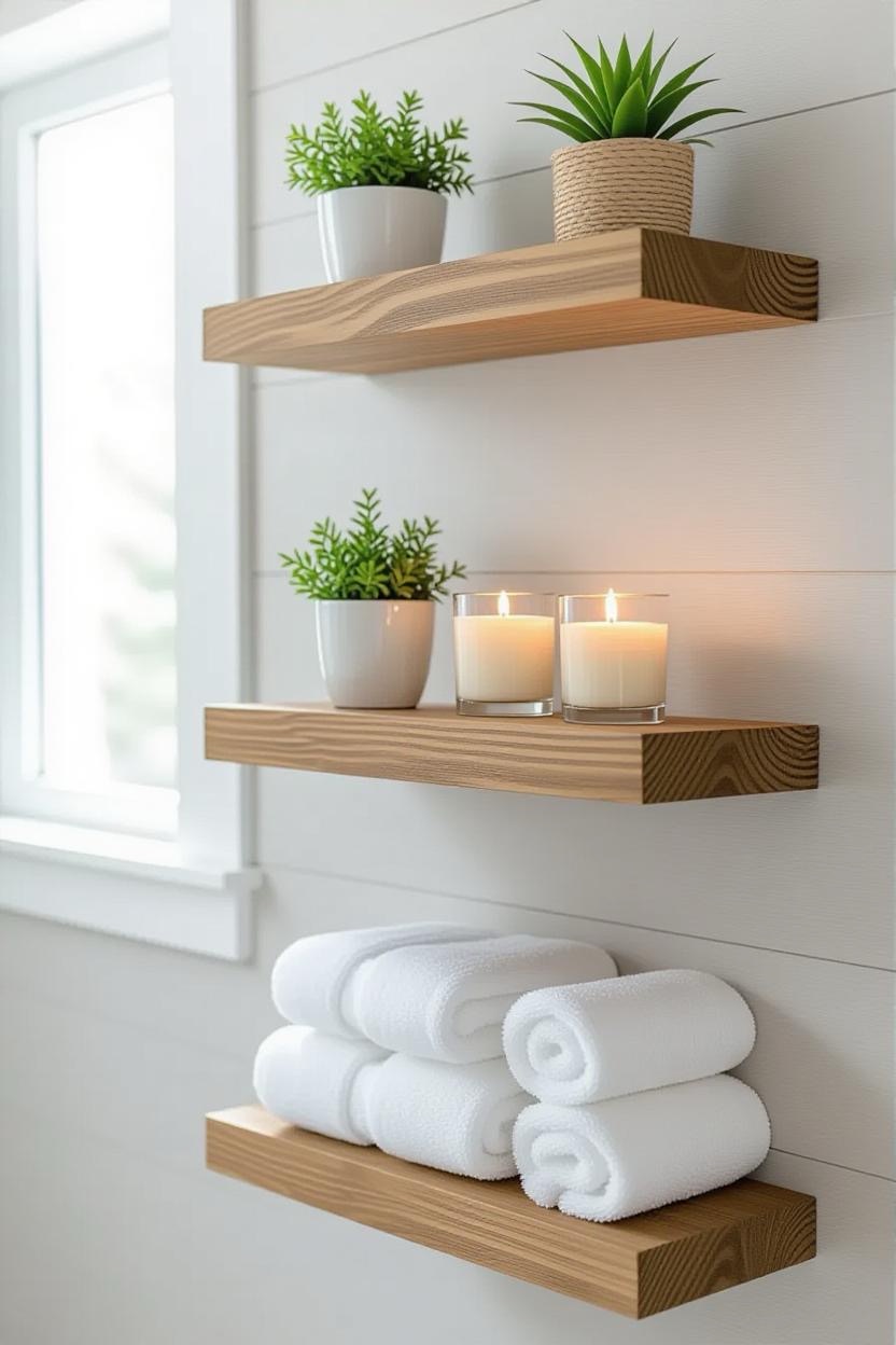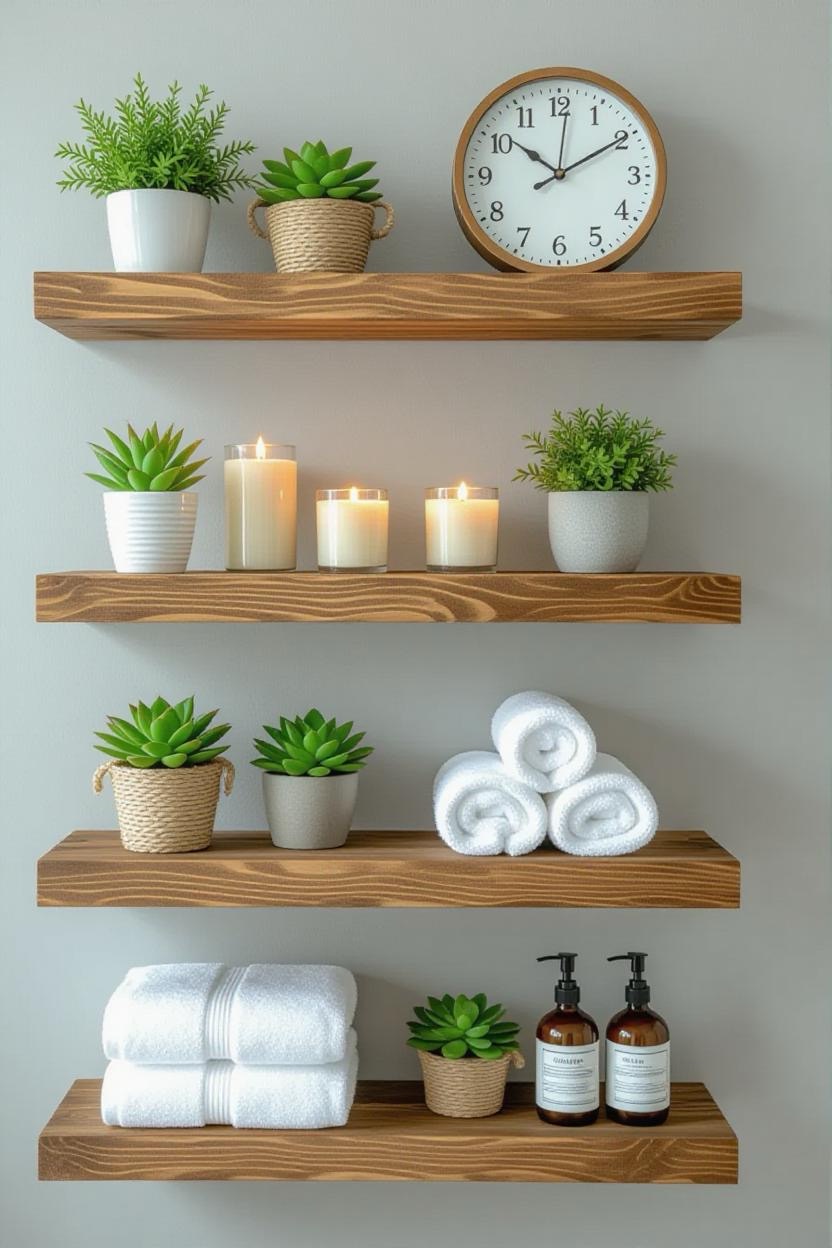 Floating shelves are perfect for both storage and style. Display small plants, candles, or rolled towels for a functional yet decorative touch. Choose reclaimed wood for a rustic look or sleek finishes for a modern feel.