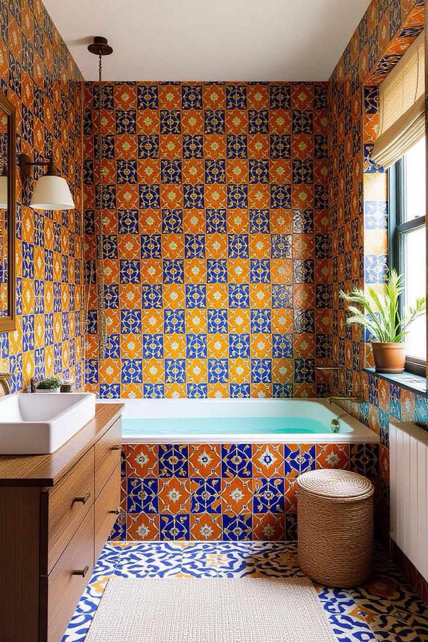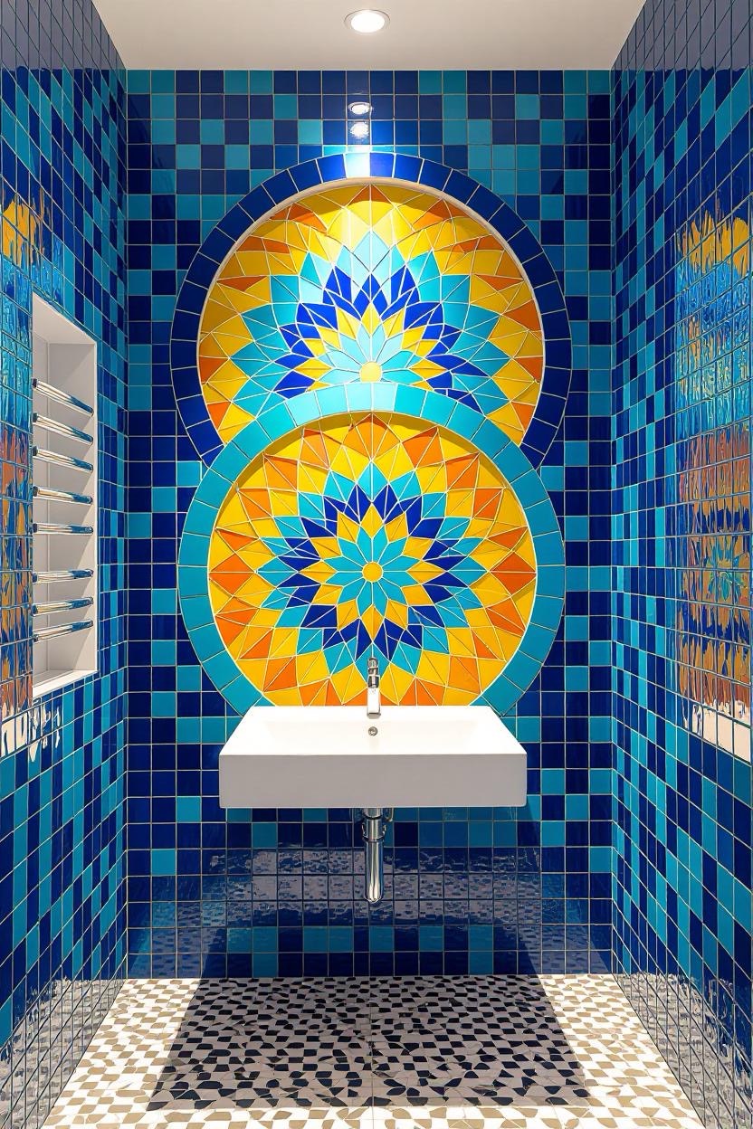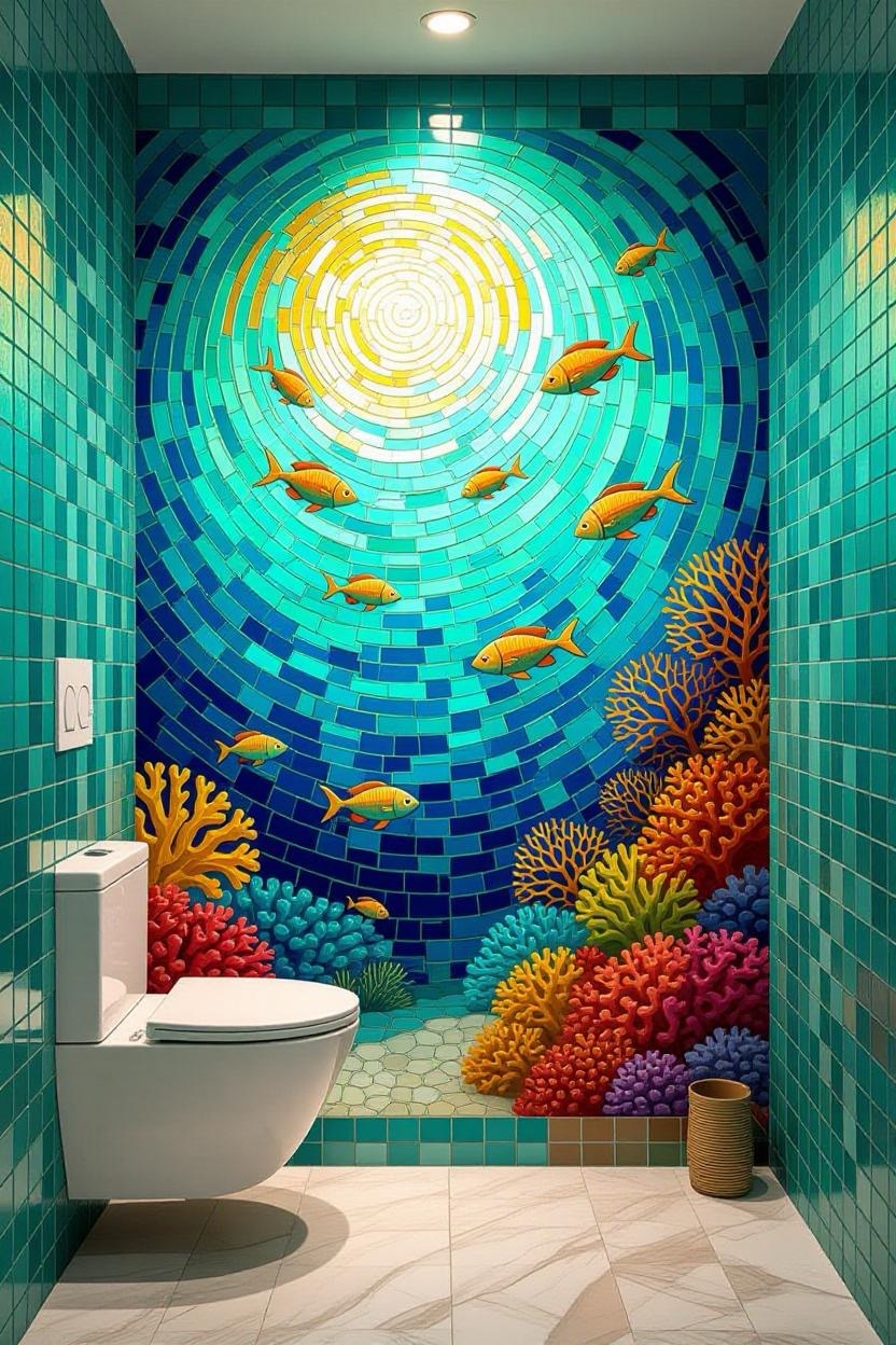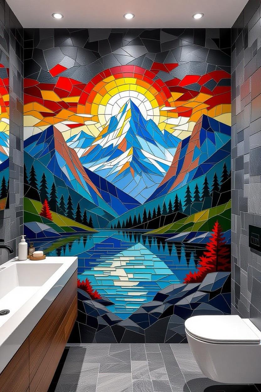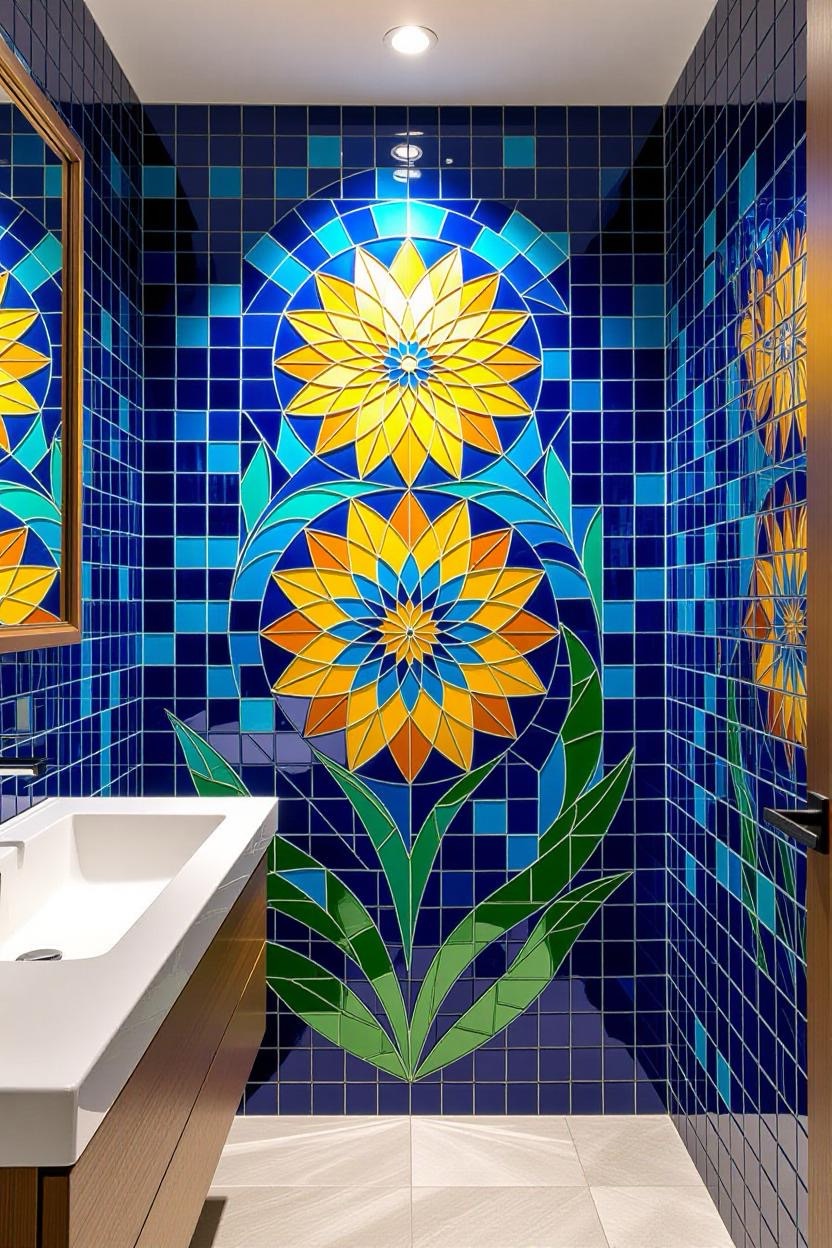 Create a mosaic mural for an artistic touch. You can use glass, ceramic, or stone tiles in bold colors to create stunning patterns or images.