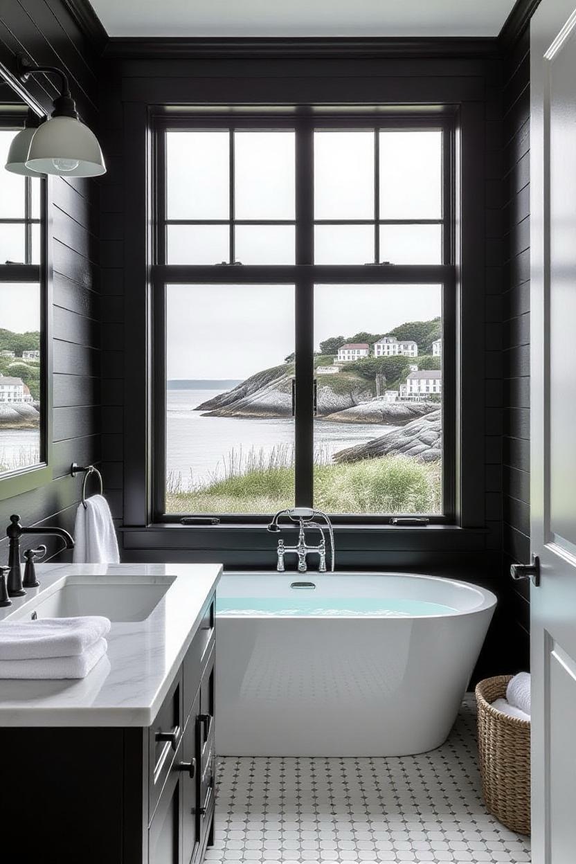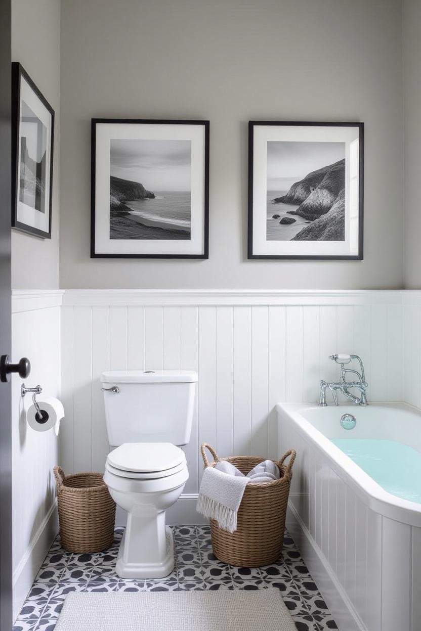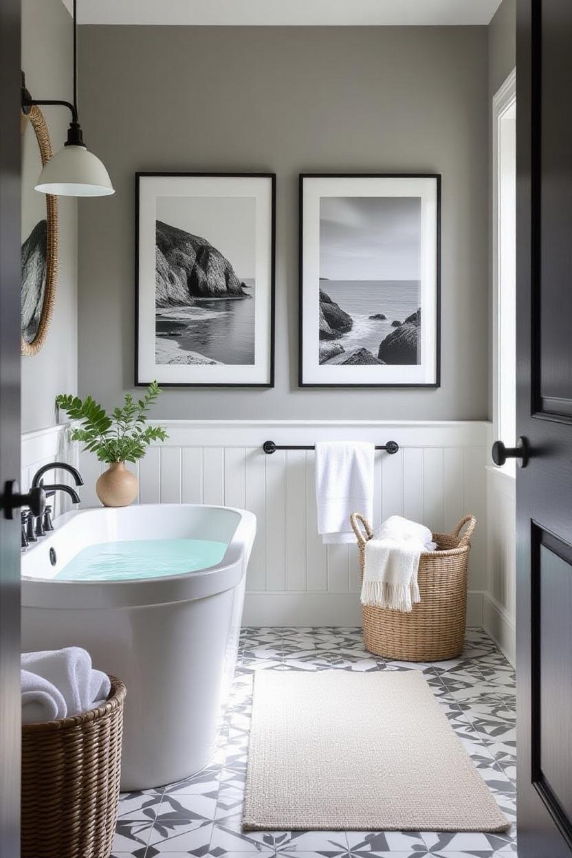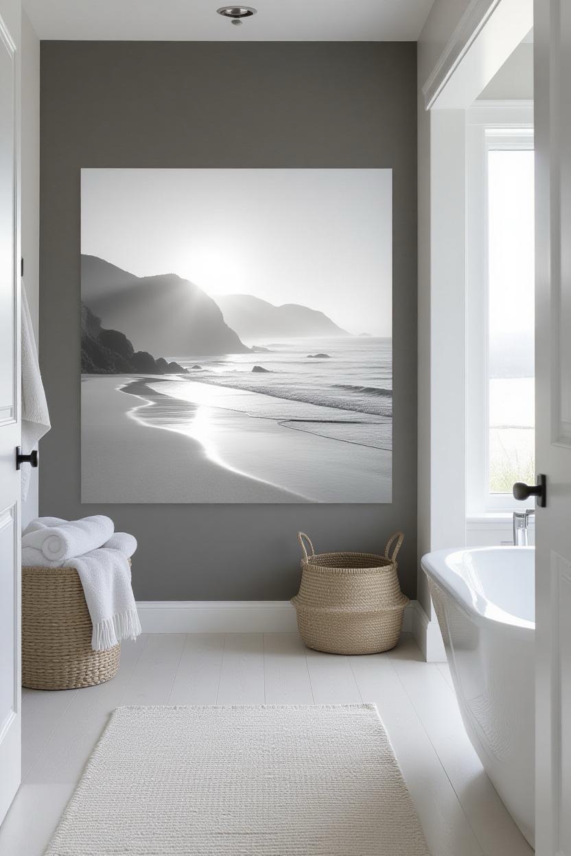 For a chic, timeless look, hang black-and-white photography on your bathroom walls. Coastal scenes, architectural shots, or portraits work especially well in this setting.