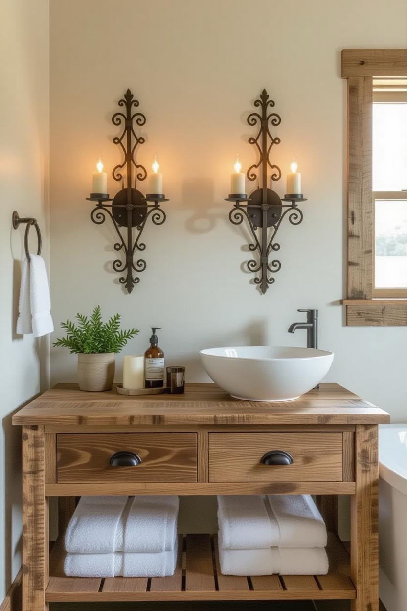 Install wall-mounted candle holders to add warmth and ambiance. Choose metallic finishes for elegance or rustic holders for a cozy, farmhouse feel.
