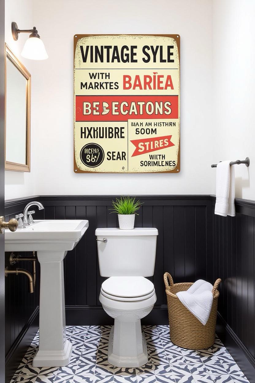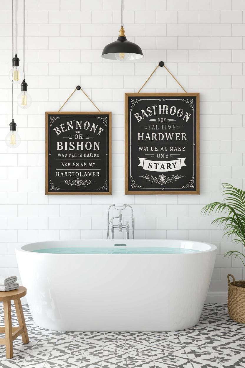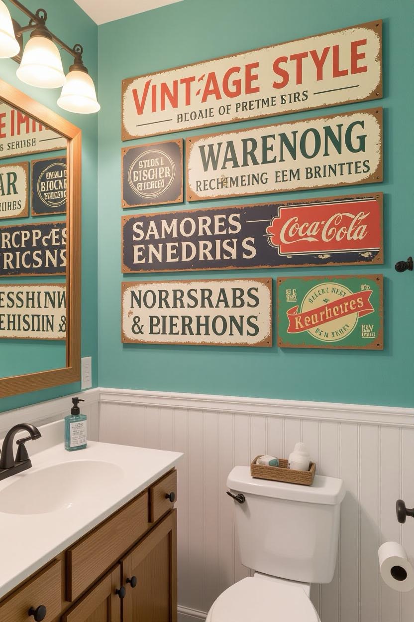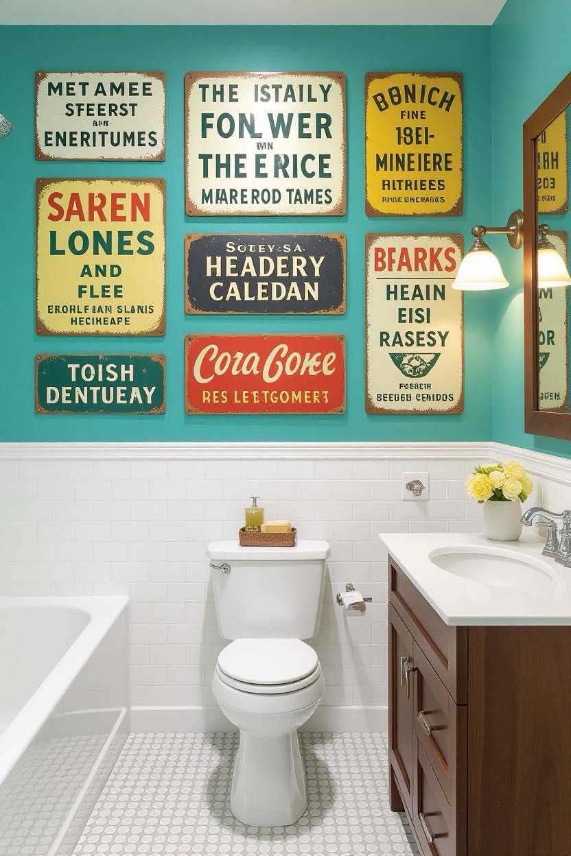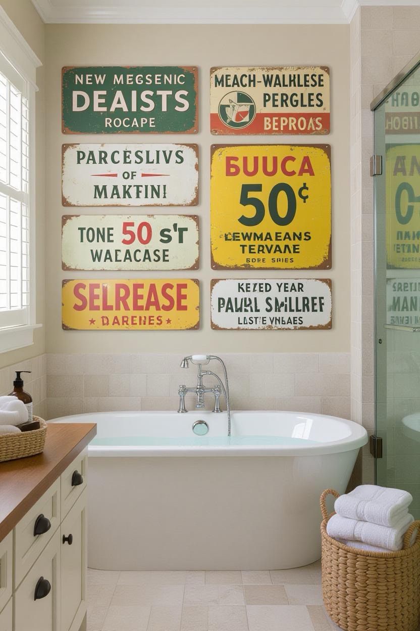 Add character to your bathroom with vintage-style signs or typography art. Quirky sayings or retro advertisements can bring personality and humor to the space.