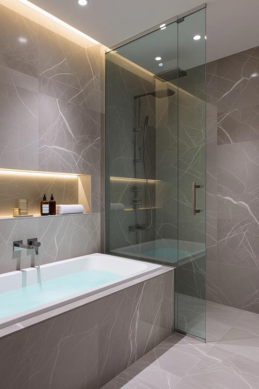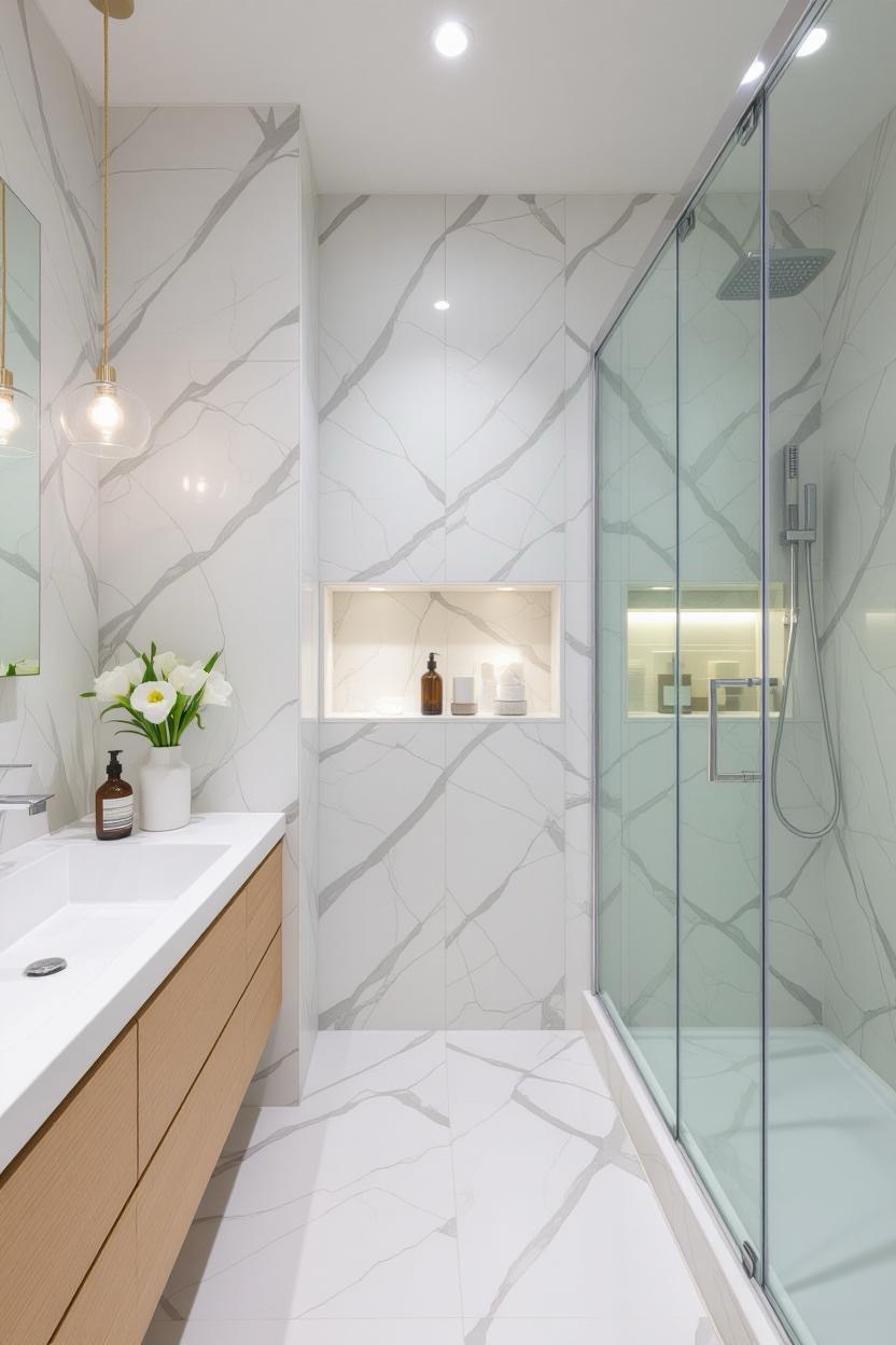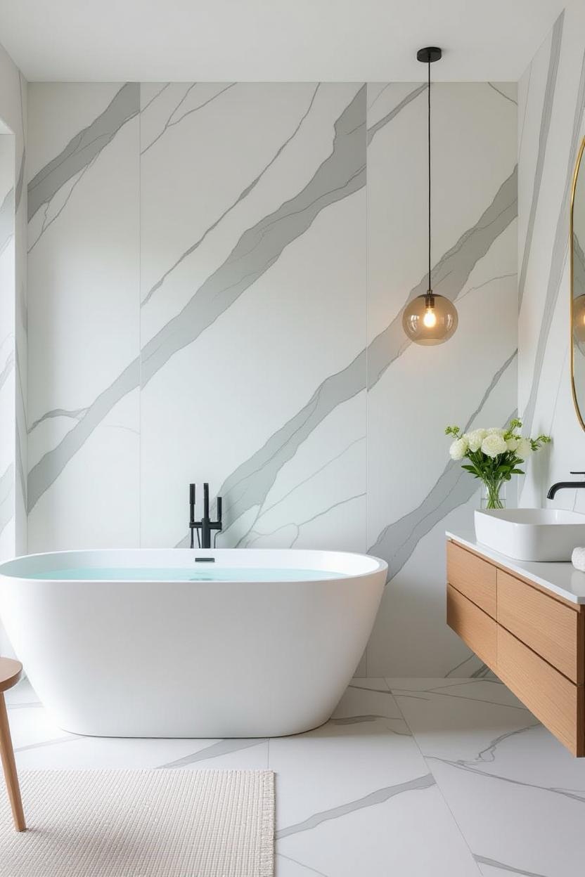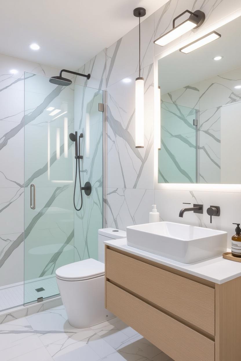 Faux marble wall panels offer a luxurious appearance without the high cost of real marble. This sleek look is perfect for modern and minimalist bathrooms.