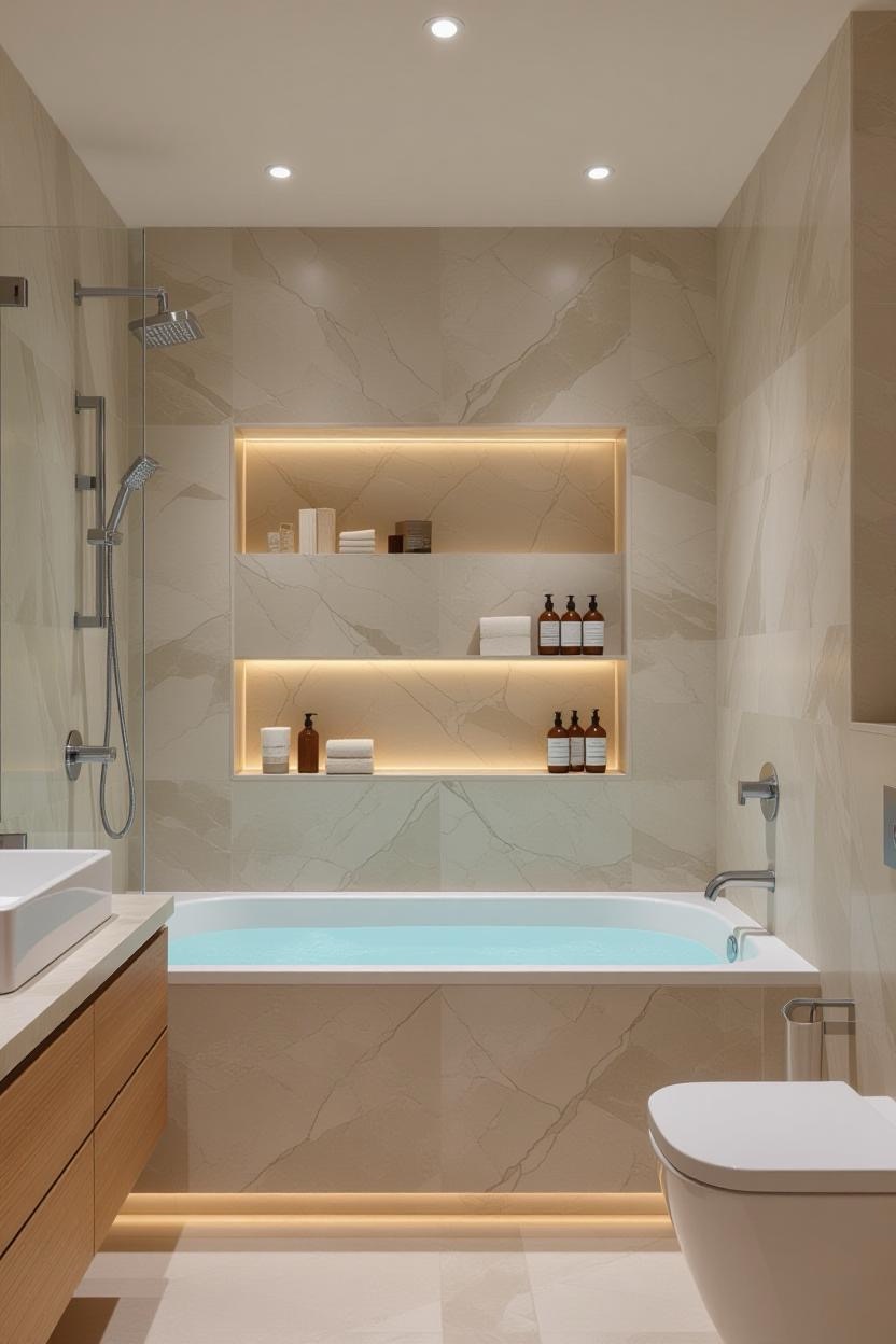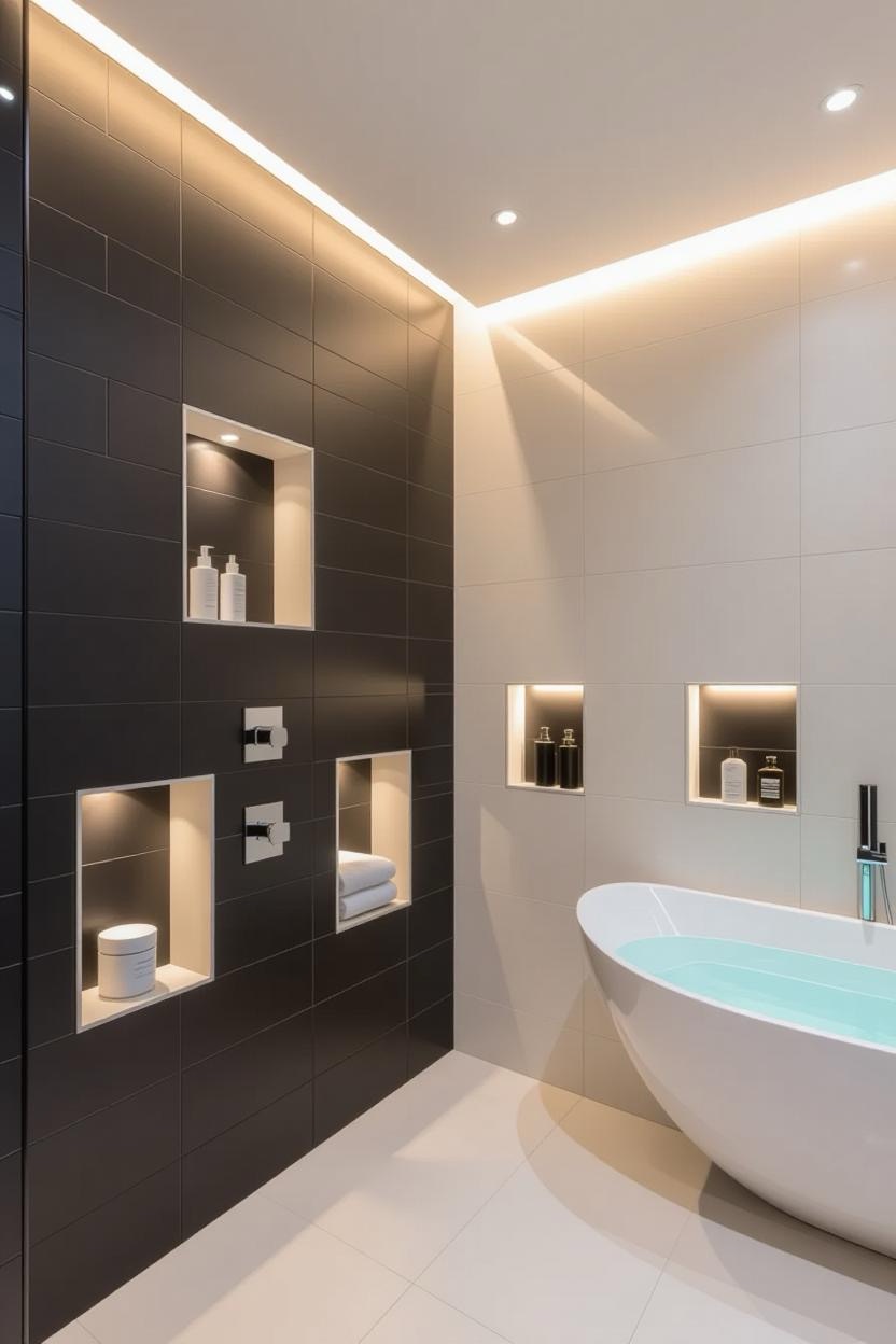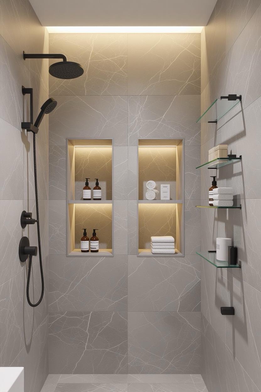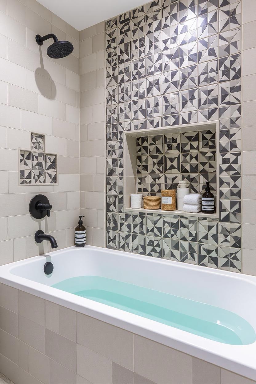 Carve out niches in your shower or above the bathtub to store bath essentials. Finish them with decorative tiles for a beautiful and functional detail.