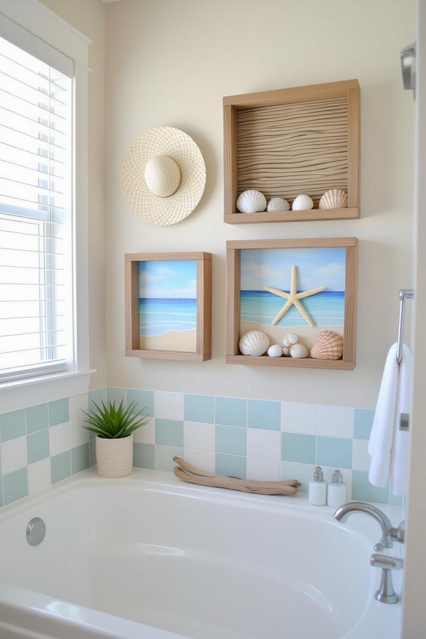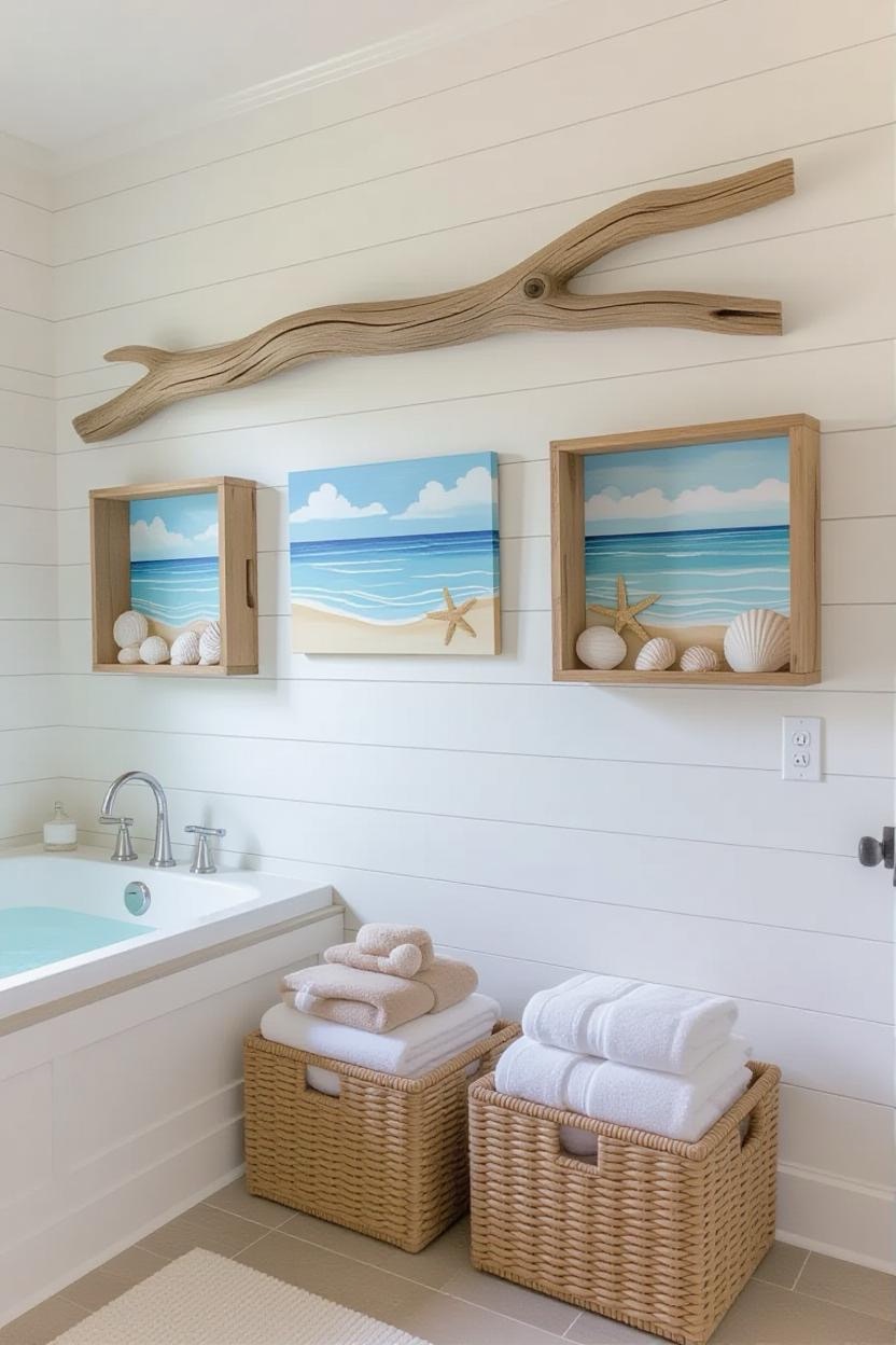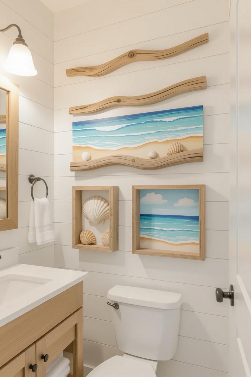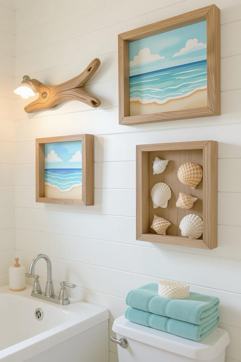 Bring beachy charm with coastal elements like driftwood art, seashell shadow boxes, or watercolor ocean scenes. Perfect for a light and airy feel.