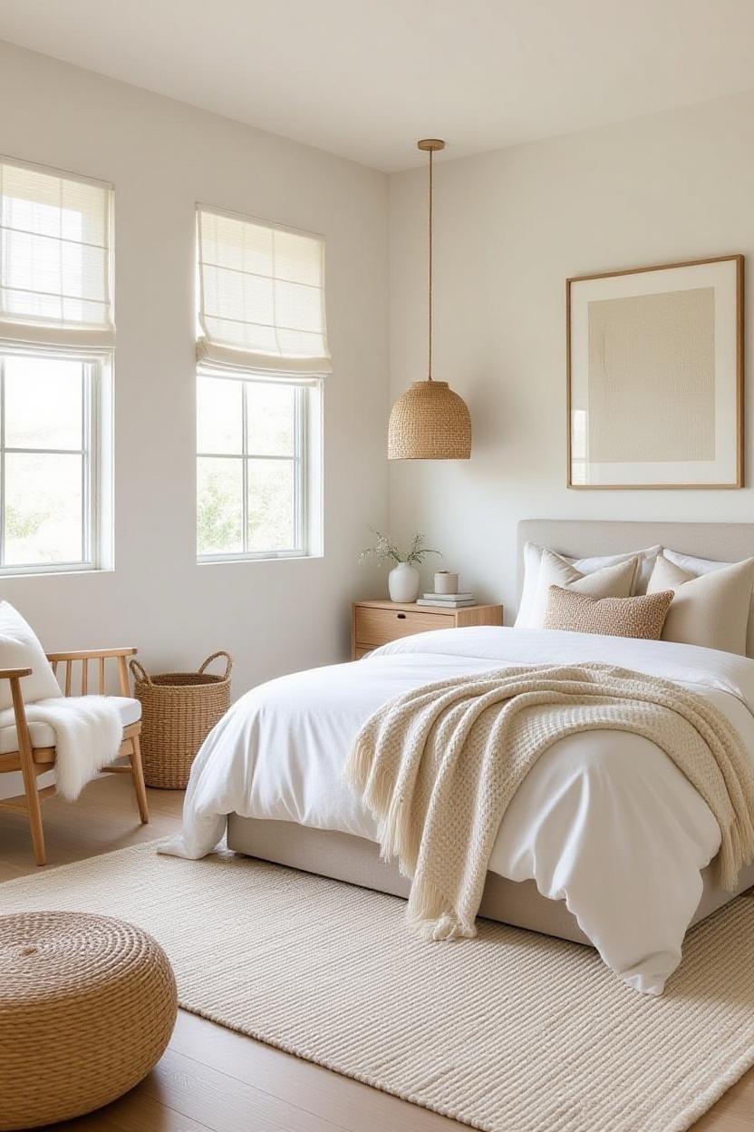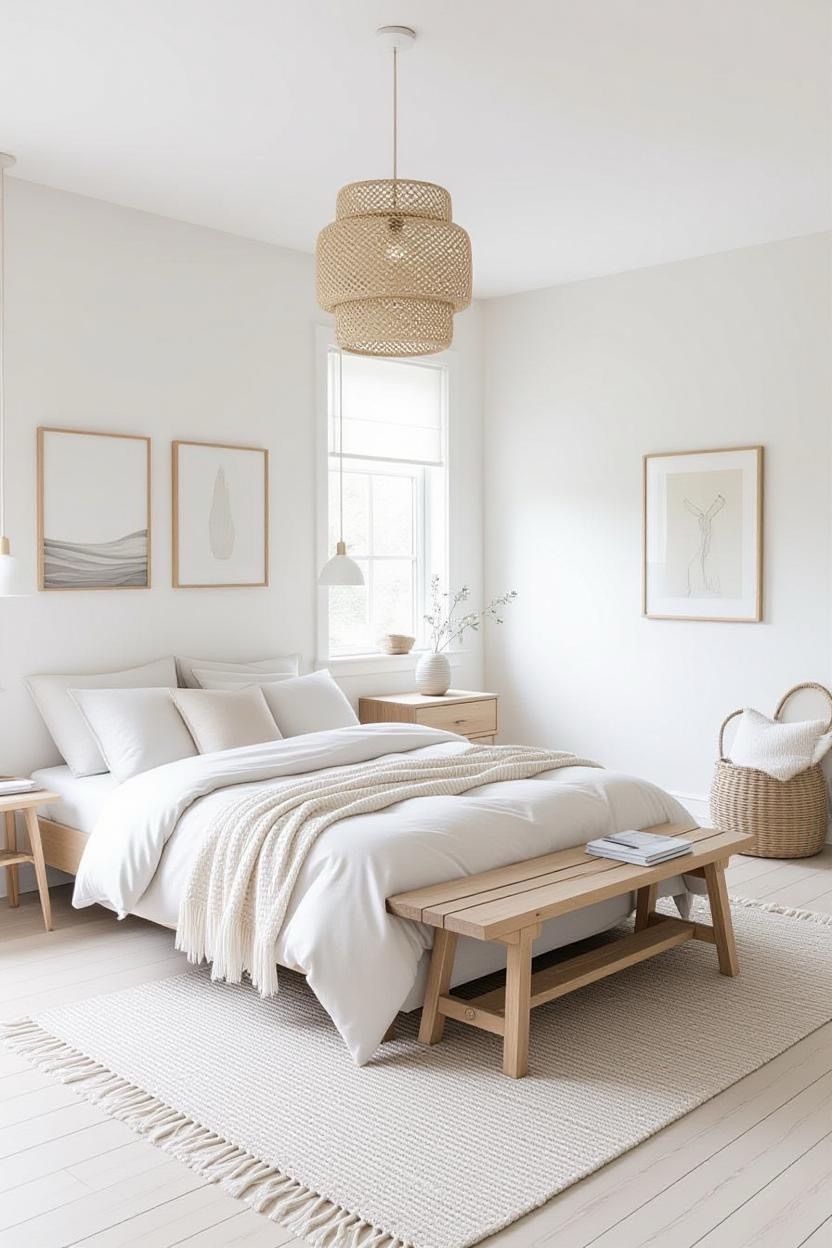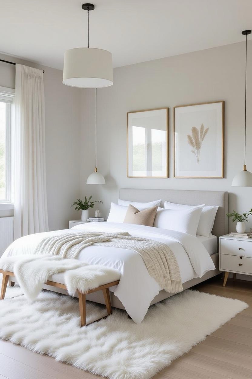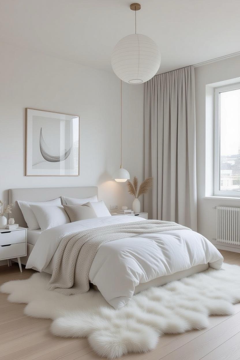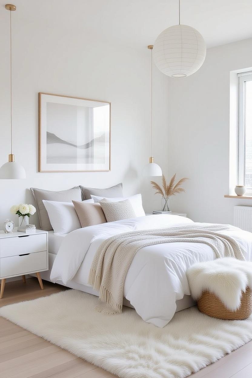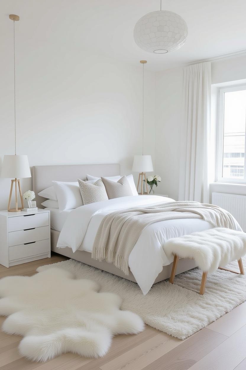 A pure white color palette creates a calming environment, perfect for unwinding after a long day. Pair it with clean-lined furniture and soft textures like faux fur rugs or linen bedding to add depth without clutter.