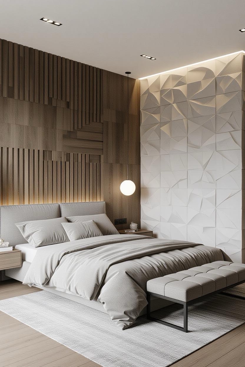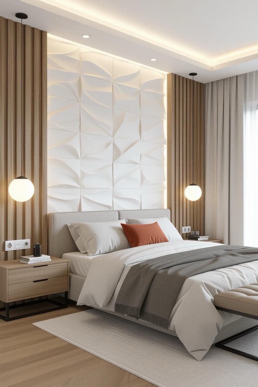 Add a wow factor by incorporating a textured feature wall. Materials like wood slats, stone, or 3D panels bring dimension and make your bedroom feel polished and modern.