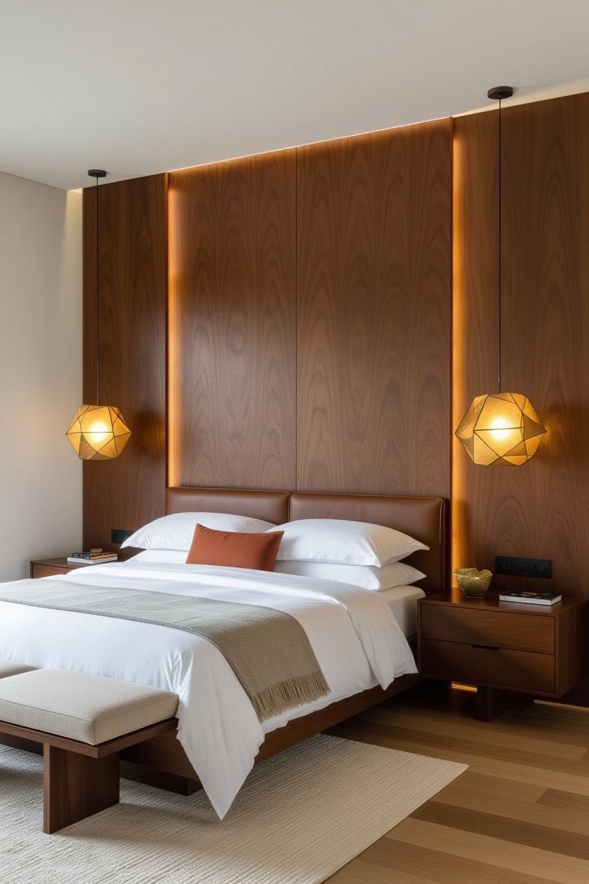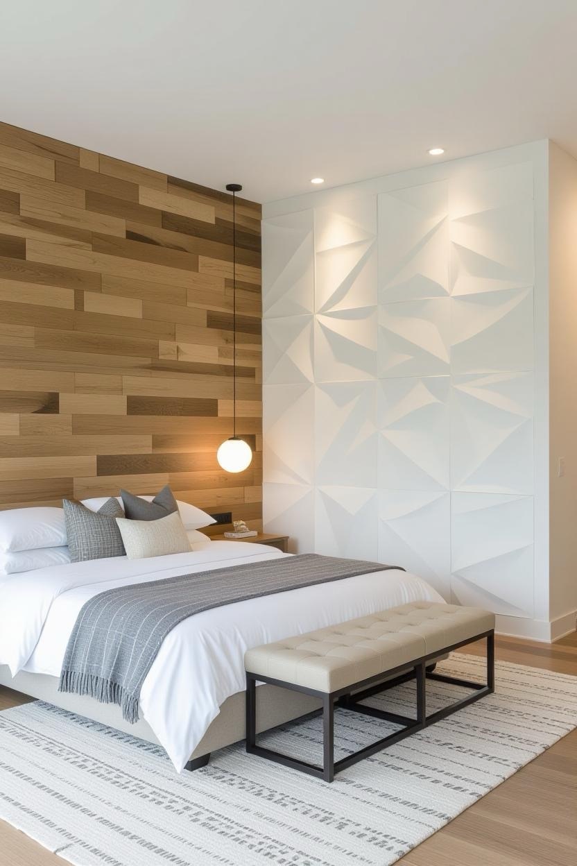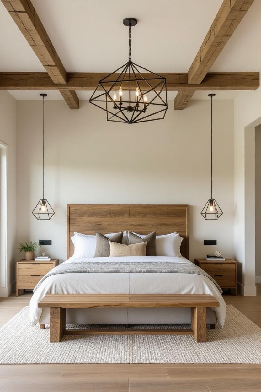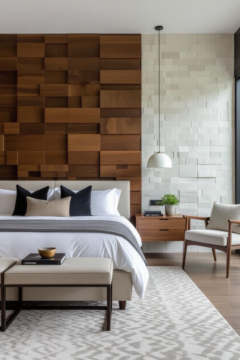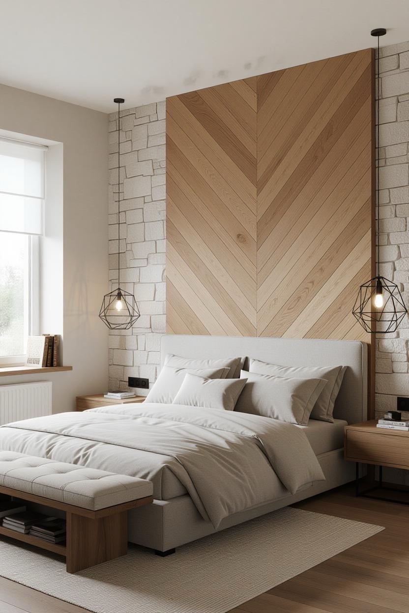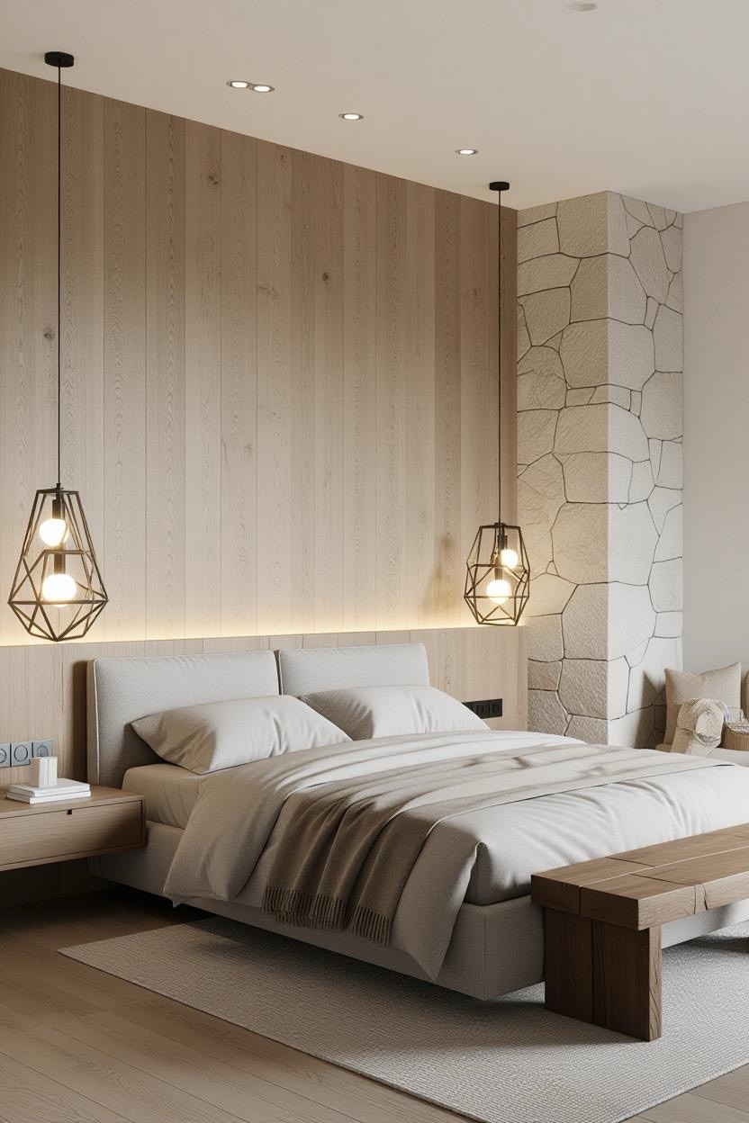 Blend organic elements like wood and stone with modern lines. A wooden headboard paired with geometric lighting fixtures strikes the perfect balance.