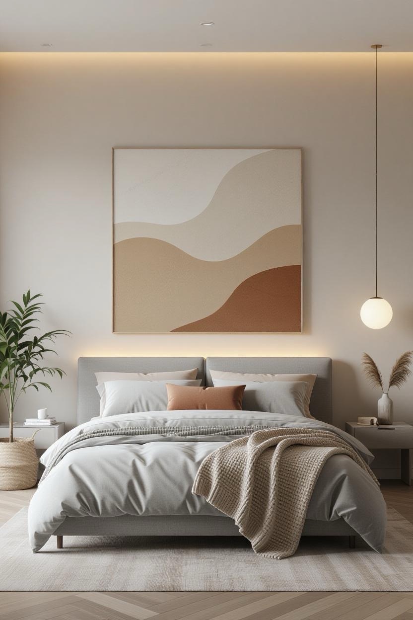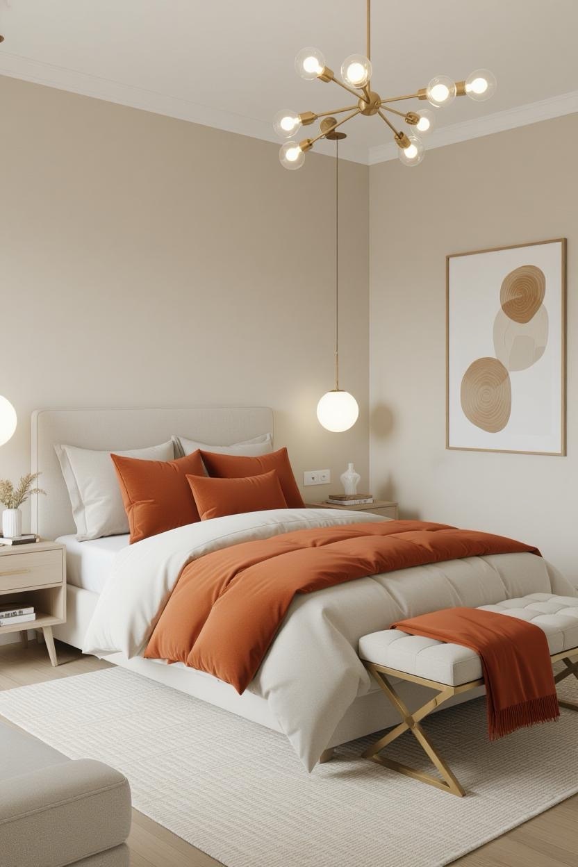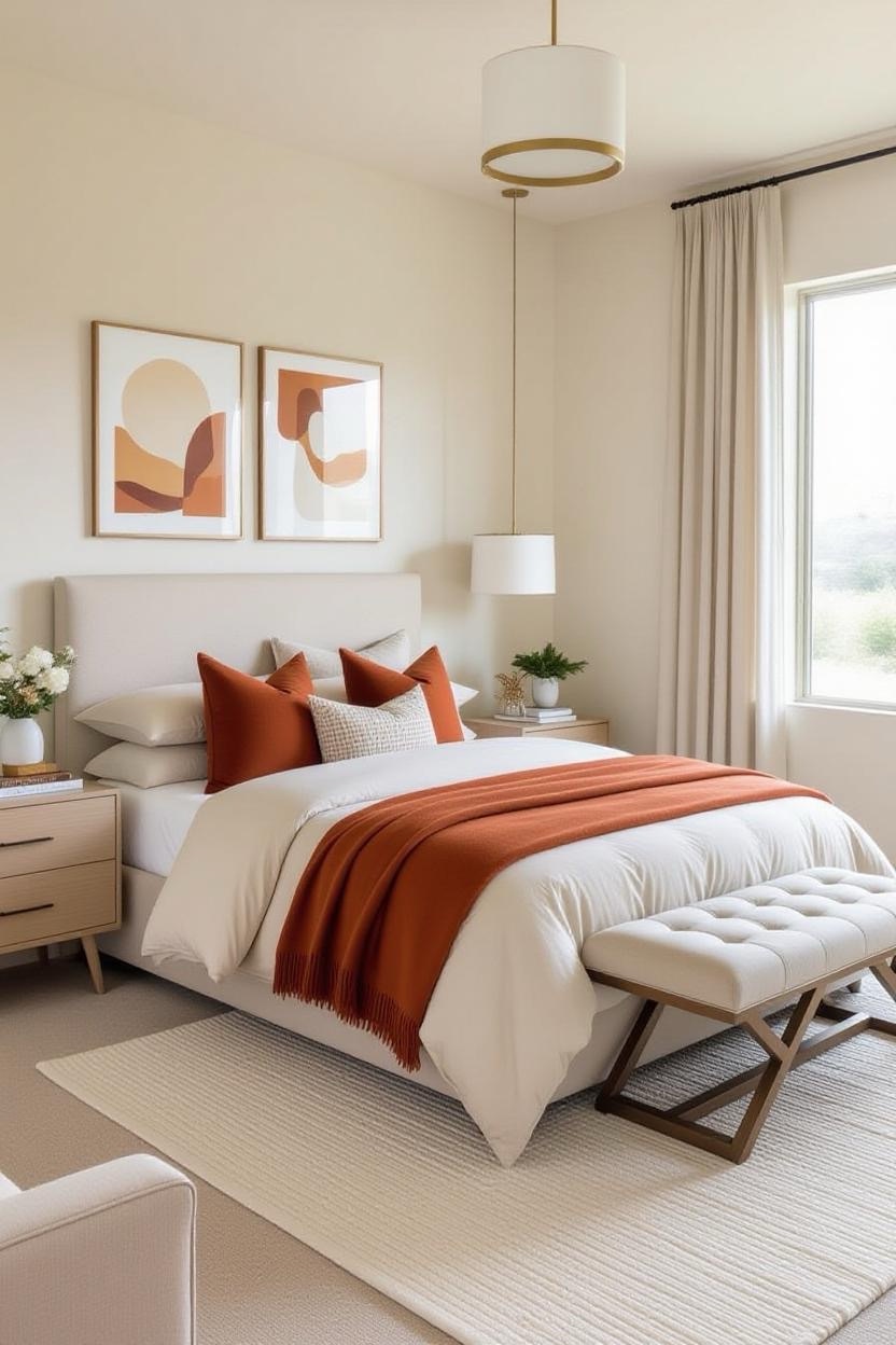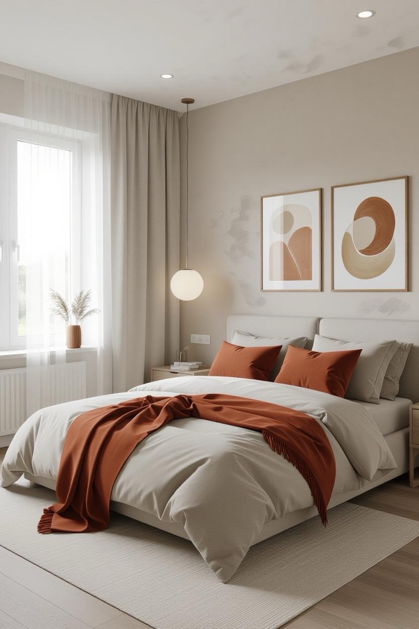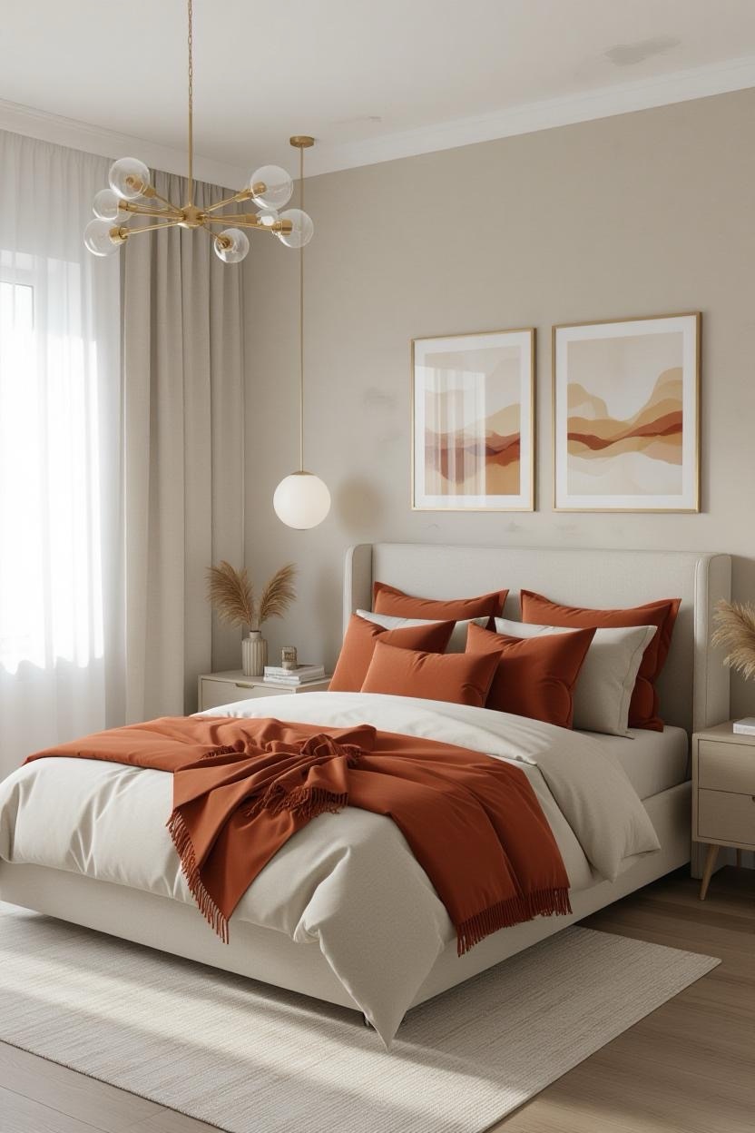 Beige, taupe, and cream tones set the foundation of a modern bedroom, while warm accents like rust pillows or caramel throws create cozy sophistication.