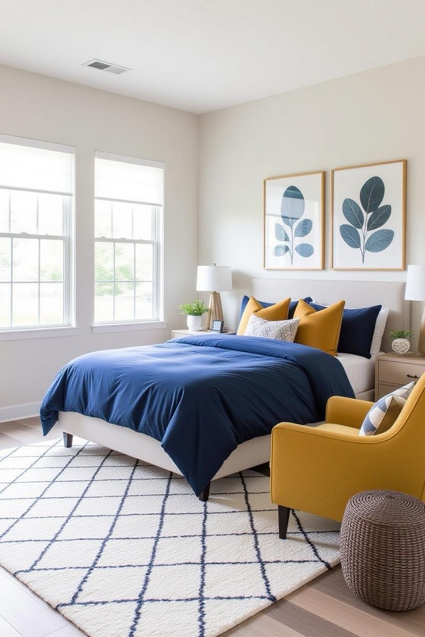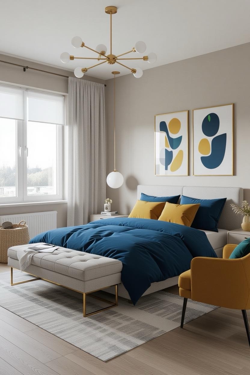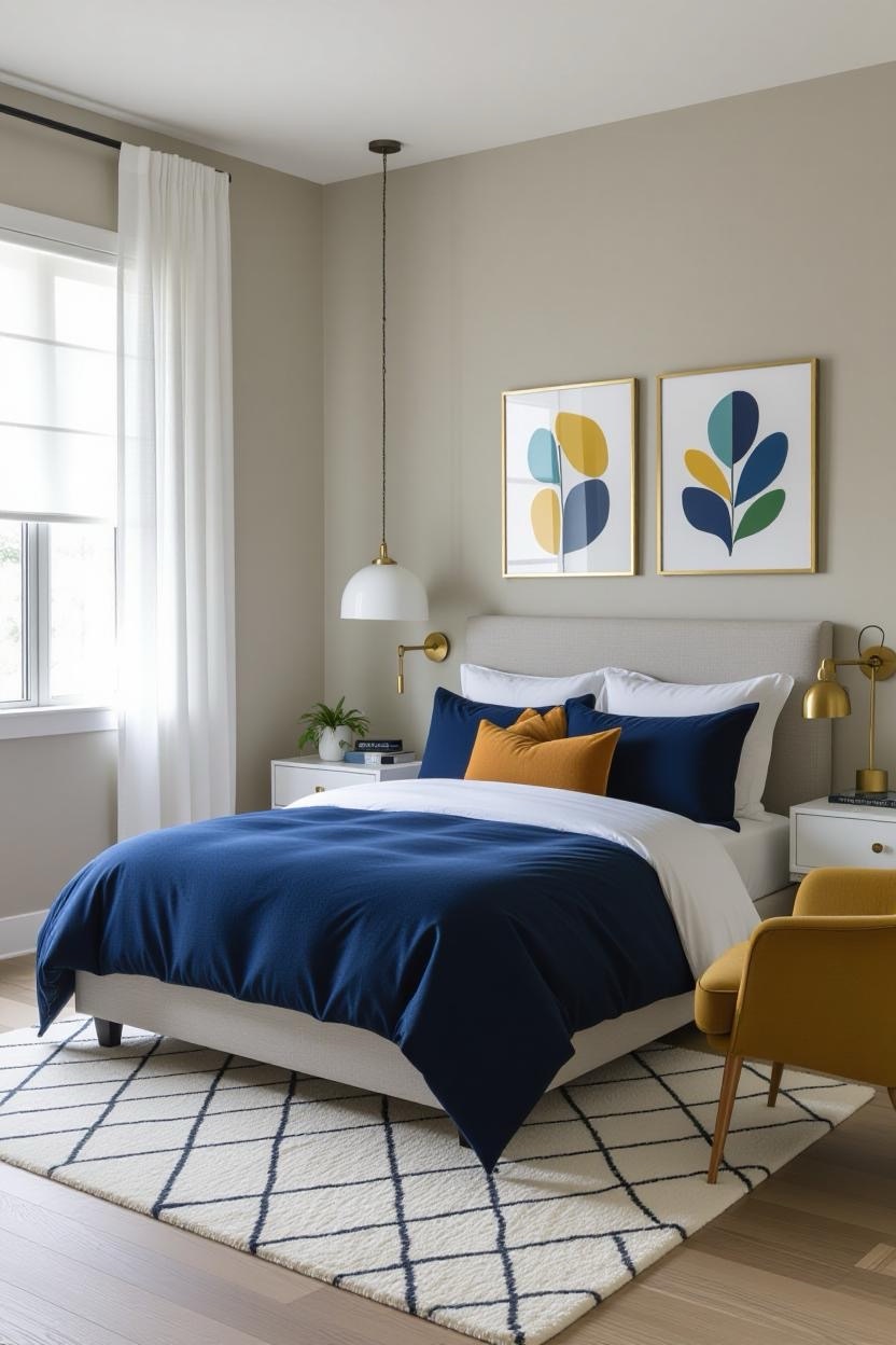 Add vibrancy to a neutral palette with bold pops of navy, emerald, or mustard. Incorporating these through bedding or statement chairs keeps the room fresh and energetic.