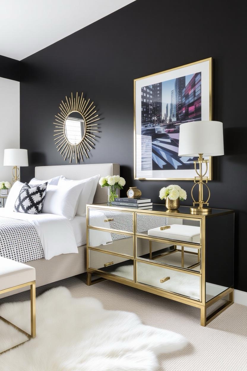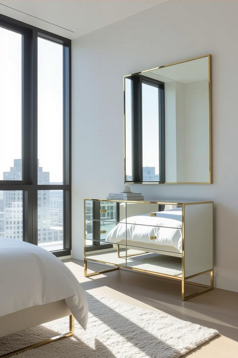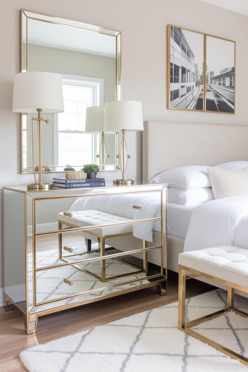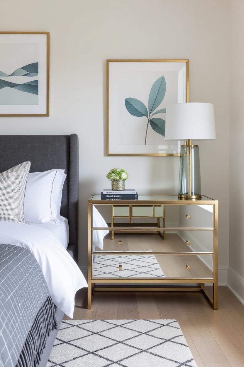 Mix glass surfaces with metallic finishes like brass or chrome for a polished modern edge. A mirrored dresser or metal-frame side table can instantly elevate the room.